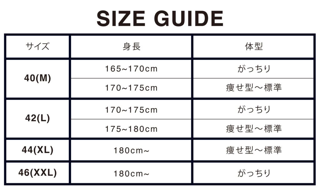 ※あくまで目安となっております。骨格や体型によりサイズが合わないこともありますのでご了承ください。