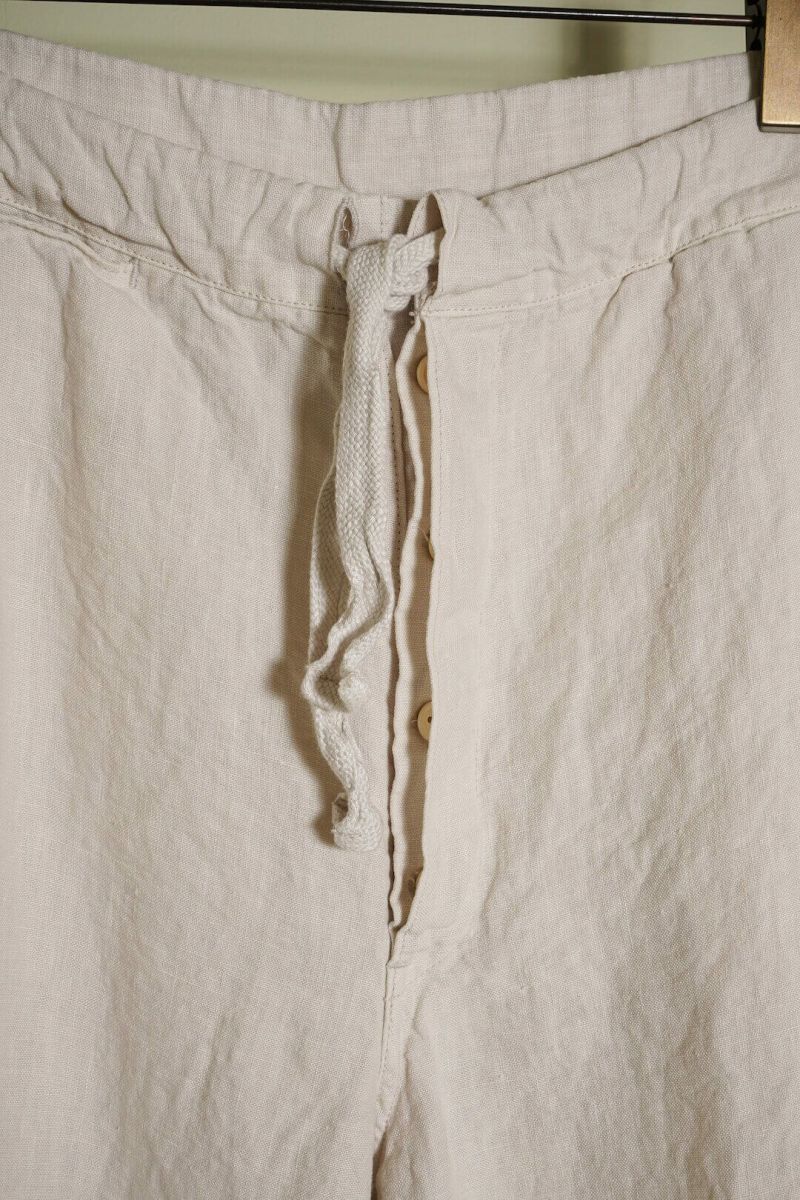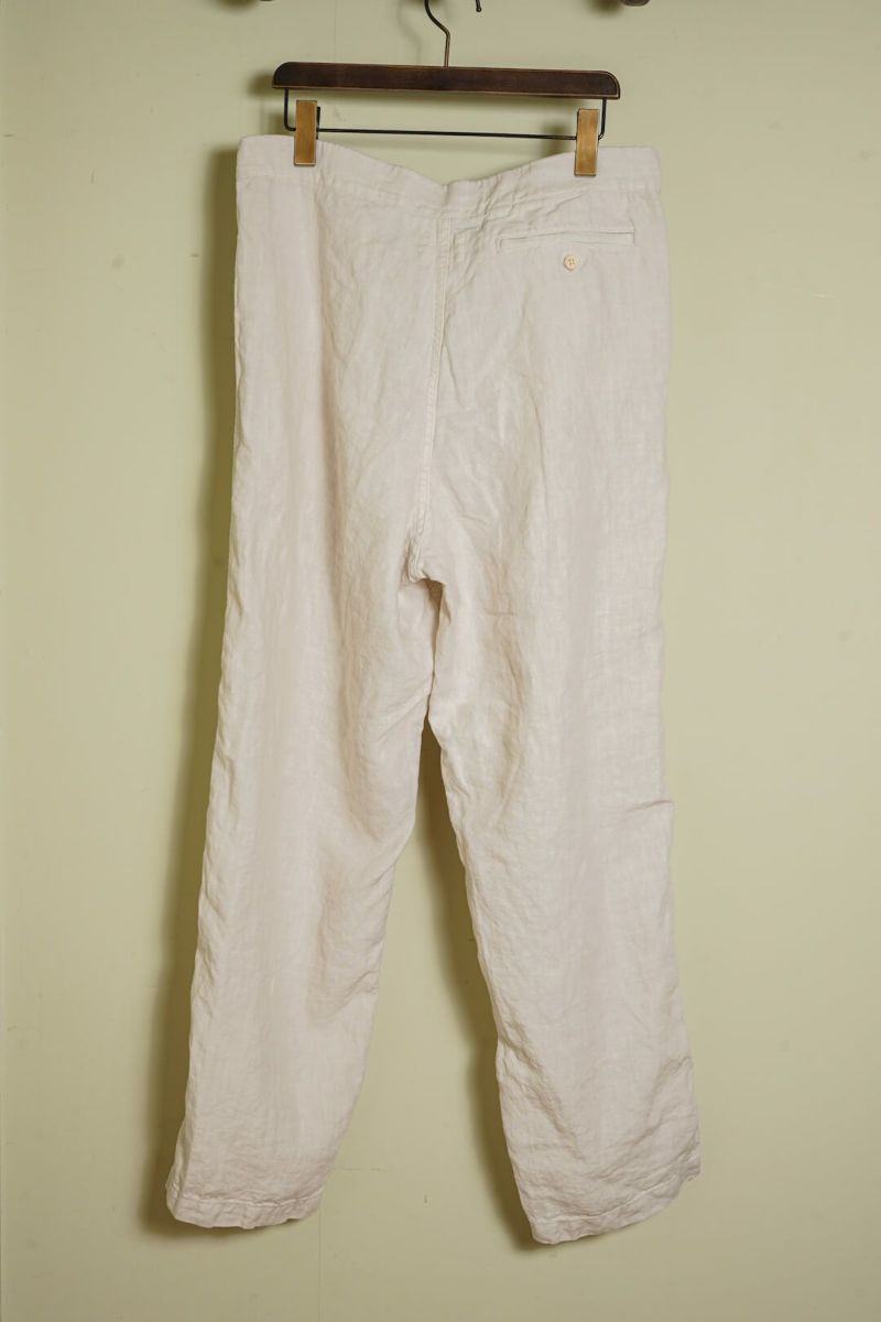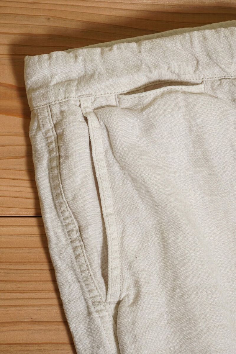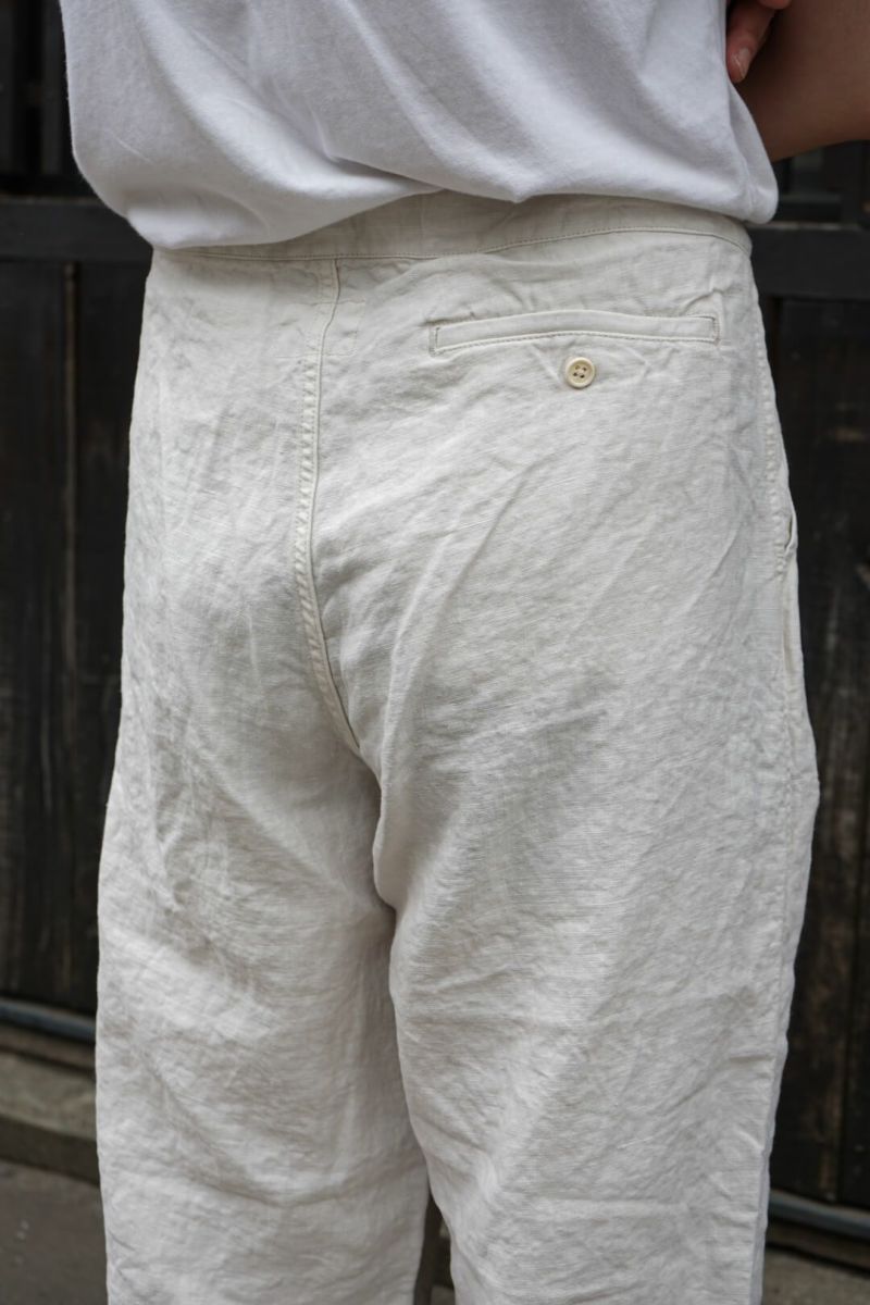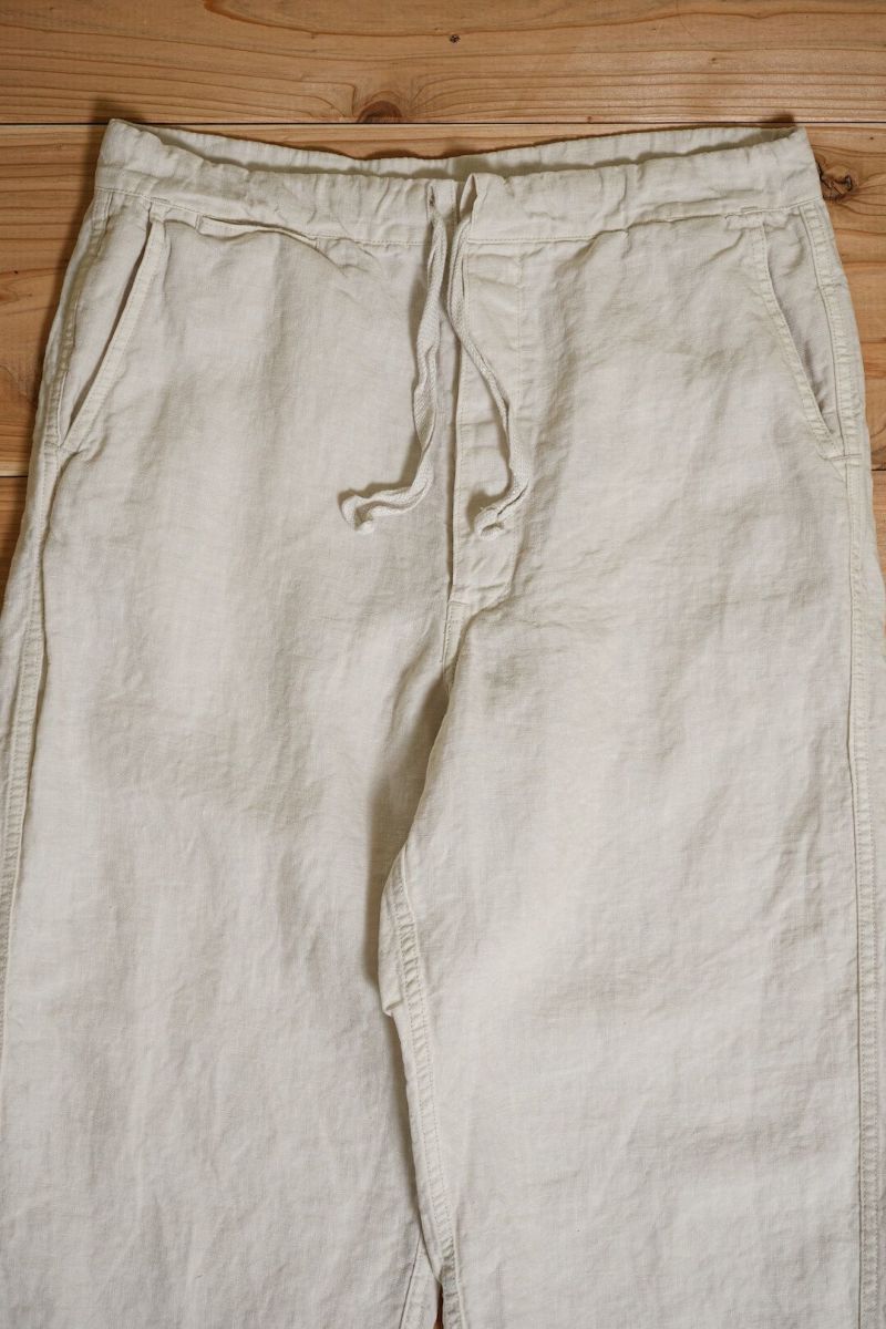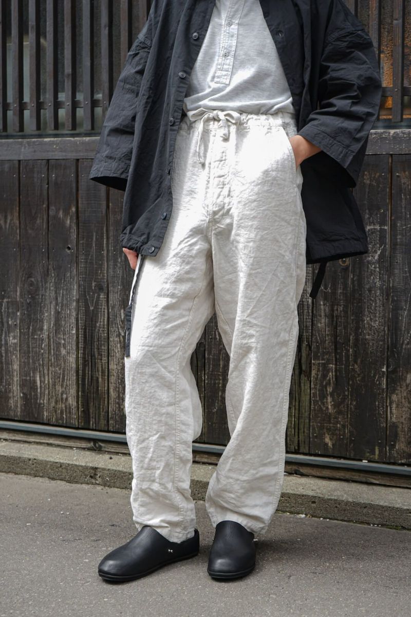 長い年月を経て変化したリネン生地の色合い、風合いを忠実に再現することに着目した「Discoloration = 変色」シリーズのイージーワークパンツ。