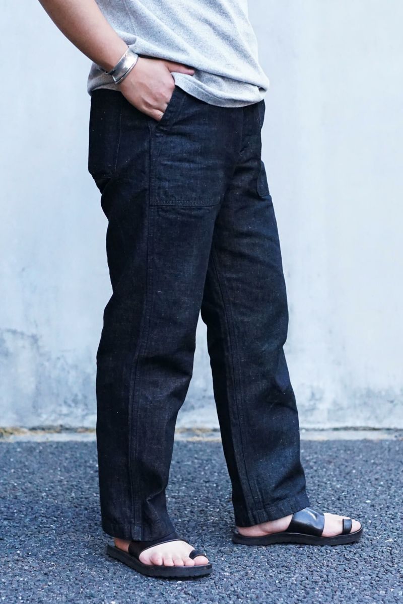 生地は、縦糸にコットン100%のロープ染色糸、緯糸にヘンプ100%を打ち込んだものを使用。緯糸にヘンプを打ち込むという非常にリスクの高い作業を経て織られた特別な生地は、ヴィンテージのワークパンツやカバーオールに近い生地感と雰囲気があります。