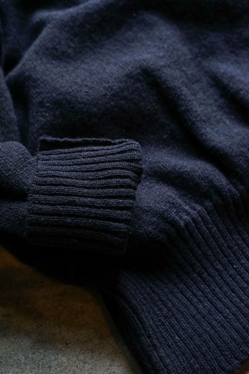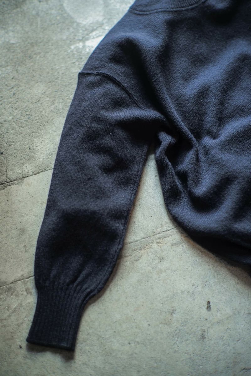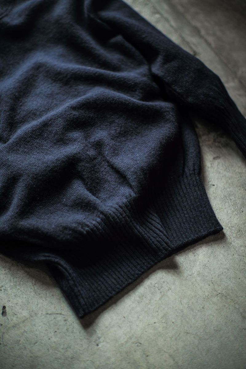 さらに編地に仕立てた段階で縮絨加工を施すことで、編地の凹凸感や密度を上げ、ヴィンテージ特有の雰囲気を現代の技術で再現しました。襟、袖口、裾口のリブは、現代では多用されている形状記憶のモール糸を使わずに、天然繊維であるウールのみでフィット感を構築しています。