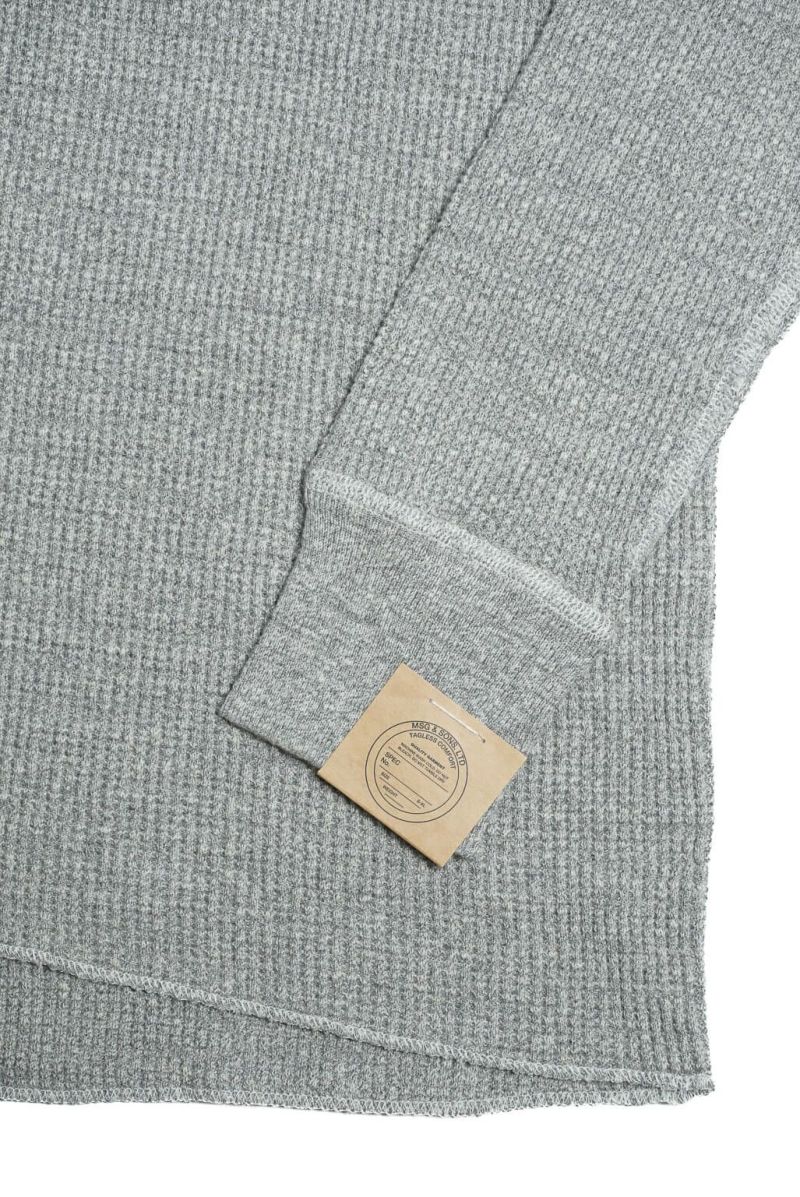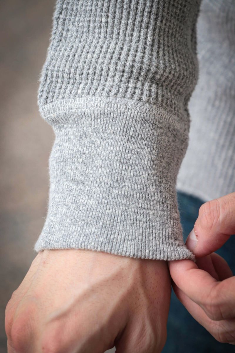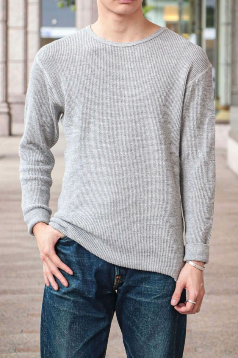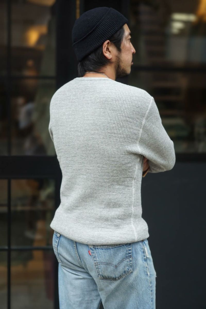 今回、米綿を用いた “88/12” 糸をゼロからオリジナルで開発。トライ&エラーを繰り返しながら約3年の歳月を経て、ようやく理想とする糸が完成し製作に至りました。サーマルの組織やシルエット、リブの仕様はアメリカ製のヴィンテージをベースにアップデートを施し、アンダーウェアとしてはもちろん、1枚でも着用できるサーマルシャツとなっています。