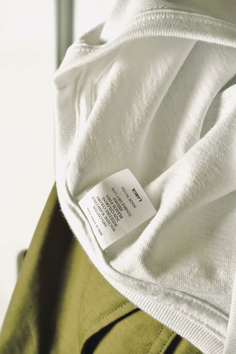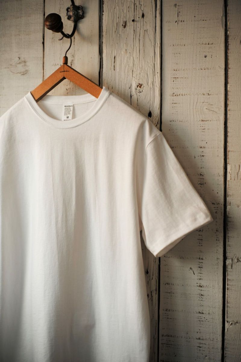 パターン、紙タグのネーム、生地、縫製、全てを「アメリカ製」で仕上げた究極の白Tシャツです。素材は、ノースカロライナ州の広大な土地で生産されたコットンを原料にアメリカで編み立てられた 12.6oz の天竺生地。タフで粗野感ある風合い豊かな生地は、糸の整理加工を省き、効率的でシンプルな物づくりを重視するアメリカ的な文化があって生まれた物です。糸をきれいに仕上げる技術に優れた日本ではお目にかかれない「アメリカらしさ」が強く表れた生地と言えます。