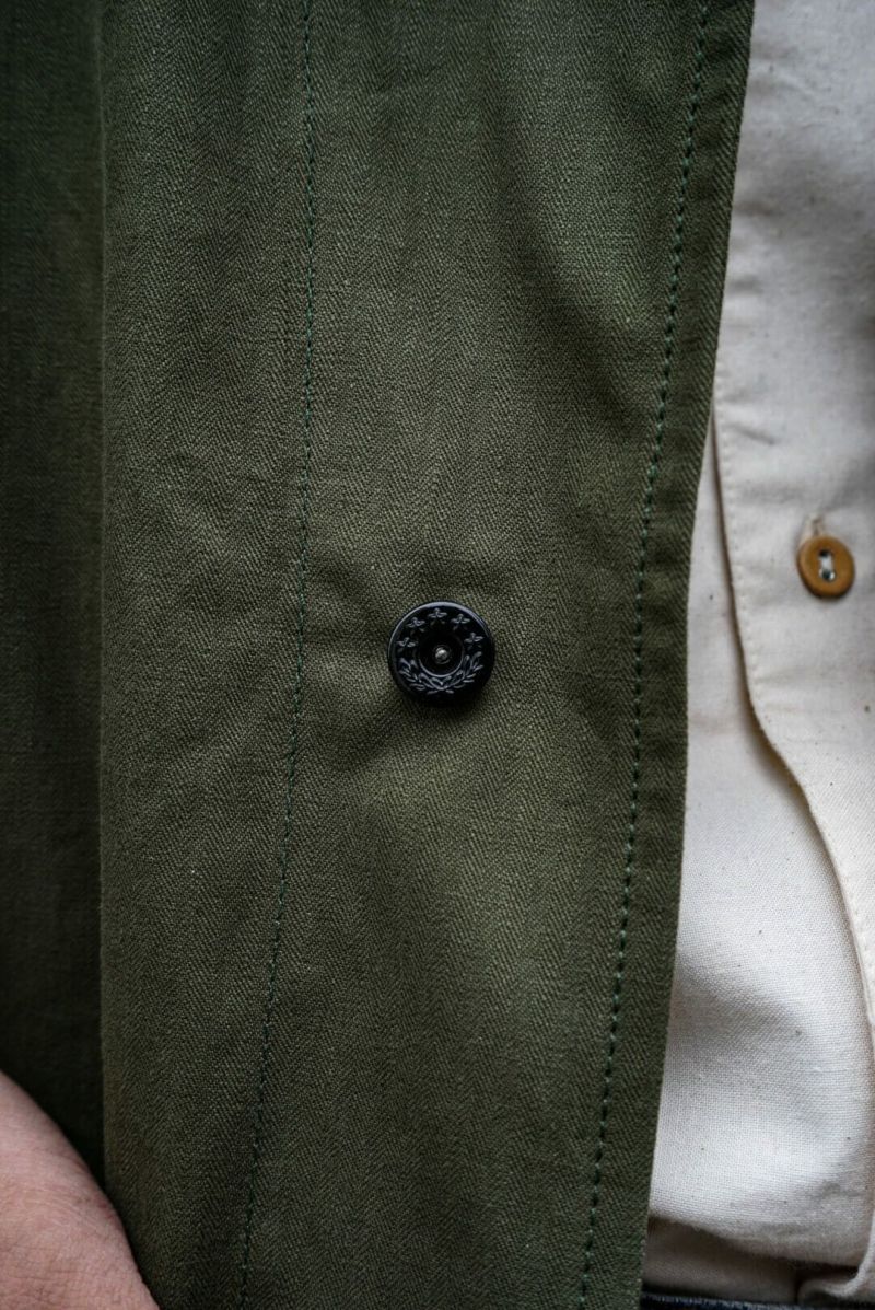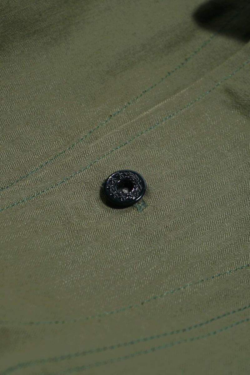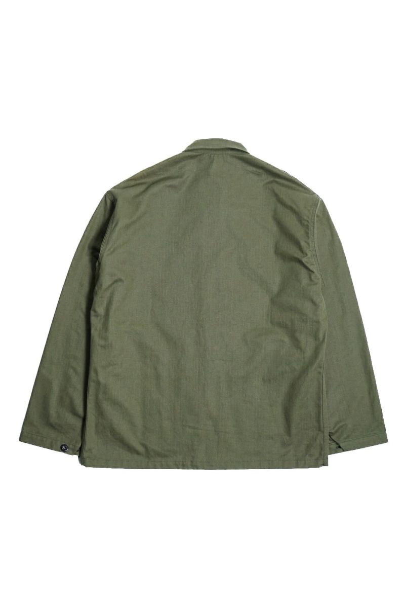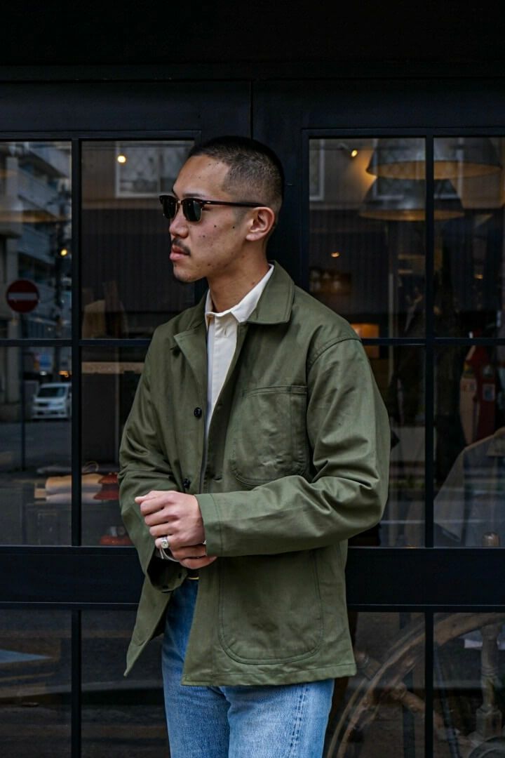 MSG & SONS(エムエスジーアンドサンズ) 1940年代、第二次世界大戦期にUS NAVYへ支給されていたN-3 UTILITY JACKETをデザインソースに製作された1着。 このジャケット最大の特徴は、あらゆるミリタリーアイテムの中で最もパターン数が少なく、とにかく無駄のないアイテムであるということ。パターン数が6枚で形成され、なによりも量産の効率性を考えられています。背中のはぎが無く、袖は一枚袖。現代で考えると、贅沢に製作された仕様です。 生地については、この年代のミリタリーアイテムを代表するヘリンボーンツイルで当時のオリジナルに合わせた染色工程を見い出し、生地カラー(デットストック品)を忠実に再現。黒塗装されたドーナツ型の月桂樹が刻印されたタック釦は、当時と同じように型取りを行い、鉄製と同じ素材で製作しています。 アメリカらしい、当時のクラシックなユニフォームを、これからの時代にむけて再構築されたアイテム。時代背景の意味や意義を大切に考え、文化や歴史を紐解いて製作されています。 <素材> COTTON 100% <生産国> MADE IN USA 商品についてのブログはこちら MSG & SONS / N-3 JACKET - MADE IN USA PRICE : ¥69,300(税込み) 品番 : 921201