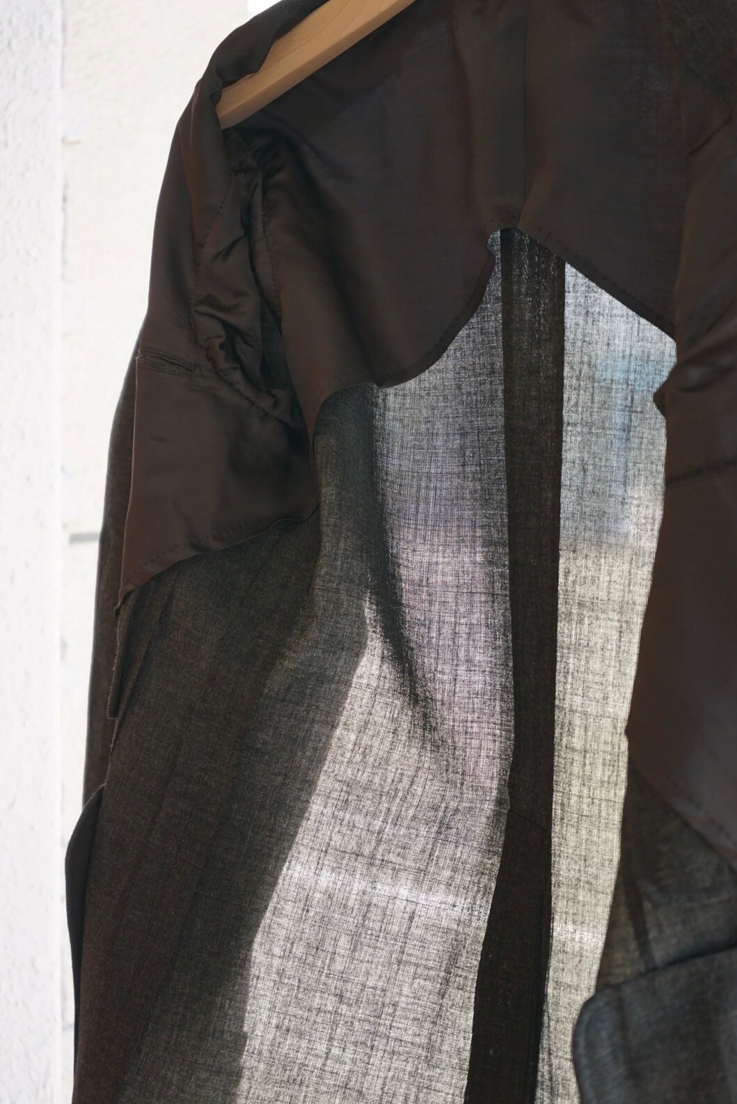 裏地は背抜きの仕様となっており、通気性の良いFOX AIRと相まって、高温多湿な日本の夏でも快適な着心地を実現します。ハリがある生地感なので、仕立て映えもとても良く、軽い着心地ながら重厚感のある雰囲気に仕上がりました。