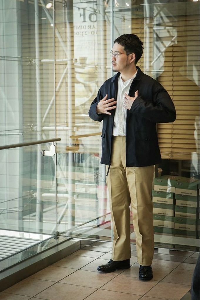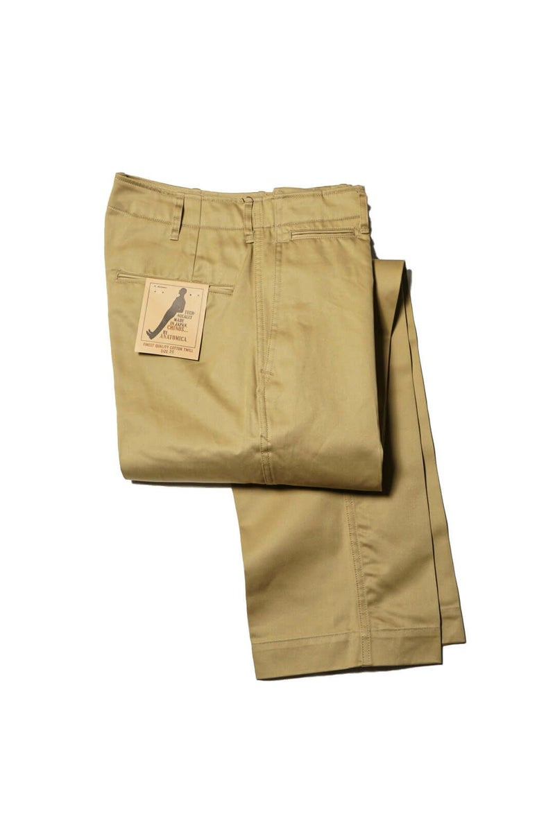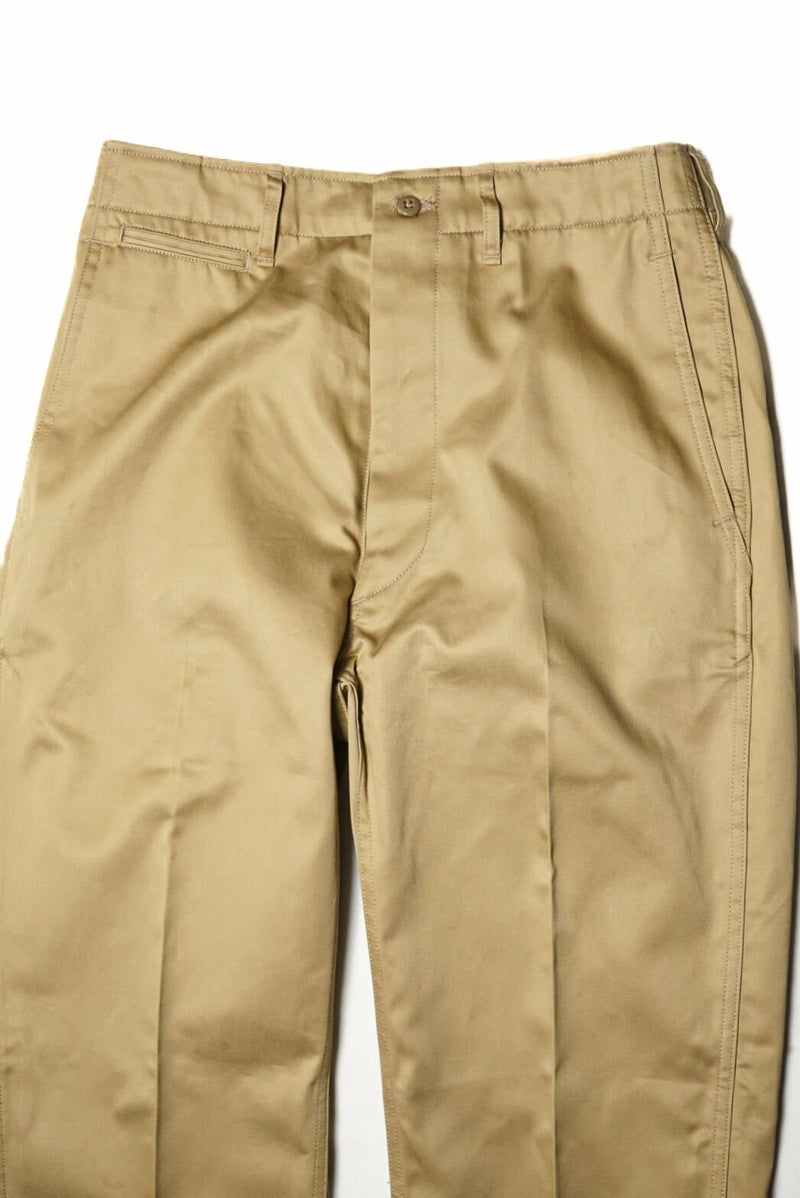 シルエットは1960年代、ディテールは1940年代にアメリカ軍に支給されていたチノトラウザースがベースとなったシルエットが綺麗な一本。高密度でコシがあり、光沢感のある上質なオリジナルチノクロスを使用。フロントはボタンフライ。