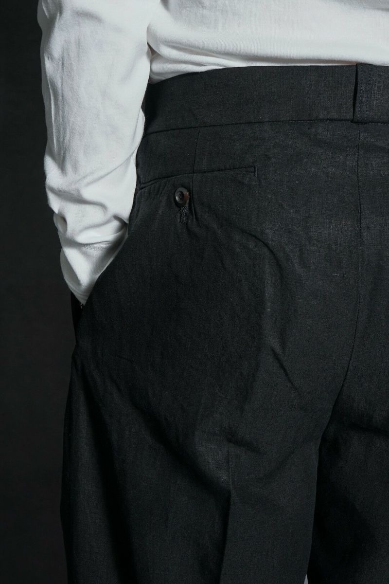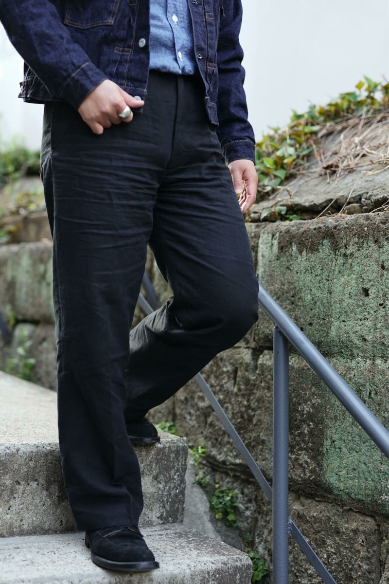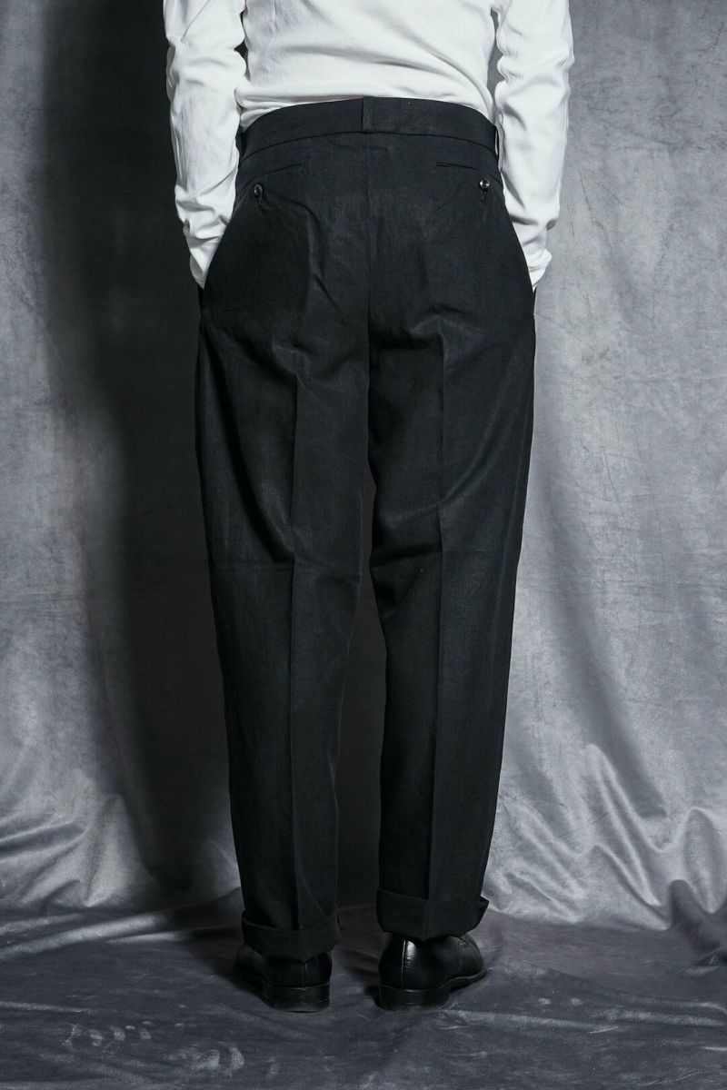 1915年にフランス軍へ支給されていたミリタリートラウザーズのフィット感、ディテールを参考に製作したトラウザーズ。ゆとりのあるフィット感でありながら、ハリ感のある生地と相まって綺麗なシルエットを描く一本です。