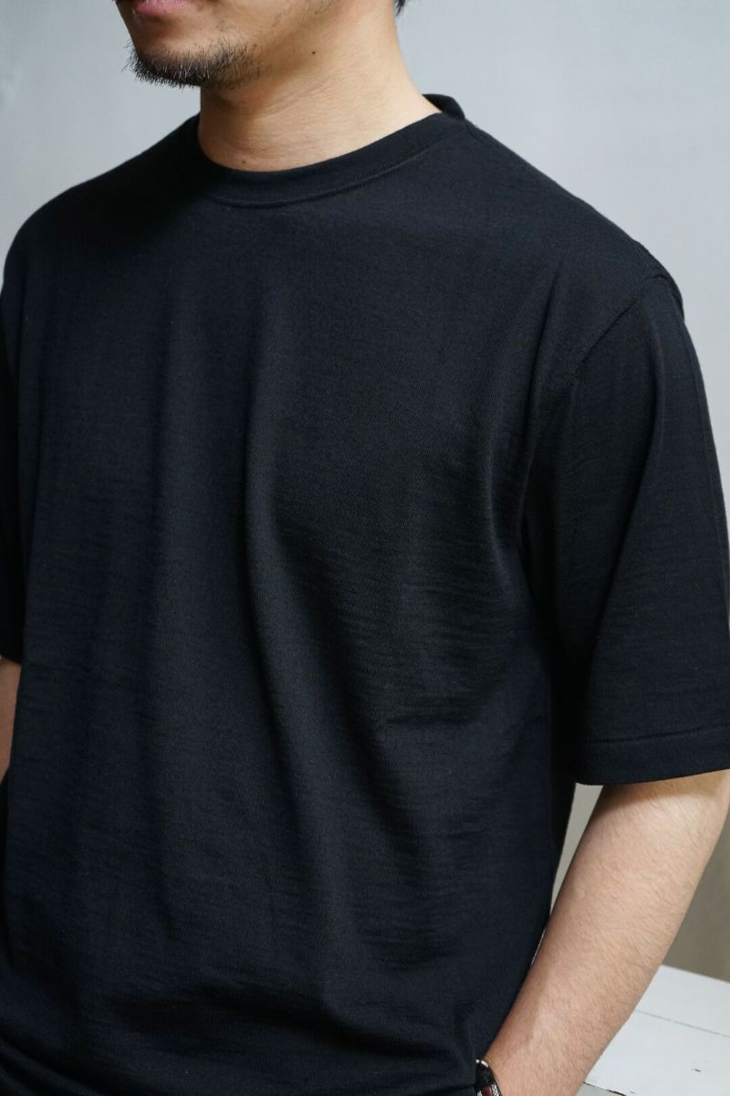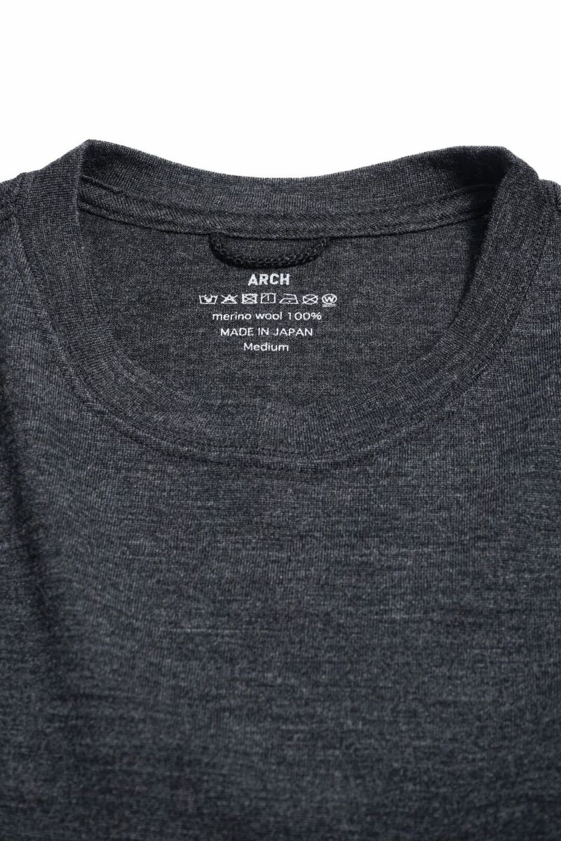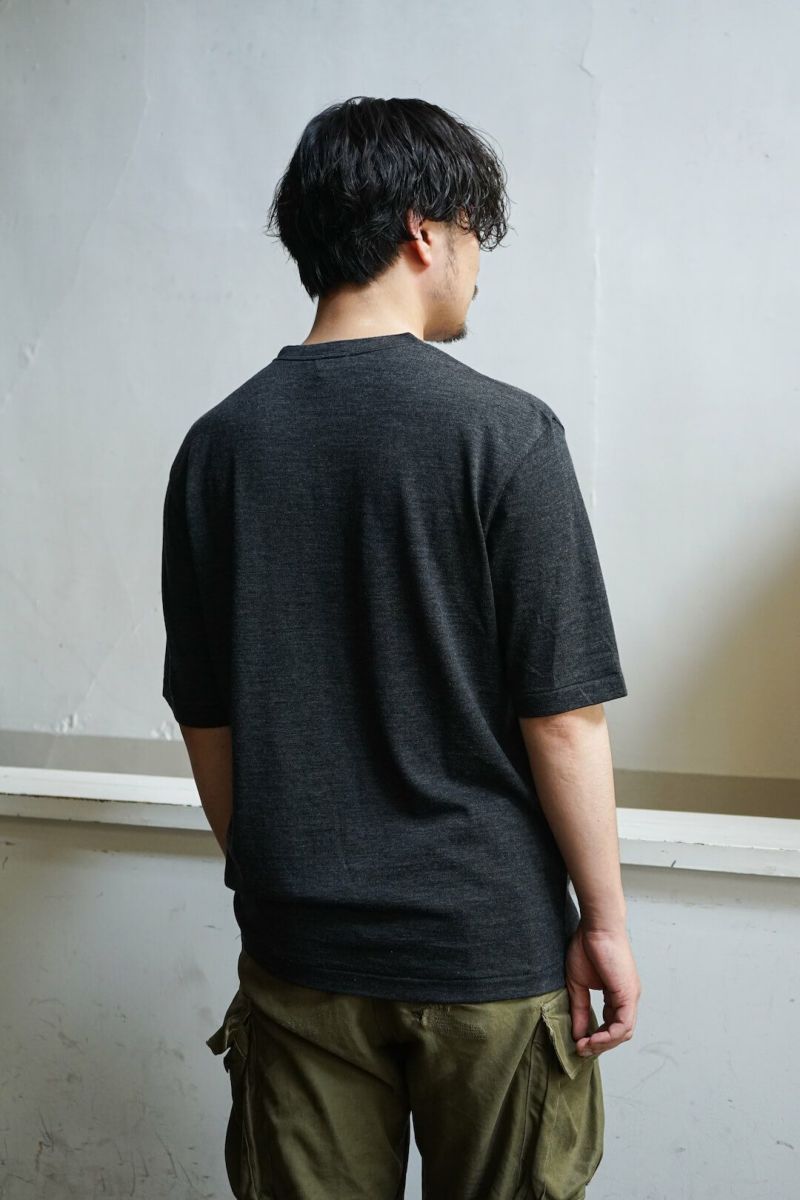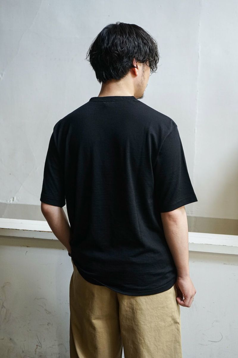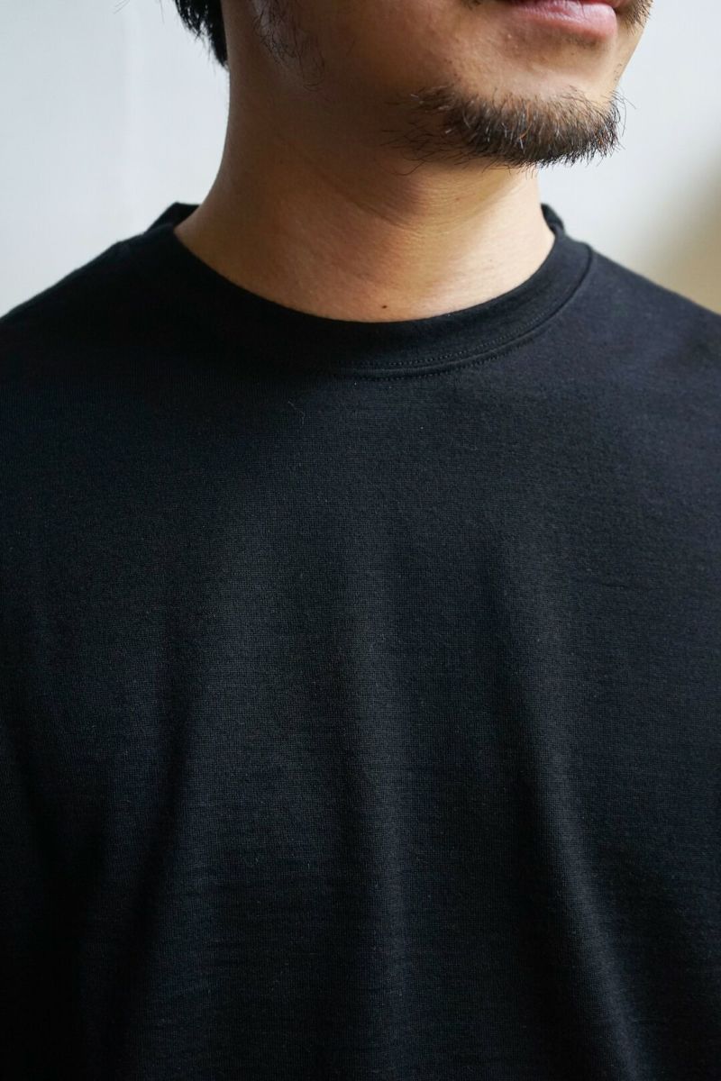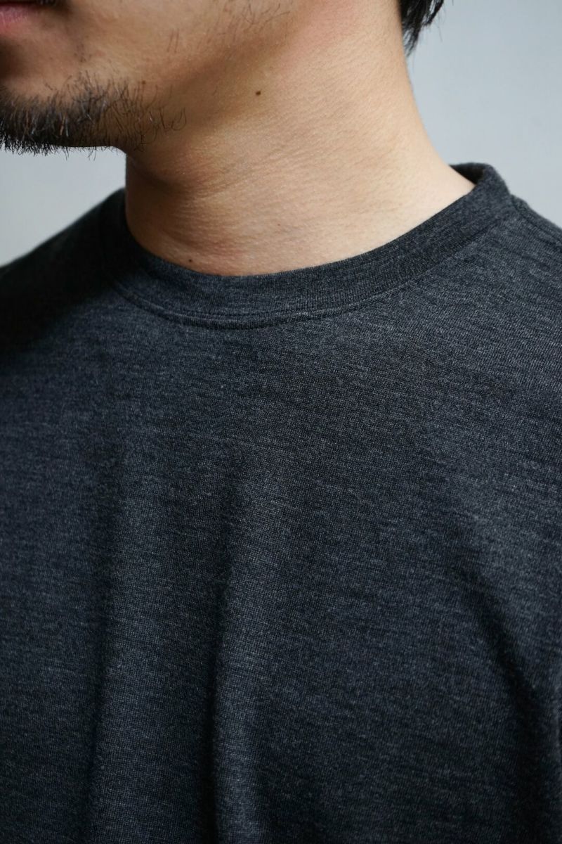 しかし、アウトドアブランドが展開しているメリノウールウェアは、あくまで肌着であるためタイトな物が多く、街着として一枚で着用するには不適。そこで、企画製作したのが「一枚で着れる」メリノウールのTEEシャツです。身幅はゆったりとさせながらも、首周り、袖周りはすっきりさせることで、インナー使いもし易いように考慮したシルエットになっています。