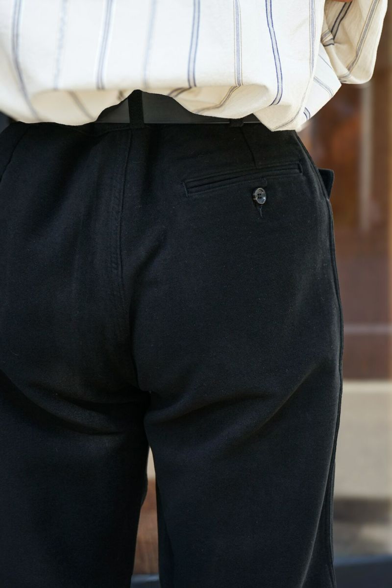 かつてフランスの農夫たちが着用していたワークウェアから着想を得て製作したトラウザーズ。L字型のフロントポケットや、カシメのフックなどが目を惹くディテールとなっています。