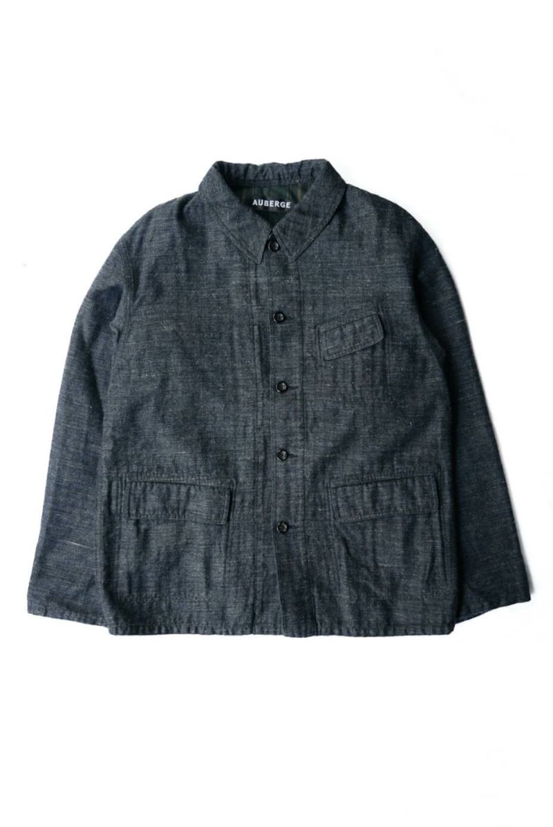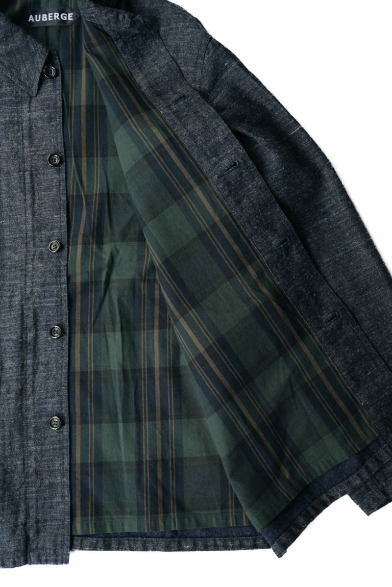経糸にインディゴリネン、緯糸にウールを使用した独特な生地は他に見ない独特なスラブ感や着心地が特徴的です。インディゴの色移りを防ぐために取り付けられる裏地には、ヴィンテージのPASCAL JACKETと呼ばれるワークジャケットをオマージュして限定カラーの裏地が取り付けられております。