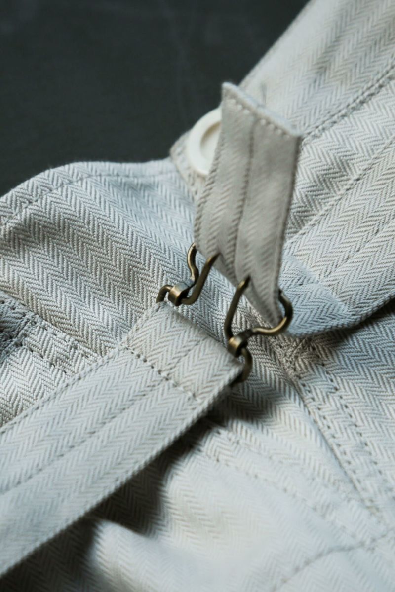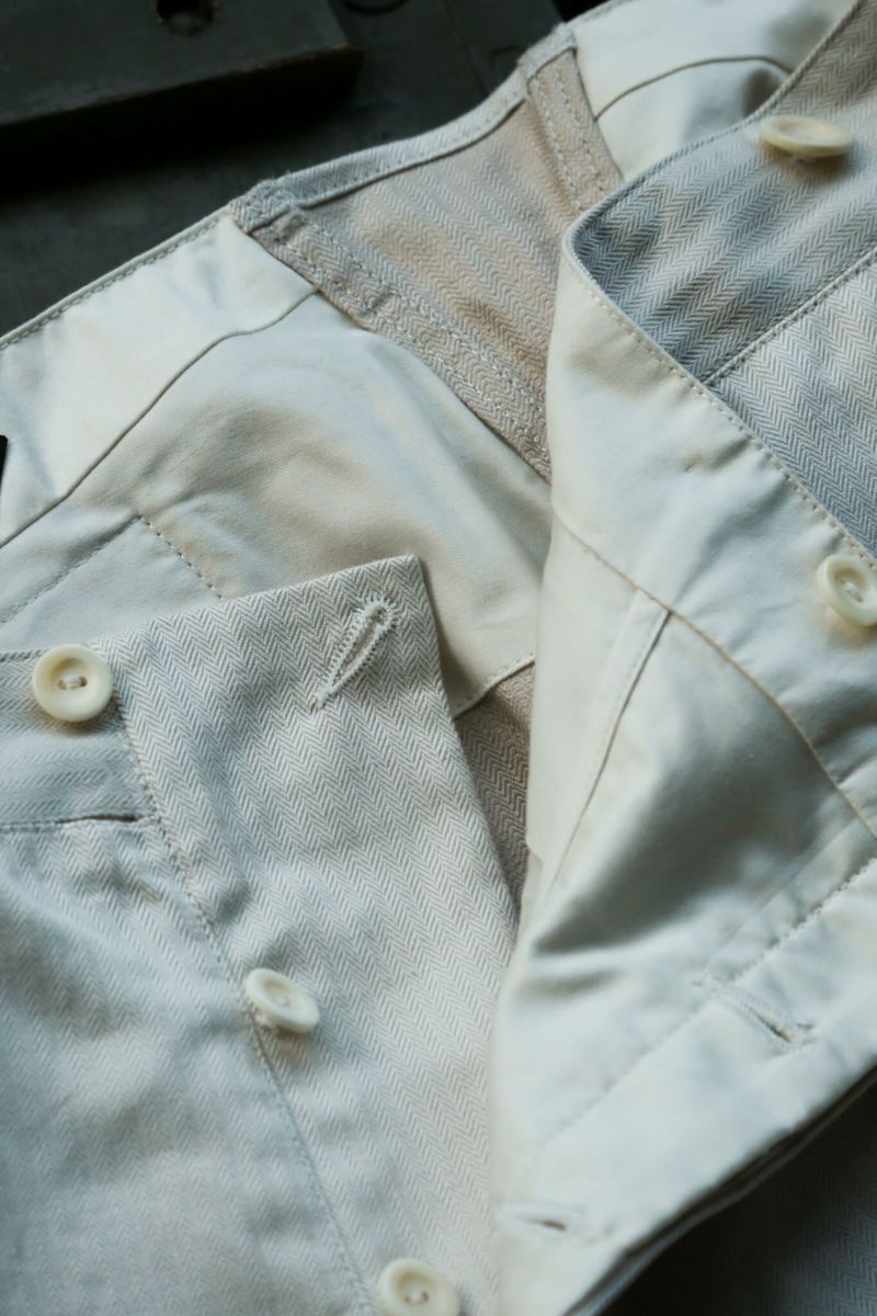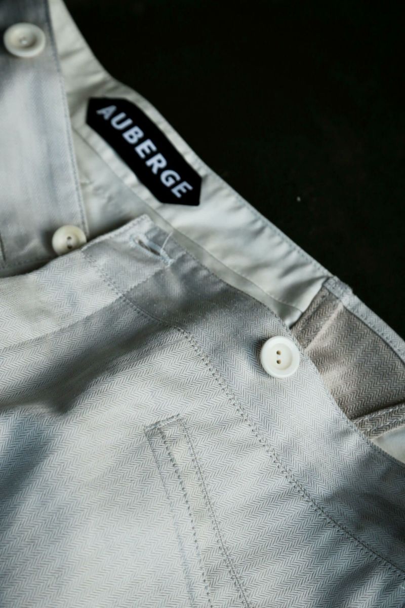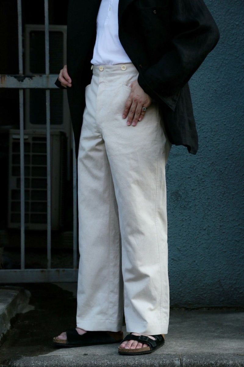 デザインベースはARCHが所有しているブージュロン。数あるブージュロンのディテール・ボタン・シルエットを細かくチェックし製作しました。生地はカリビアンシーアイランドコットンのヘリンボーンを使用。なので夏場はもちろん寒くなってきても穿くことが可能のため、様々なスタイリングを楽しむことができます。