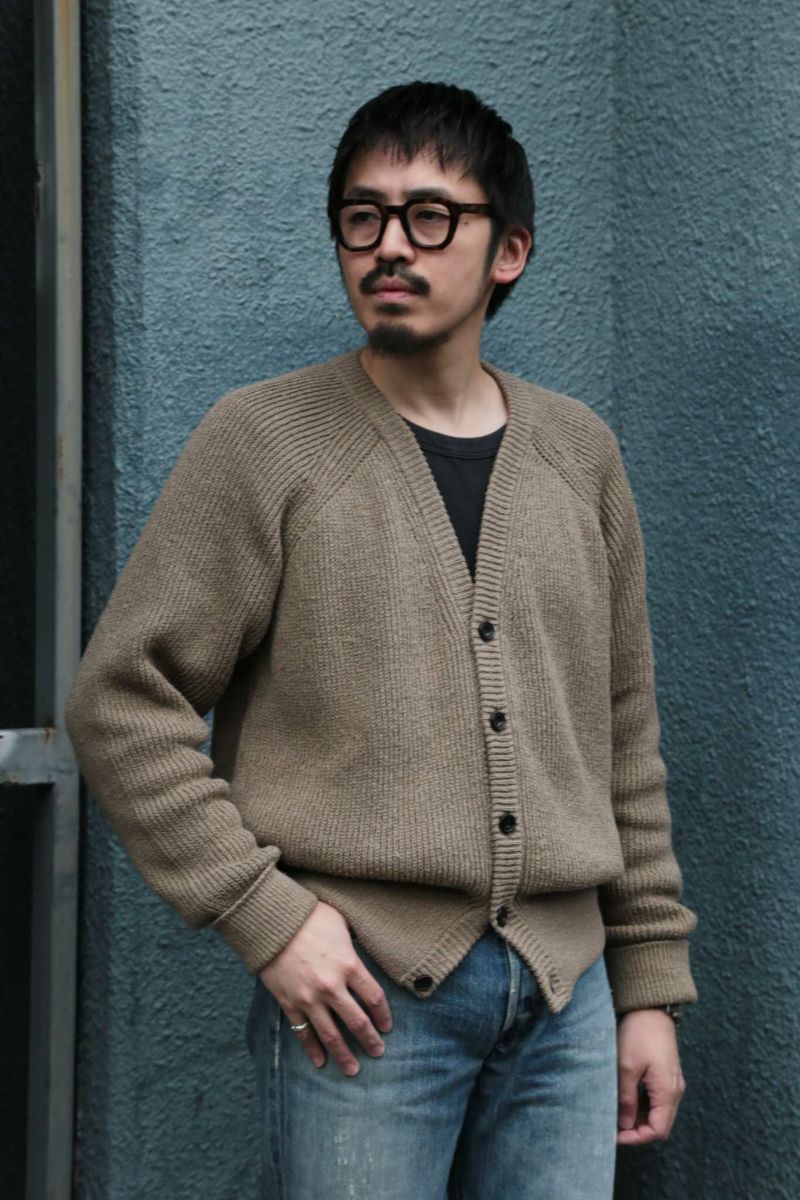 ニット用としては極めて珍しいシルク100%8番のムラ糸を別注し、畔編みにしたカーディガン。しっかりした編地で重量もある畔編みを、シルクで表現することによって軽量化しています。たっぷりの身幅でアウターの様な仕上がりに。ムラ糸シルクならではのマットでガタついた表情は、ヴィンテージアイテムとも良く合います。