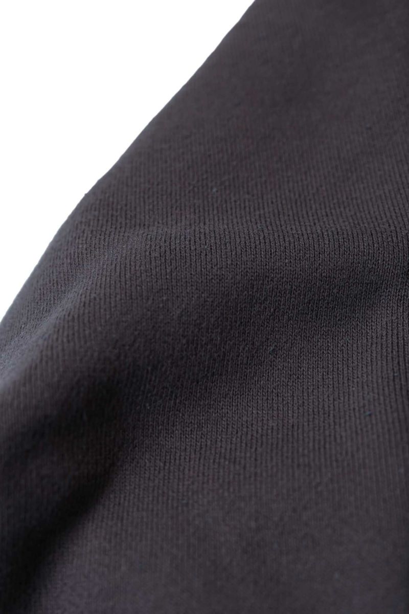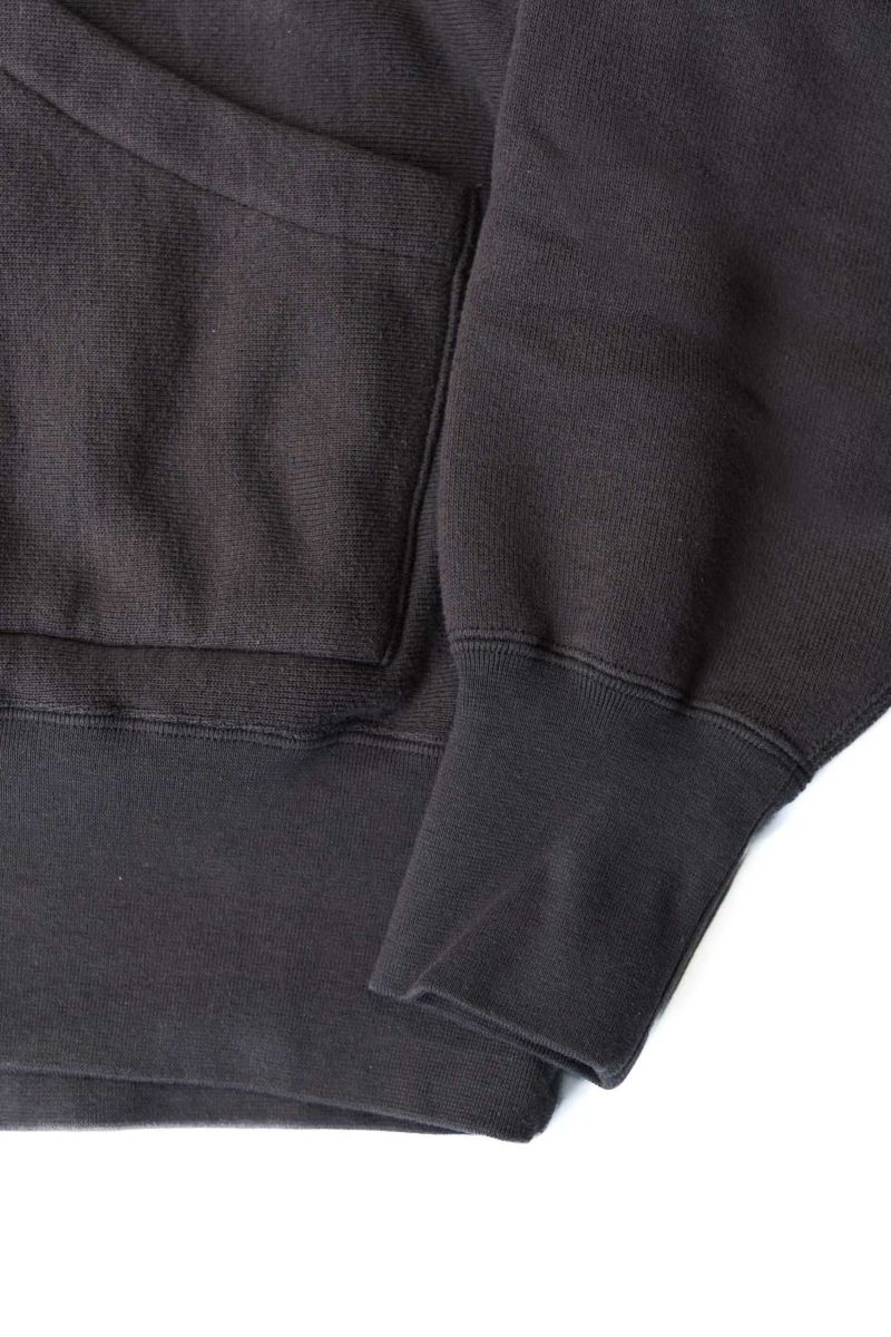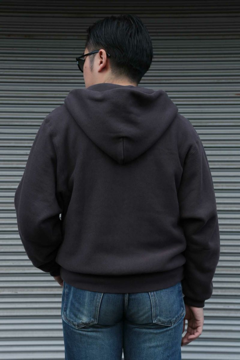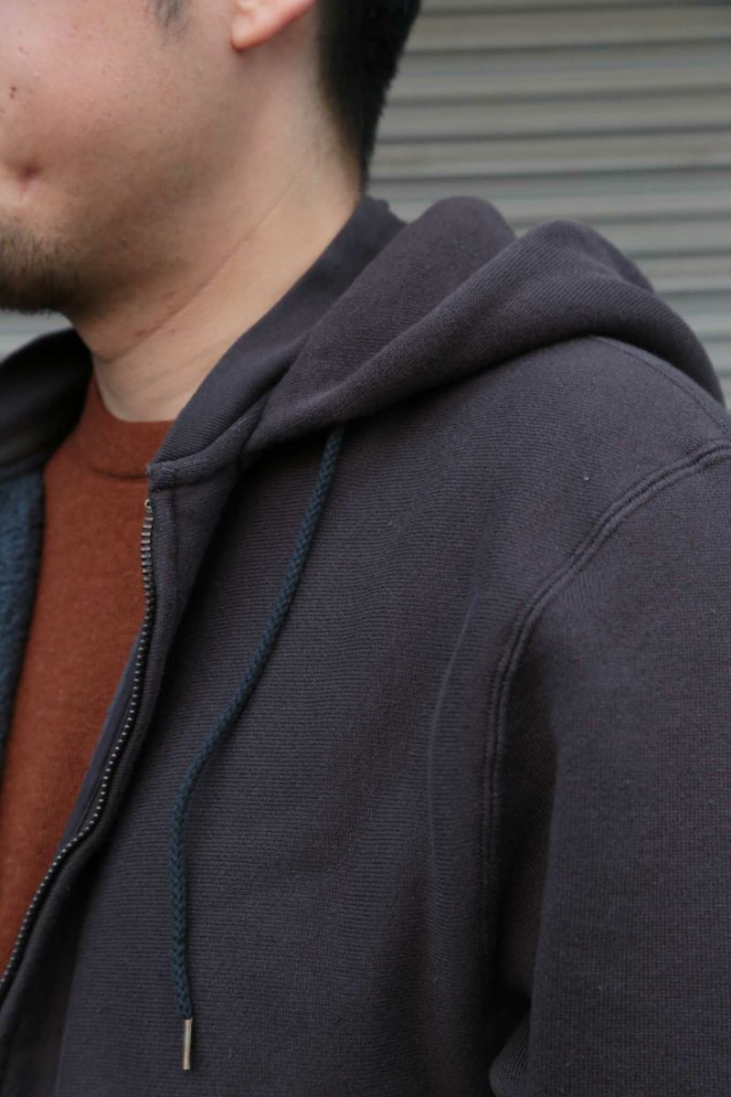 吊裏毛機を使用し、表糸はスビンコットン100%を、裏パイル糸はシルク100%を使用した裏起毛スエット。超長綿から発せられる光沢は濡れたような美しさを持っています。デザインはMA-1の襟リブの様な襟元の外側にフードを縫製し、スポーティーになりすぎない様に工夫。袖は大きめのアームホールのドルマンスリーブになっています。フロントポケットは50年代~60年代で姿を消す分離ポケットを採用。ラグジュアリーな光沢を放つ裏毛生地と、ヴィンテージディテールの融合を狙っています。