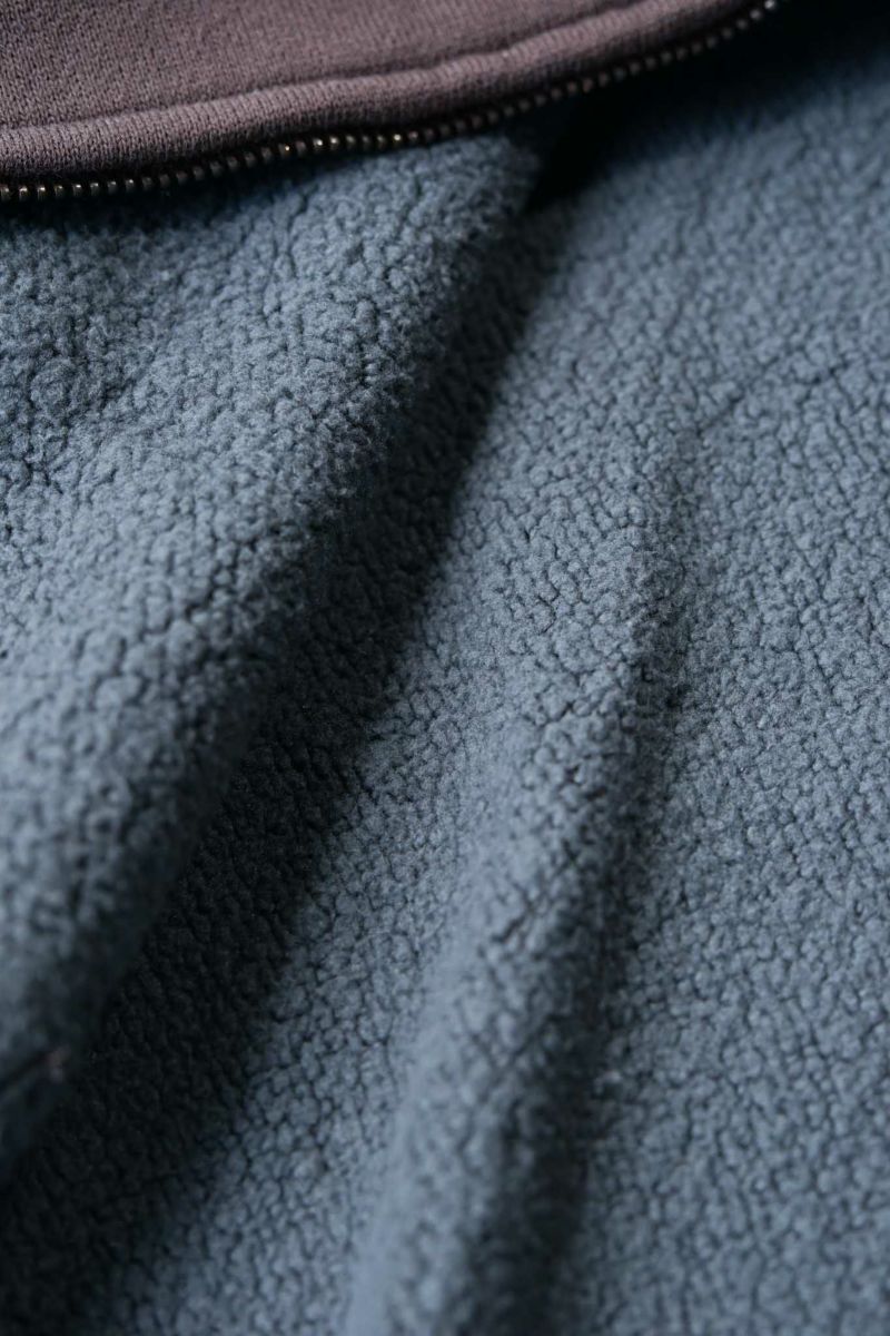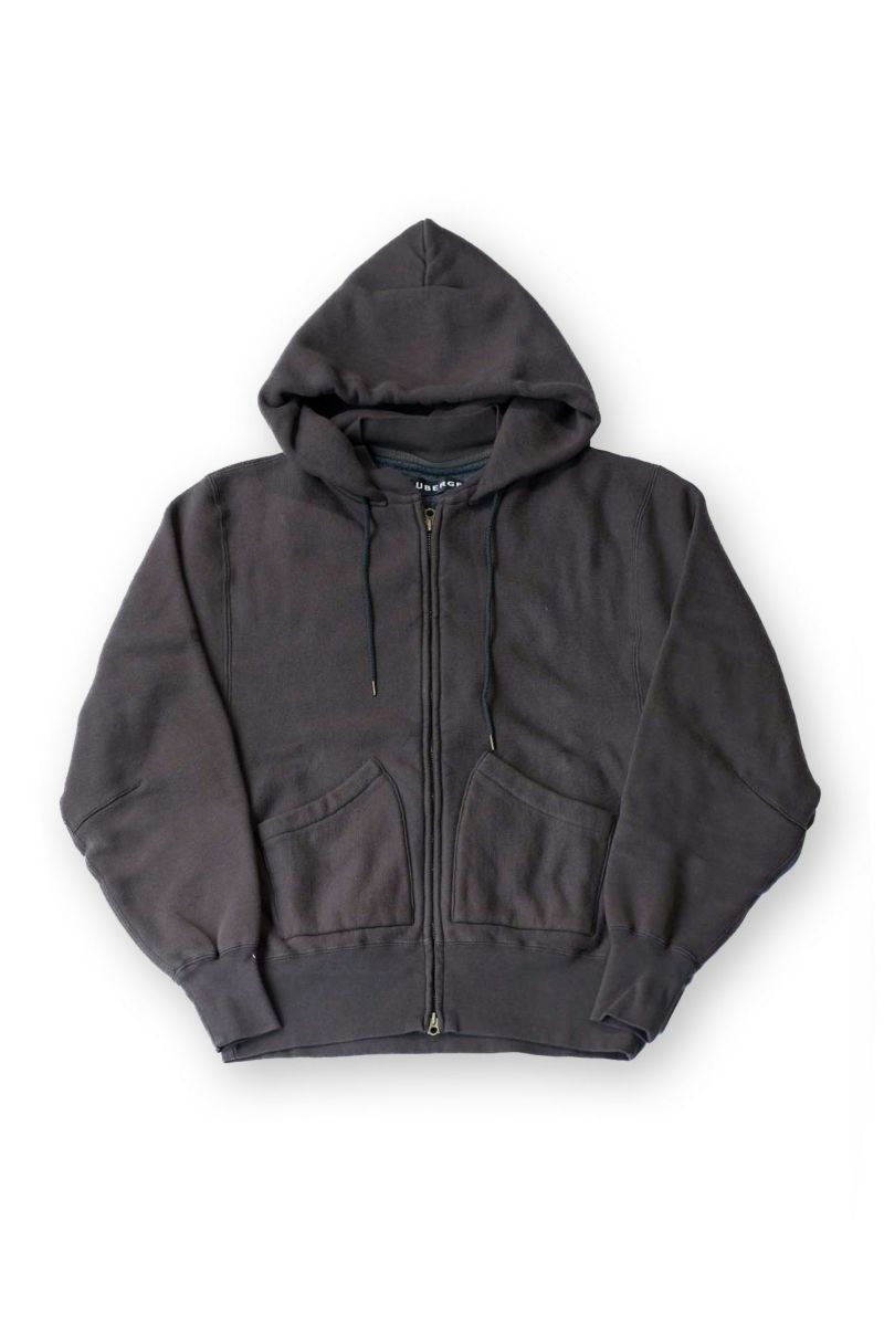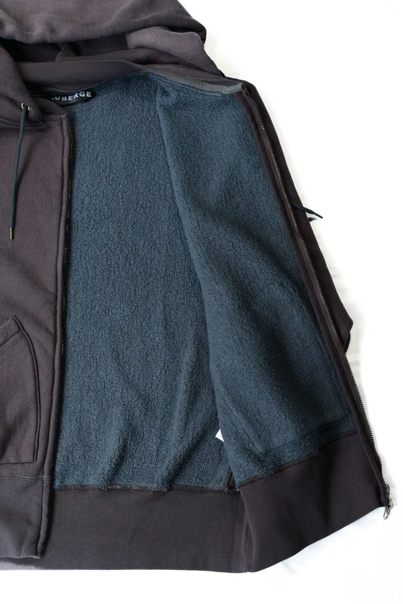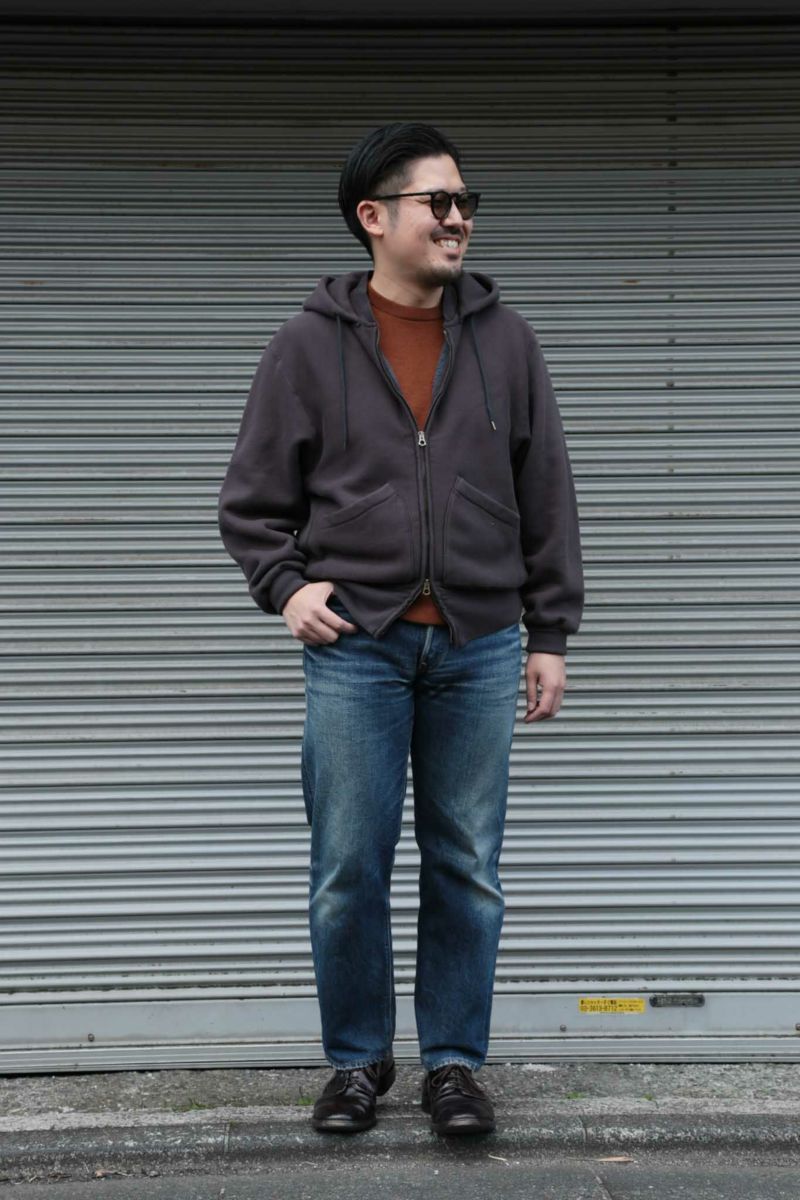 吊裏毛機を使用し、表糸はスビンコットン100%を、裏パイル糸はシルク100%を使用した裏起毛スエット。超長綿から発せられる光沢は濡れたような美しさを持っています。デザインはMA-1の襟リブの様な襟元の外側にフードを縫製し、スポーティーになりすぎない様に工夫。袖は大きめのアームホールのドルマンスリーブになっています。フロントポケットは50年代~60年代で姿を消す分離ポケットを採用。ラグジュアリーな光沢を放つ裏毛生地と、ヴィンテージディテールの融合を狙っています。