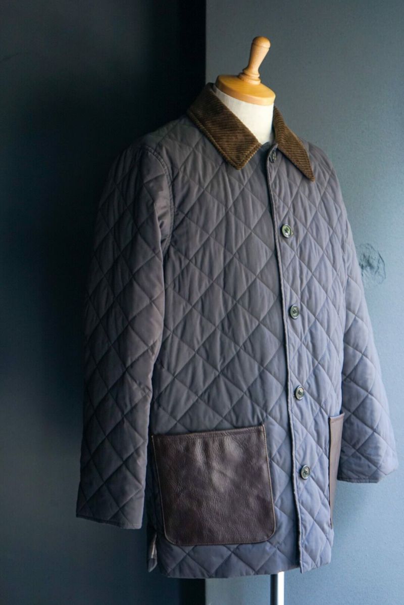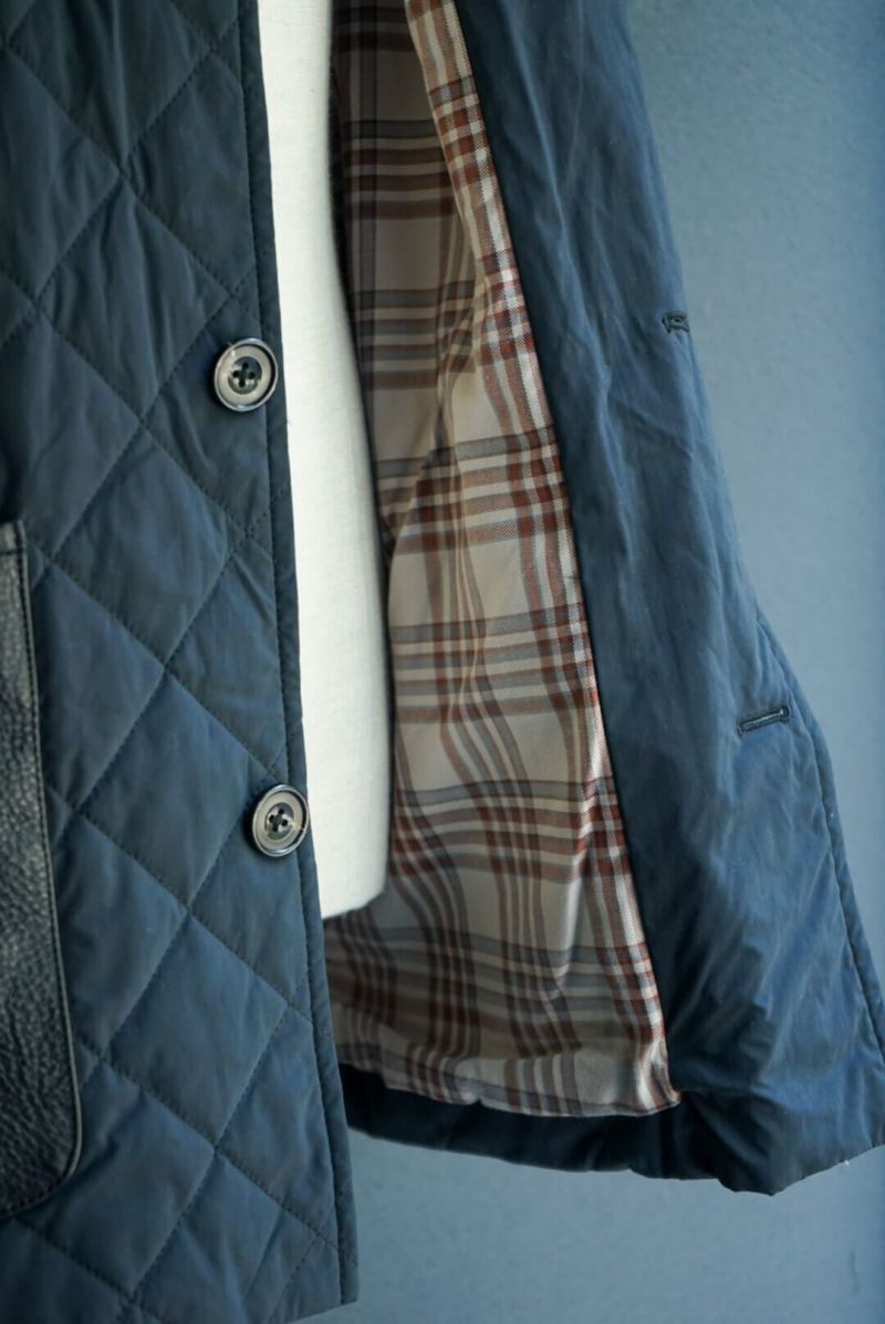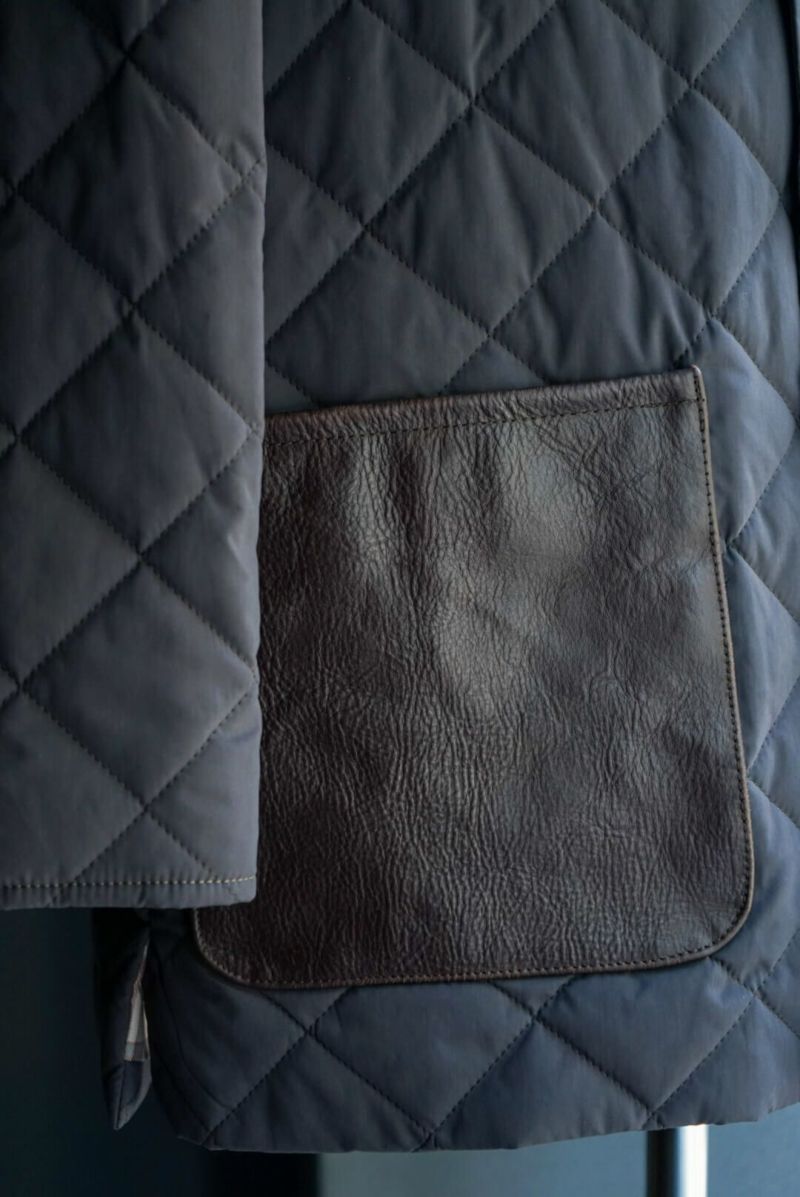 その当時の割繊技術を使ってフランス伝統のスクエアキルト素材に加工し、当時パリを席巻していたH社のキルティングJK風に仕上げました。襟には英国ブリベンモスのコーデュロイ、さらにサイドスリットも施されています。