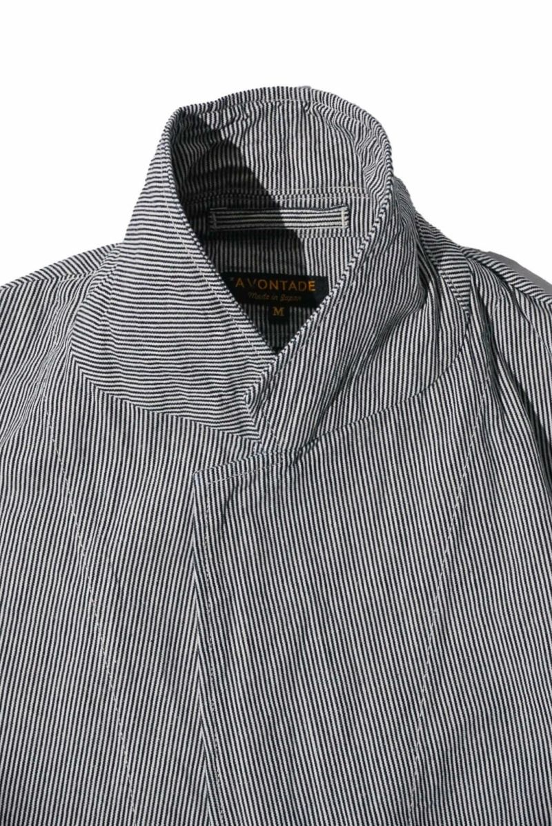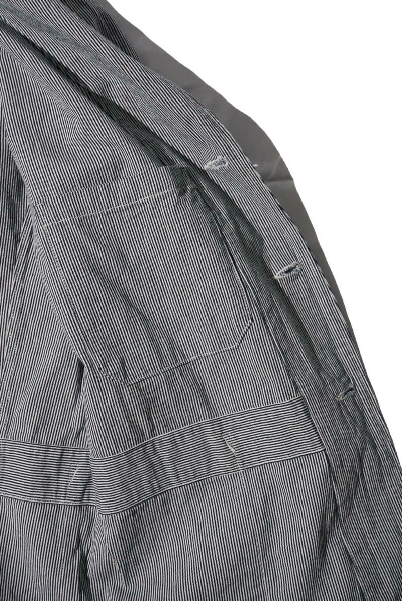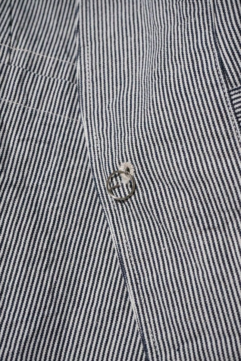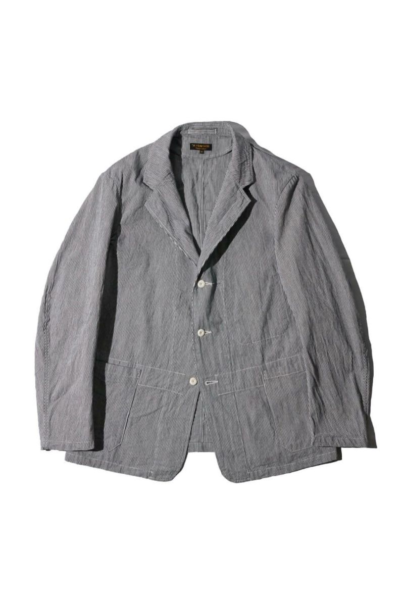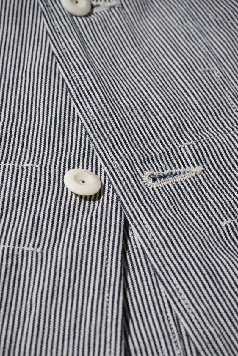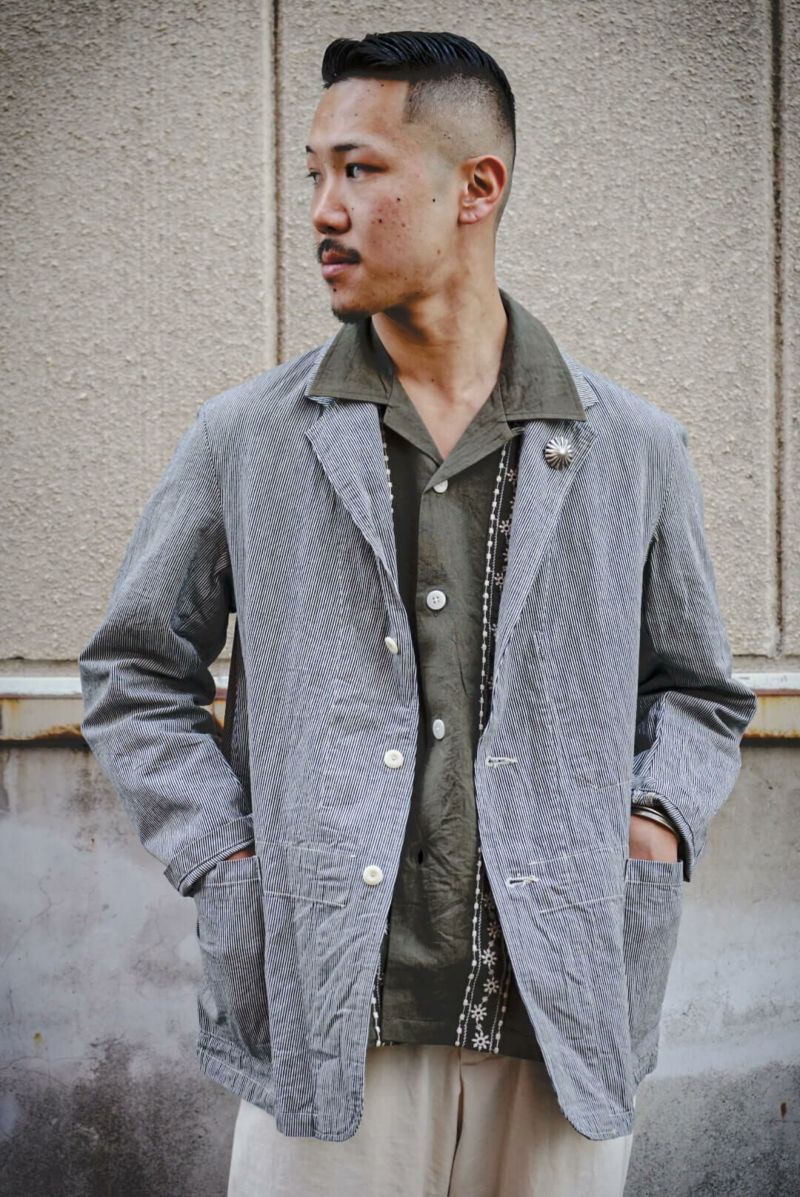 1940年代のイギリス軍のホスピタルジャケットをイメージソースに作成された、3Bジャケットです。素材は緯糸に綿麻の強撚糸を打ち込んで高密度に織り上げた、オリジナルのインディゴストライプ地。薄手ながらハリ感とシャリみのあるタッチが特徴です。