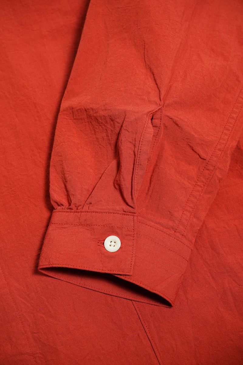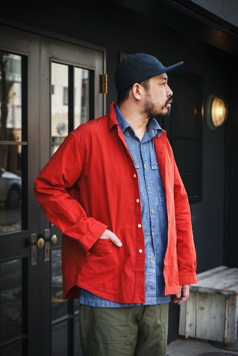 1900年代初頭の農夫が着ていたであろうリネンシャツを参考にした小ぶりな衿型、脇に流し込まれたパッチポケットなど、アウターライクに使えるシャツです。後ろ身頃はインボックスプリーツにすることで腕の可動域を広げるとともに、デザイン的にも抜け感のある表情に仕上がっています。