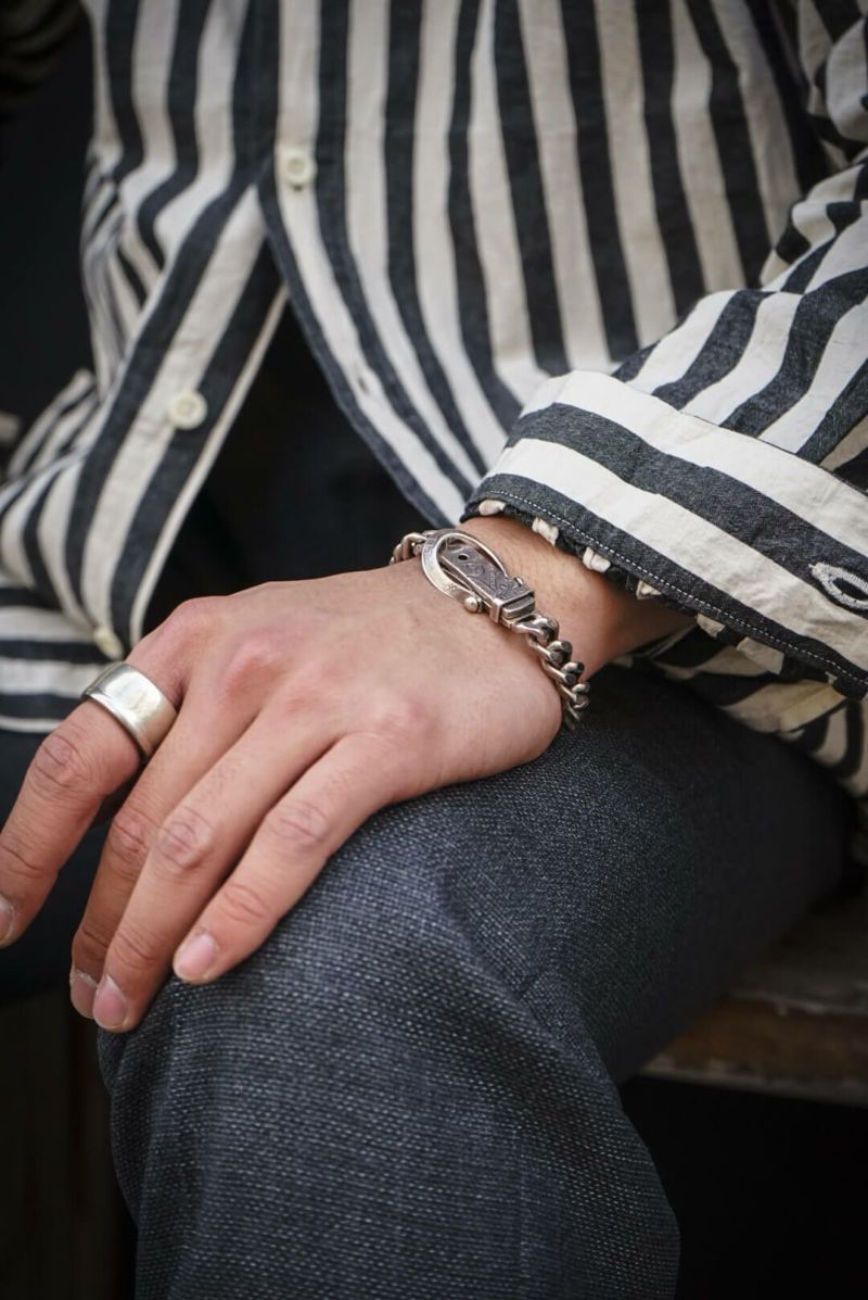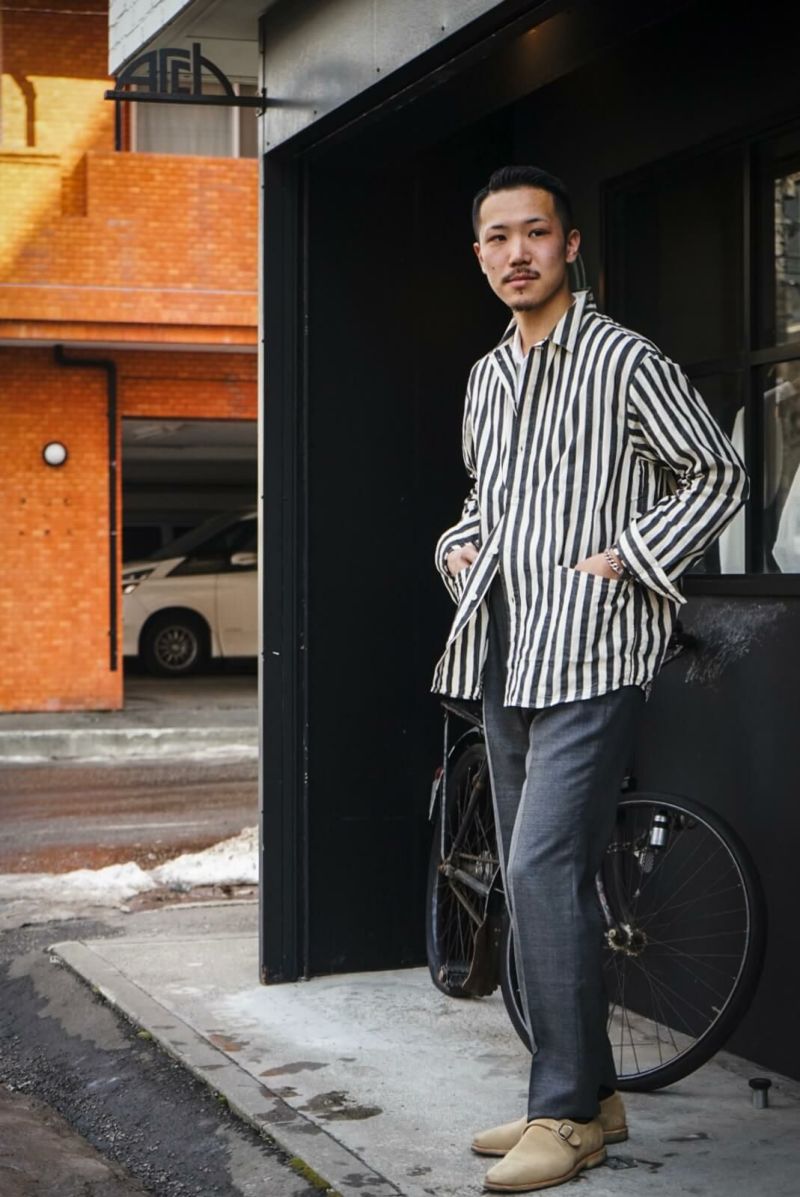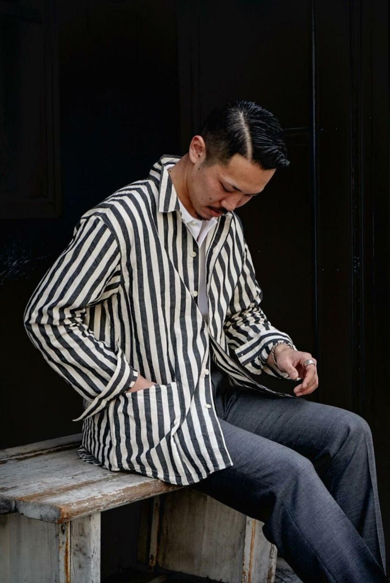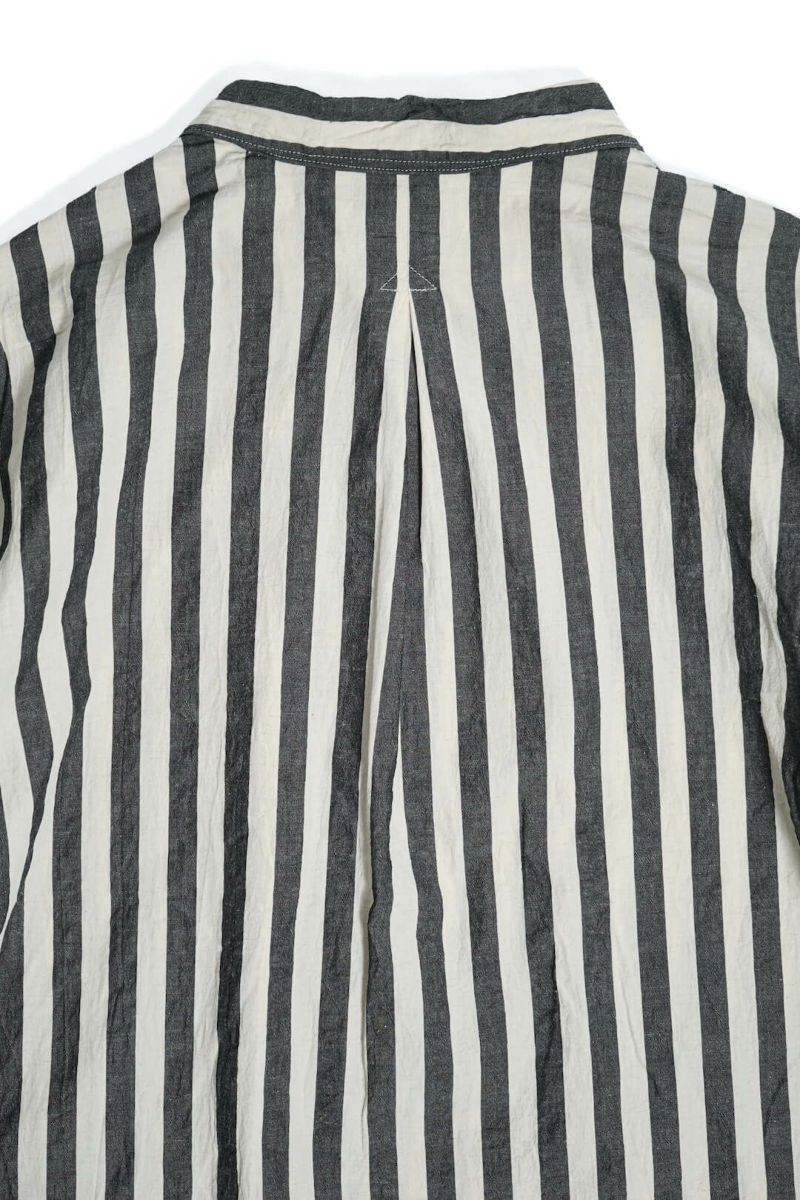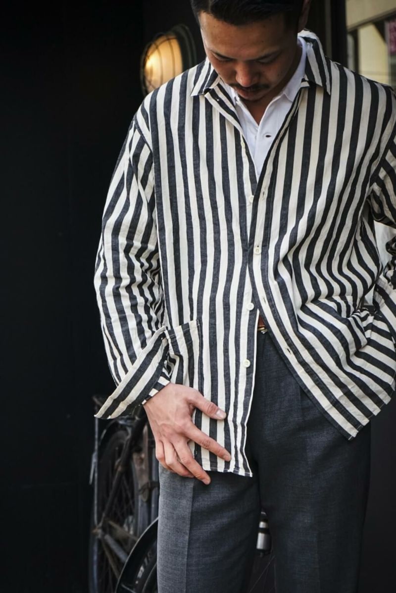 1900年代初頭の農夫が着ていたであろうリネンシャツを参考にした小ぶりな衿型、脇に流し込まれたパッチポケットなど、アウターライクに使えるシャツです。後ろ身頃はインボックスプリーツにすることで腕の可動域を広げるとともに、デザイン的にも抜け感のある表情に仕上がっています。