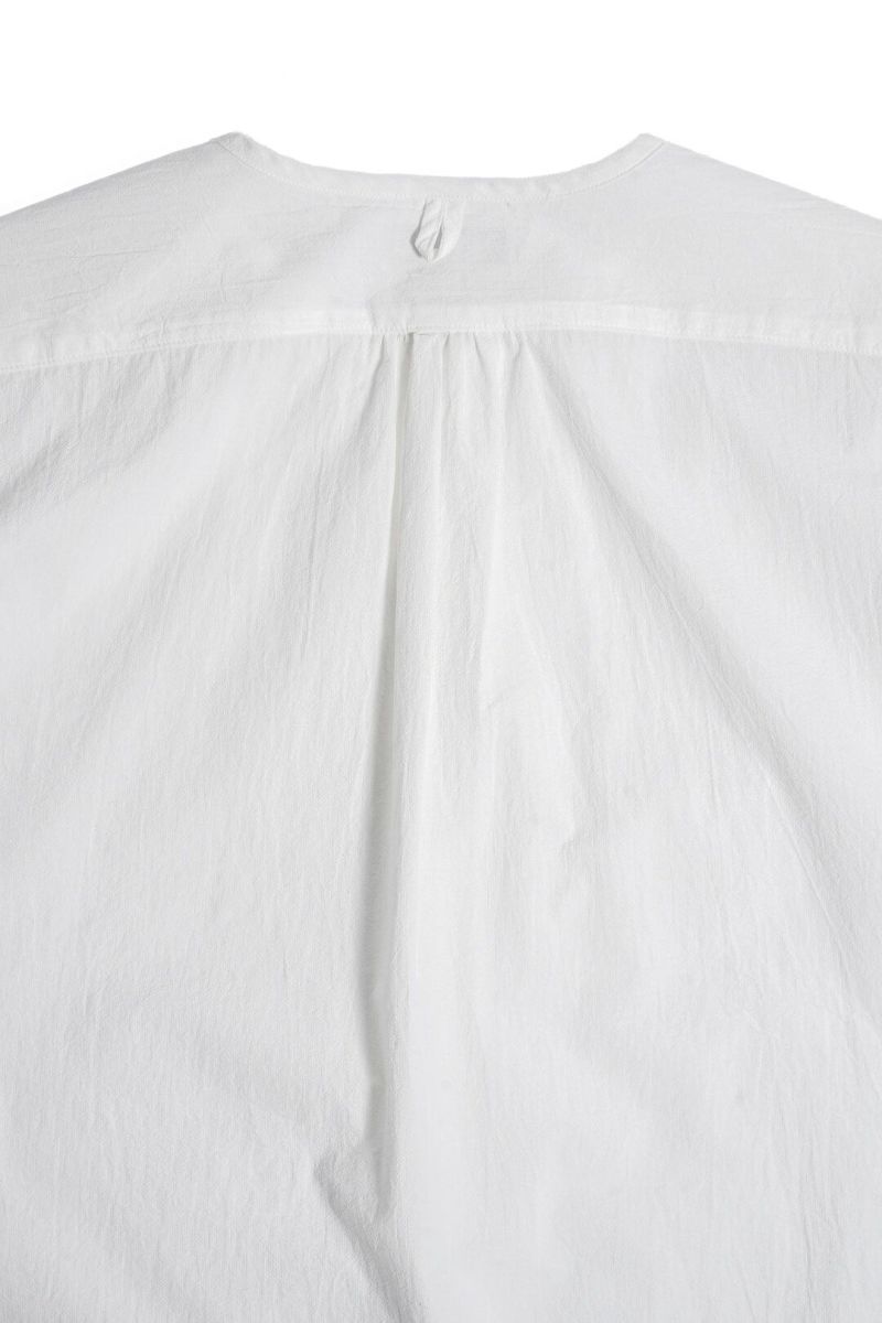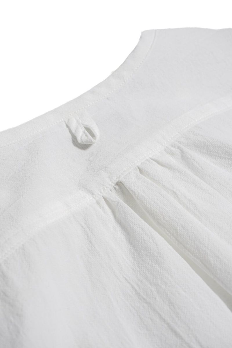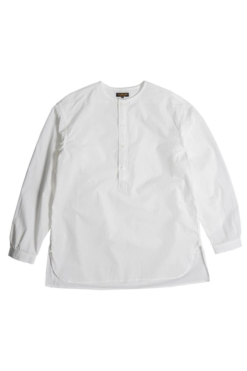 ネックはパイピング始末のクルーネック仕様で、首回りは抜け感のある表情に。前身頃の裾はラウンドさせ、後ろ身頃はスクエアーで変化をつけられています。ヨークと袖口にはギャザーを入れて、ユーロワークのニュアンスを加えられています。身幅にゆとりのあるAラインシルエットのプルオーバーで、ショーツなどとも相性の良い1枚です。