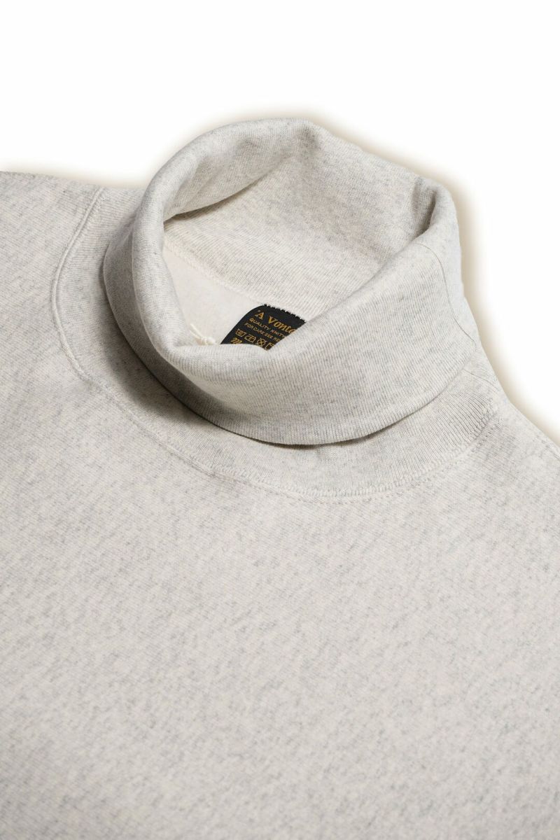 定番の26/2のBD系を使用したタートルネックスウェットです。素材は表糸に26/2のBD糸(空糸)を使ったスウェット地。元々硬めのBD糸を双糸にして、さらに詰めで編み立てる事でシャリ味のあるバルキーなタッチに仕上げています。裏のパイル面は細かくフル起毛させることで、保温性を高め、しなやかな肌触りになっています。