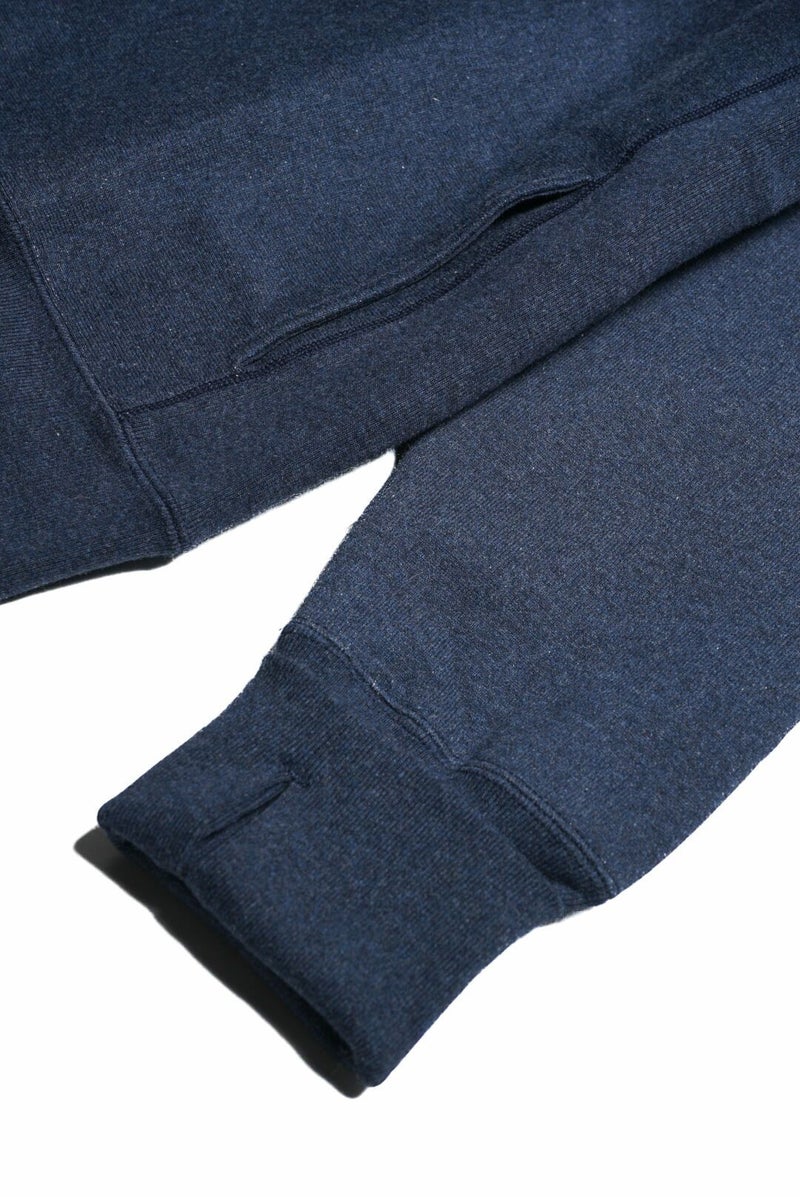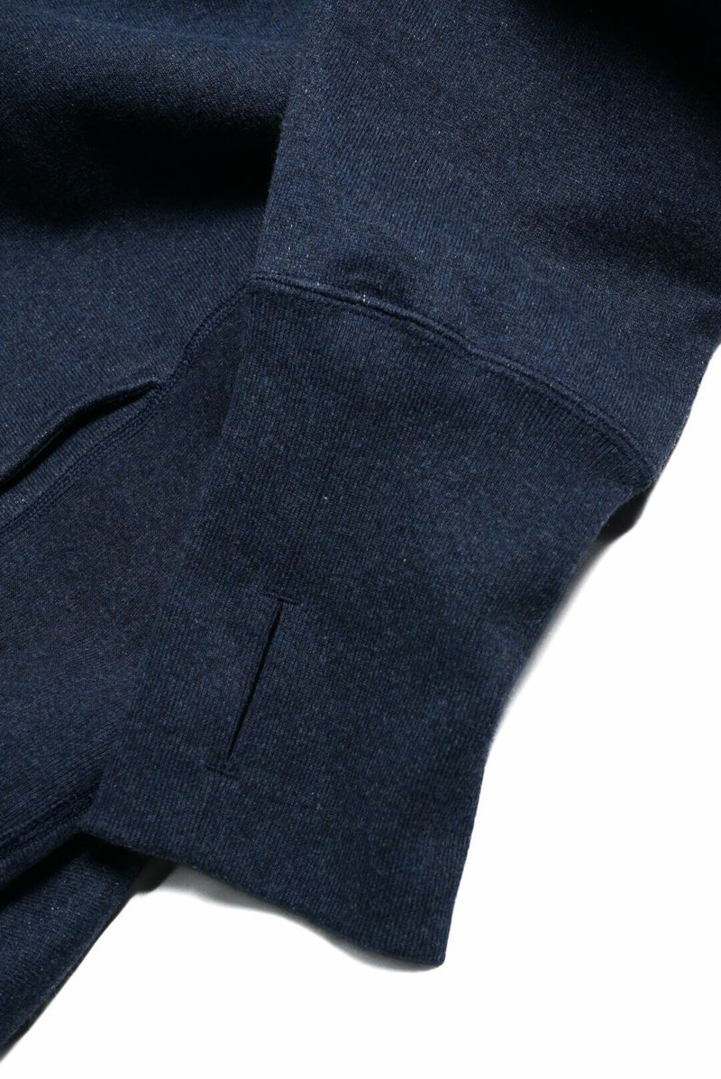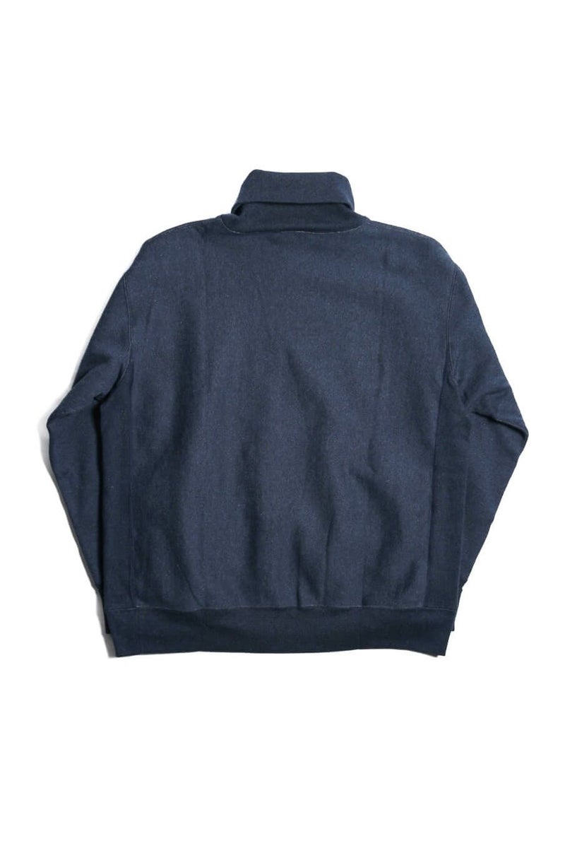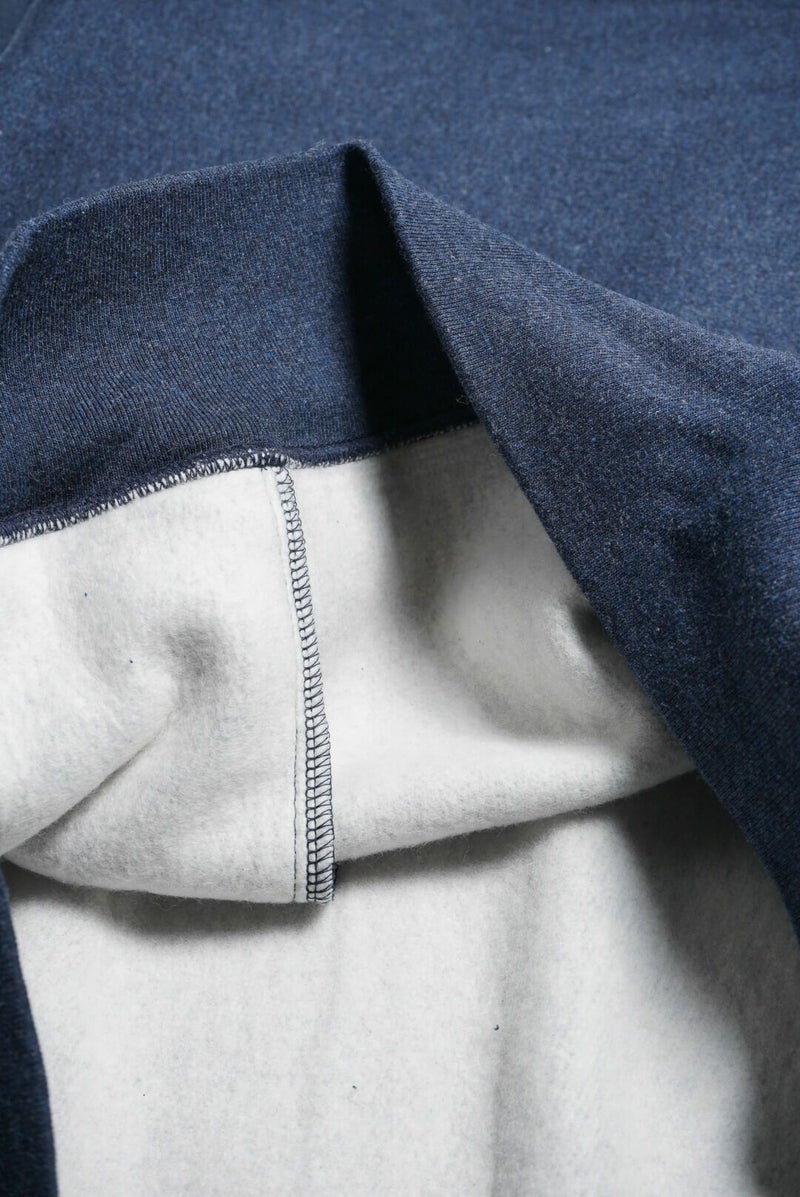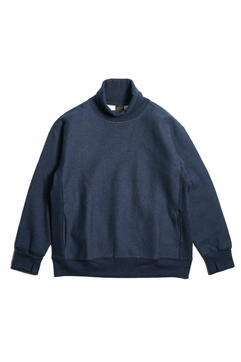 A VONTADE(ア ボンタージ) 26/2のBD糸を使用したタートルネックスウェット。素材は表糸に26/2のBD糸(空紡糸)を使ったスウェット地。元々硬めのBD糸を双糸にして、さらに度詰めで編み立てることでシャリ味のあるバルキーなタッチに仕上げました。裏のパイル面は細かくフル起毛させ、保温性としなやかな肌触りになっています。身頃は横使いにして縦の縮みを軽減し脇はリブパネルで横の伸縮性を確保しています。袖リブは長めにフィンガーホールを、サイドにはハンドウォーマーポケットも付けていますので、冬場には防寒性の高いインナーとしても重宝します。 <素材> COTTON 100% <生産国> MADE IN JAPAN A VONTADE / Turtle Neck Sweat L/S(NAVY MIX) PRICE : ¥23,100(税込み) 品番 :