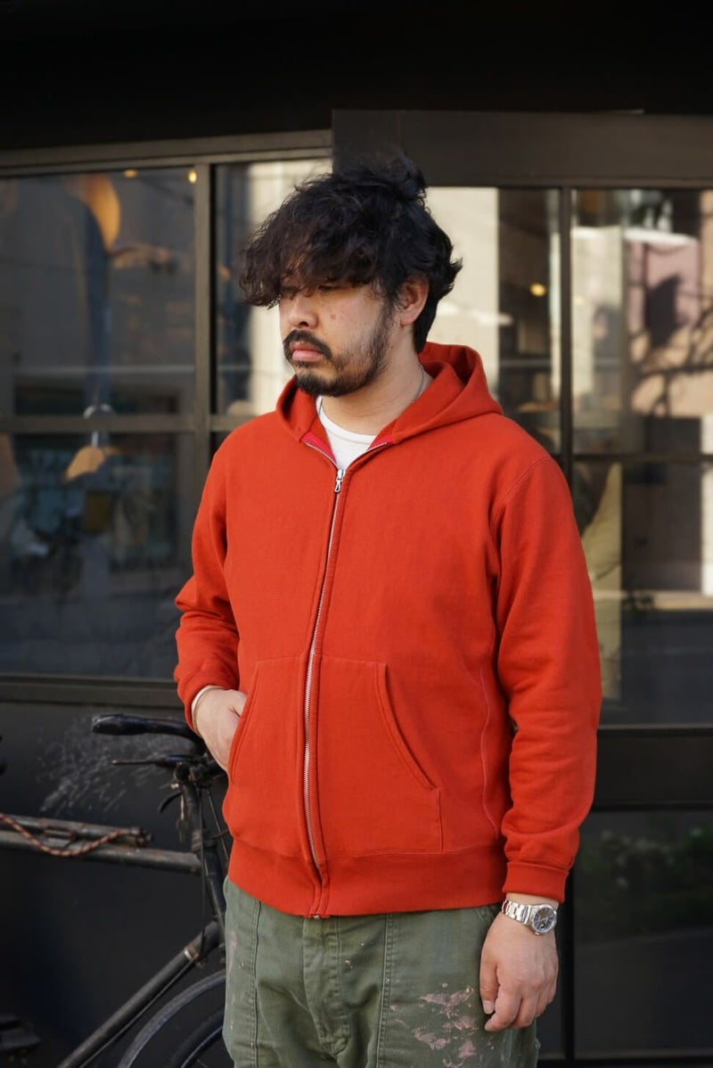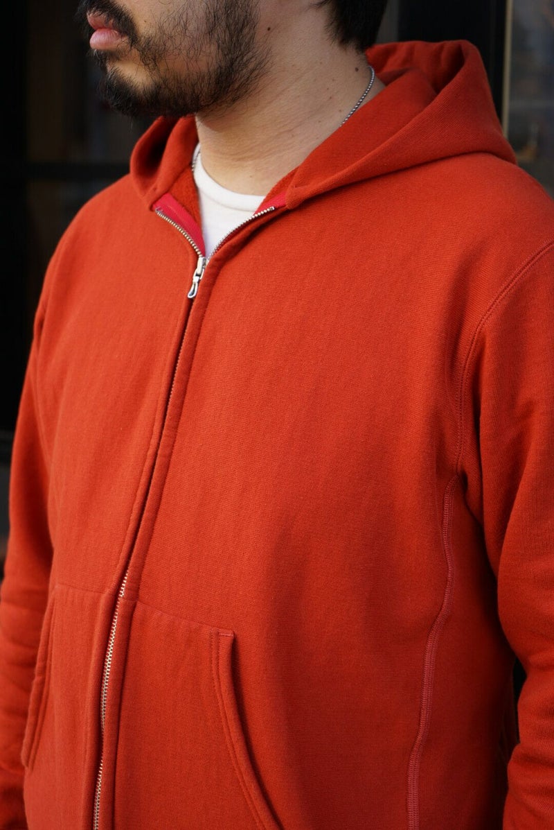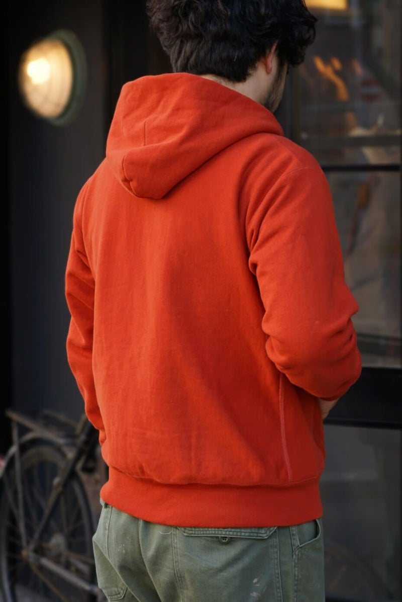26/2のBD糸を使用したジップパーカ。素材は表糸に26/2のBD糸(空紡糸)を使ったスウェット地。元々硬めのBD糸を双糸にして、さらに度詰めで編み立てることでシャリ味のあるバルキーなタッチに仕上げました。裏のパイル面は細かくフル起毛させ、保温性としなやかな肌触りになっています。身頃は横使いにして縦の縮みを軽減し脇はリブパネルで横の伸縮性を確保しています。フードは2枚仕立てで、袋縫いで身頃につけています。