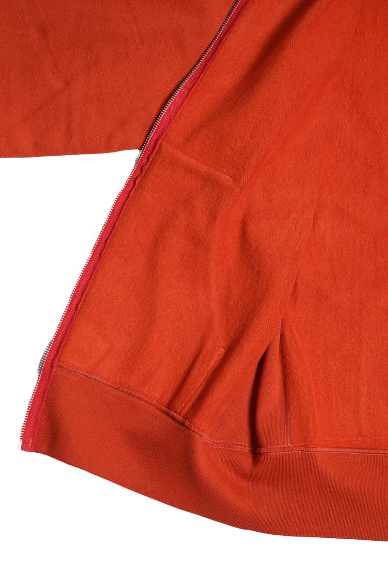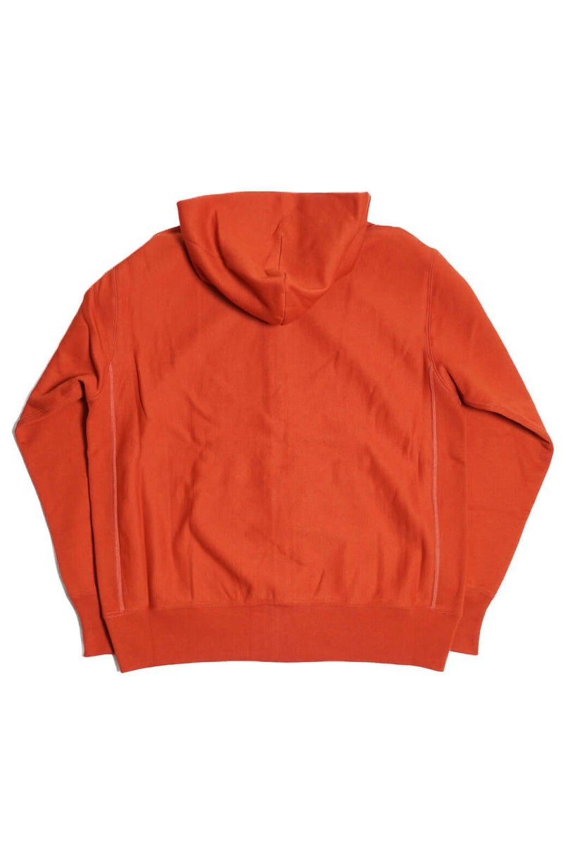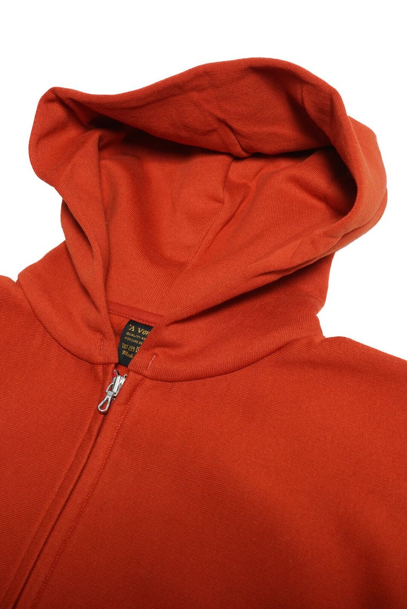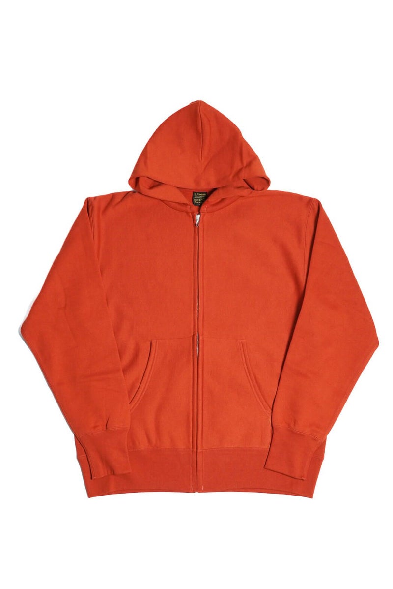 26/2のBD糸を使用したジップパーカ。素材は表糸に26/2のBD糸(空紡糸)を使ったスウェット地。元々硬めのBD糸を双糸にして、さらに度詰めで編み立てることでシャリ味のあるバルキーなタッチに仕上げました。裏のパイル面は細かくフル起毛させ、保温性としなやかな肌触りになっています。身頃は横使いにして縦の縮みを軽減し脇はリブパネルで横の伸縮性を確保しています。フードは2枚仕立てで、袋縫いで身頃につけています。