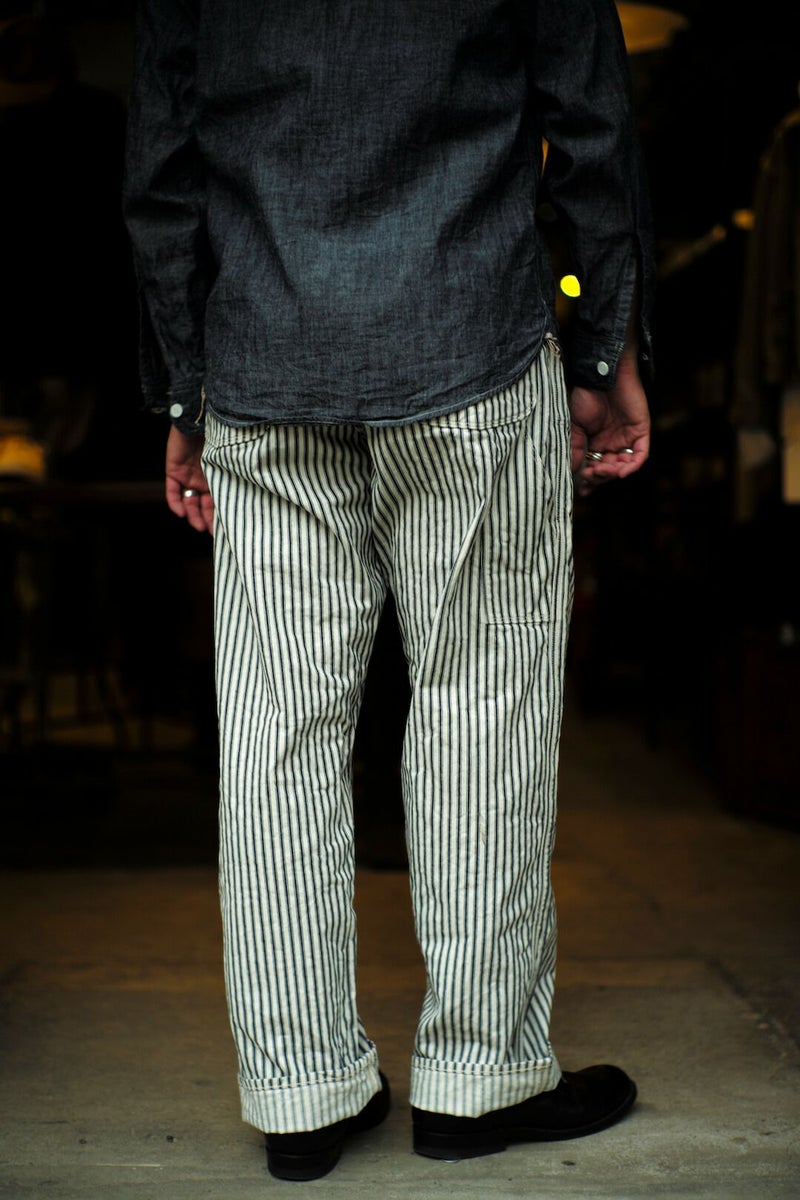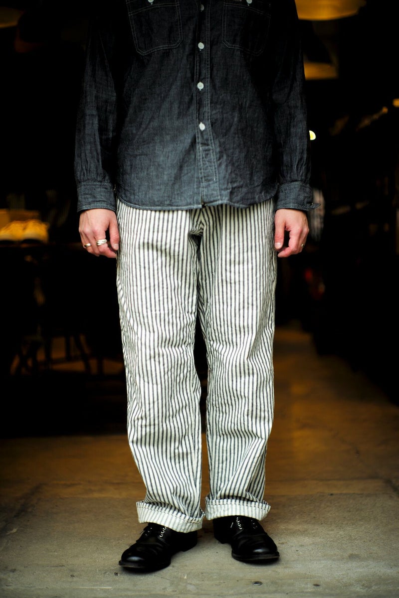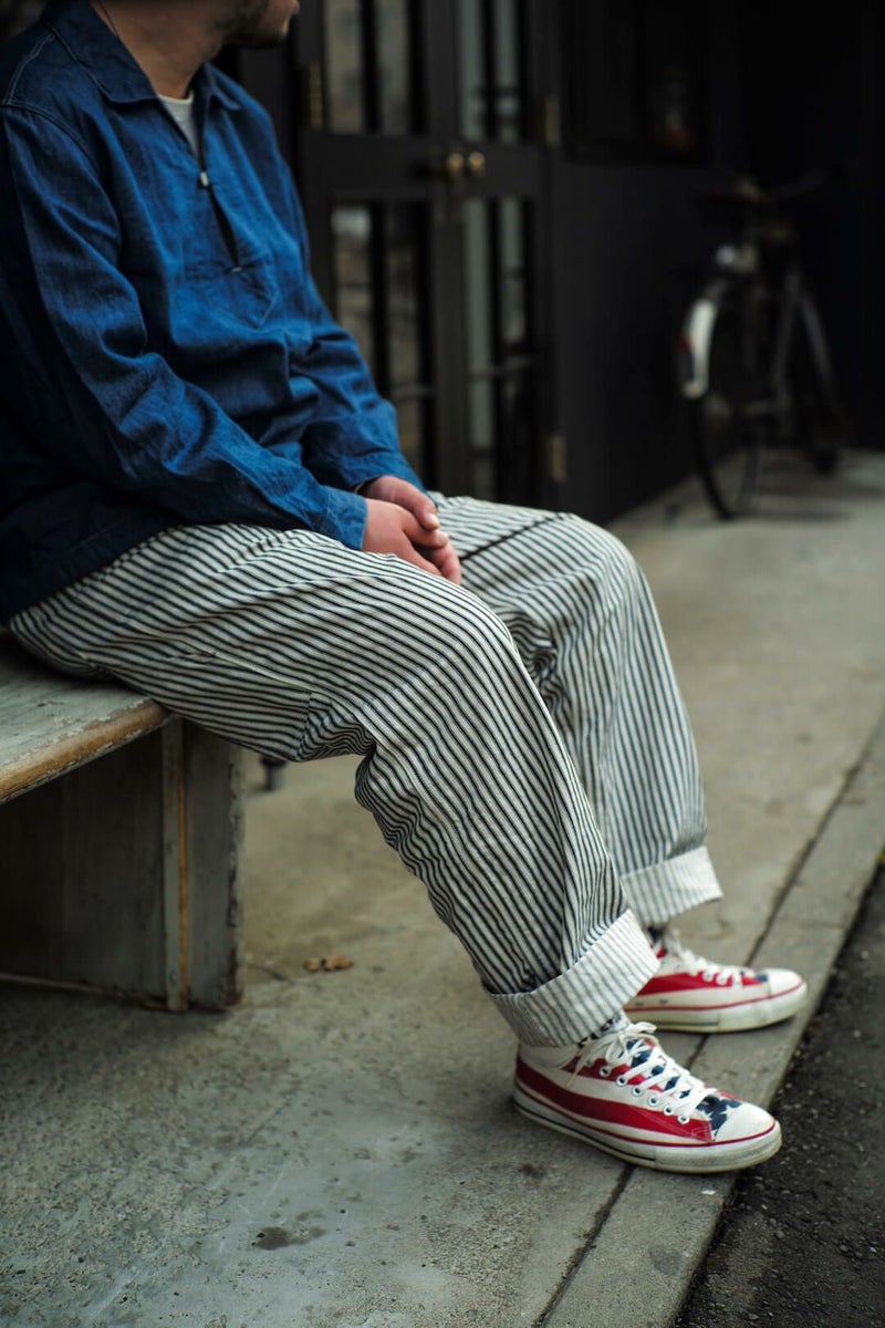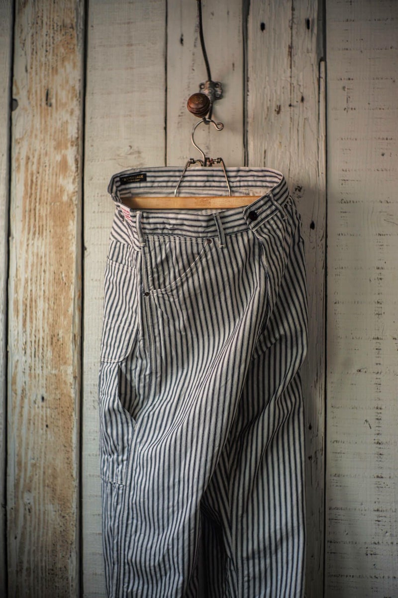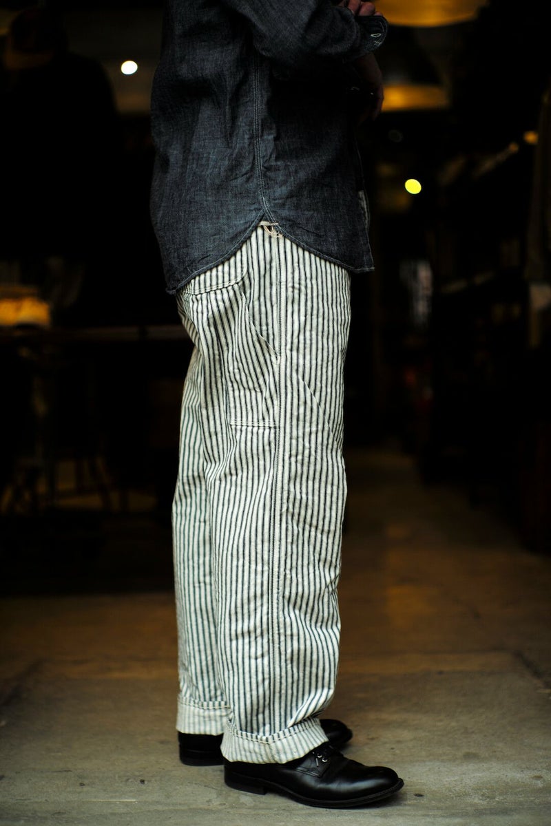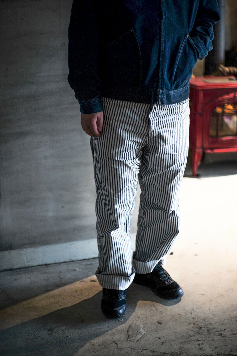 ARCH別注にて製作した"PAINTER PANTS" 過去のアーカイブモデルを復刻し、素材にはARCH米村屋が提案するアメリカンスタイルを感じるモノを落とし込みました。 アメリカらしいヒッコリーの素材は、ワークウェアーらしく直球に無骨さを表現しています。 通常のヒッコリーよりもネイビーの色味が強くないので、良い意味で抜け感があり合わせやすい一本に仕上がっています。 COTTON 100%