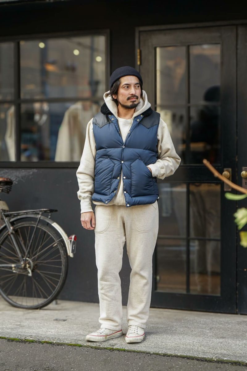 デニムと同じく原綿の配合から糸の捻までこだわったこだわりの吊り裏毛SWEAT。原綿の種類産地によって質感、手触り、色などがかわりますがそれをデザイナー森島氏により組み合わせられ理想の生地に仕上げられています。