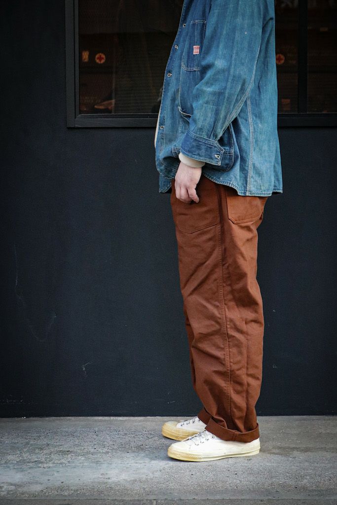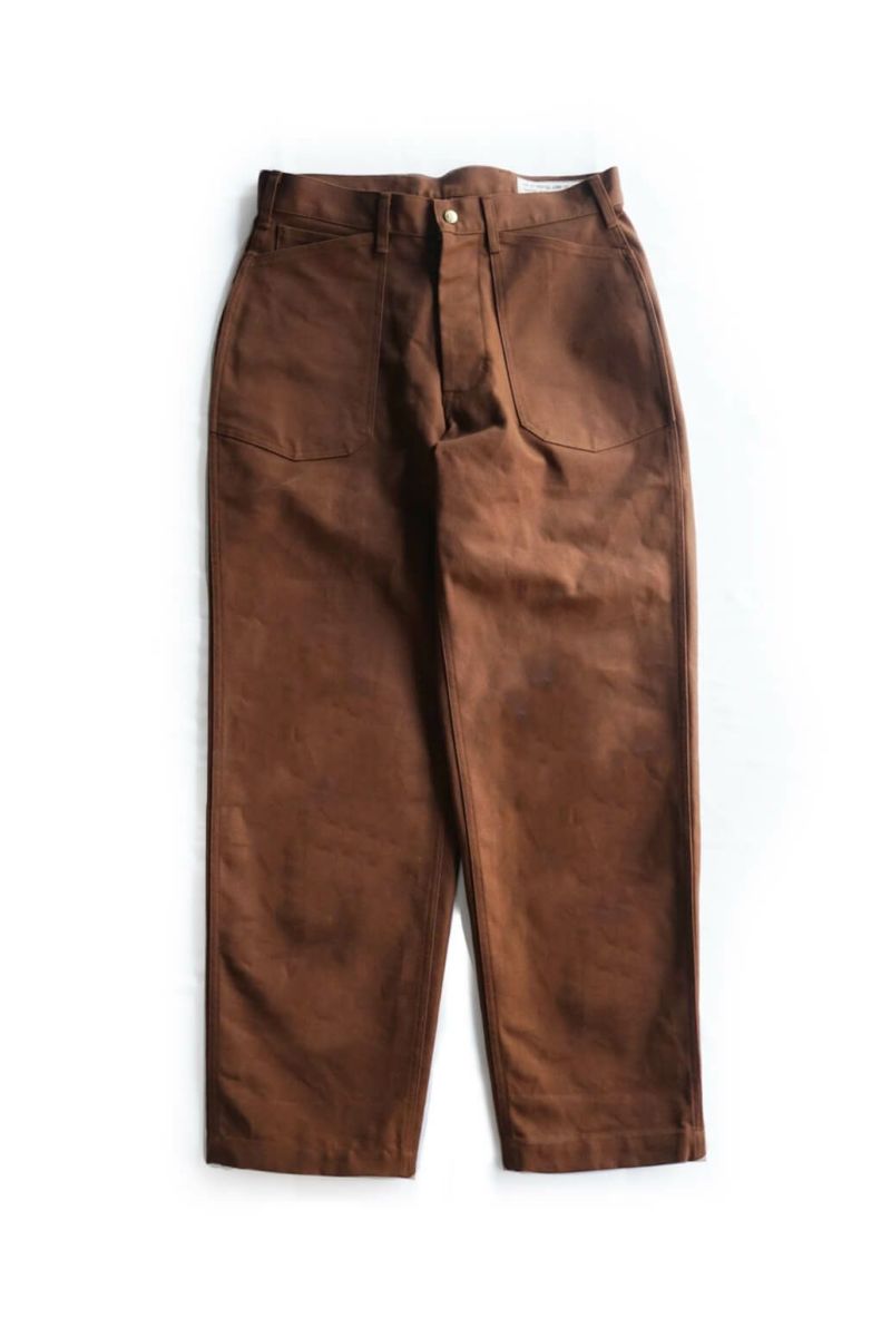 米軍のワークパンツより着想を得た、オールマイティに穿きこなせる1本です。生地はエイジングを楽しめるブラウンダック生地を使用。パーツも全てBONCOURA オリジナル。絶妙なワイドシルエットなので、様々なトップスと組み合わせやすいのも魅力で、The男のワークパンツといった印象です。