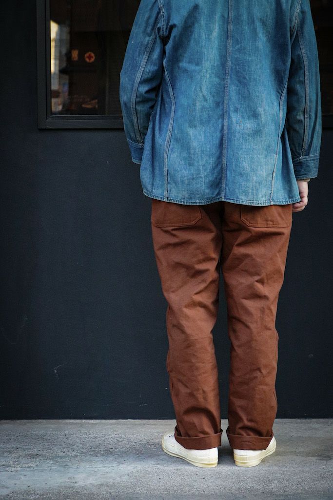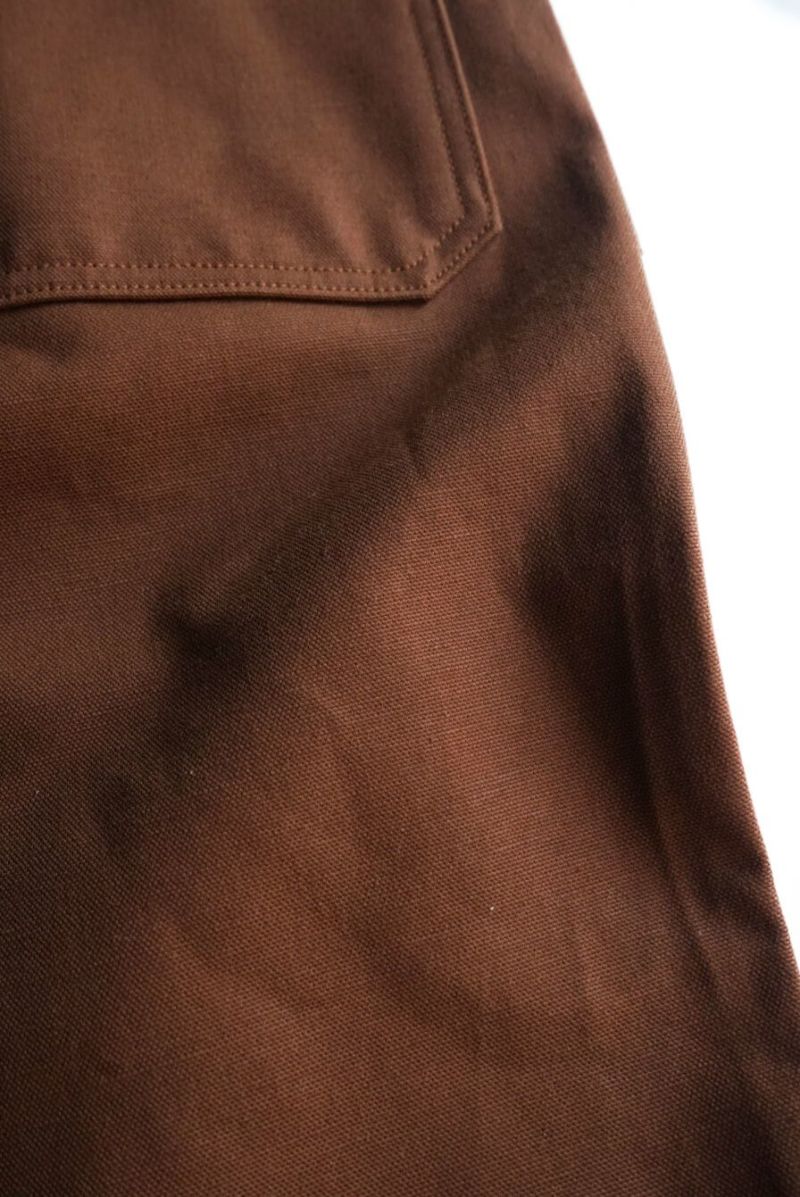 生地はBONCOURAこだわりのブラウンダックを使用。BONCOURA独自のブラウンダックは高密度に織られた生地組織にしっかりとした生地感。こうして織られたこだわりの生地はヘビーに着用することで育っていくことは勿論、エイジングを楽しめるのは勿論ですが、男らしい雰囲気を併せ持ちます。着用するごとに出てくるアタリは素晴らしいの一言。ヘビーに穿いていけるワークパンツ、その素晴らしい穿き心地を是非体験してみてください。