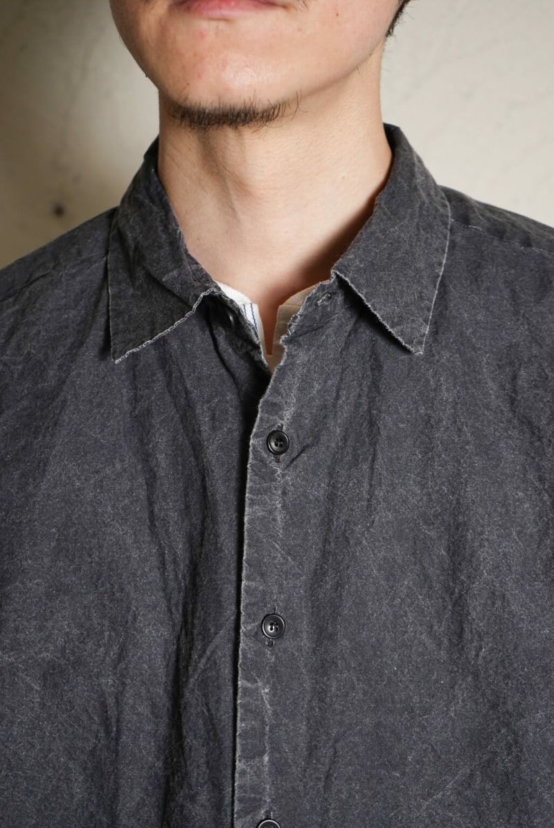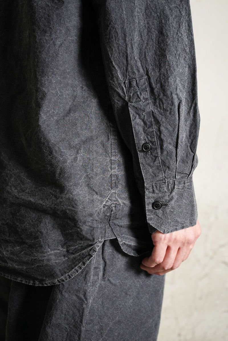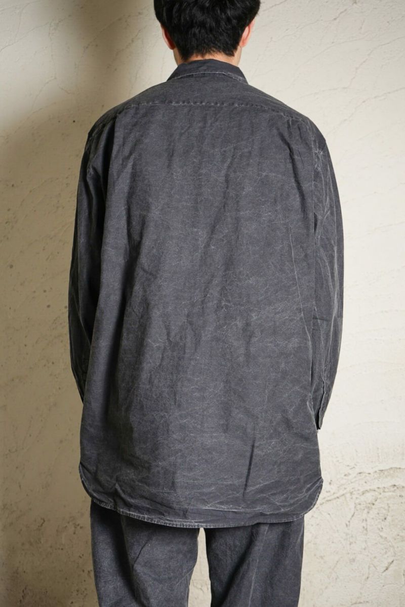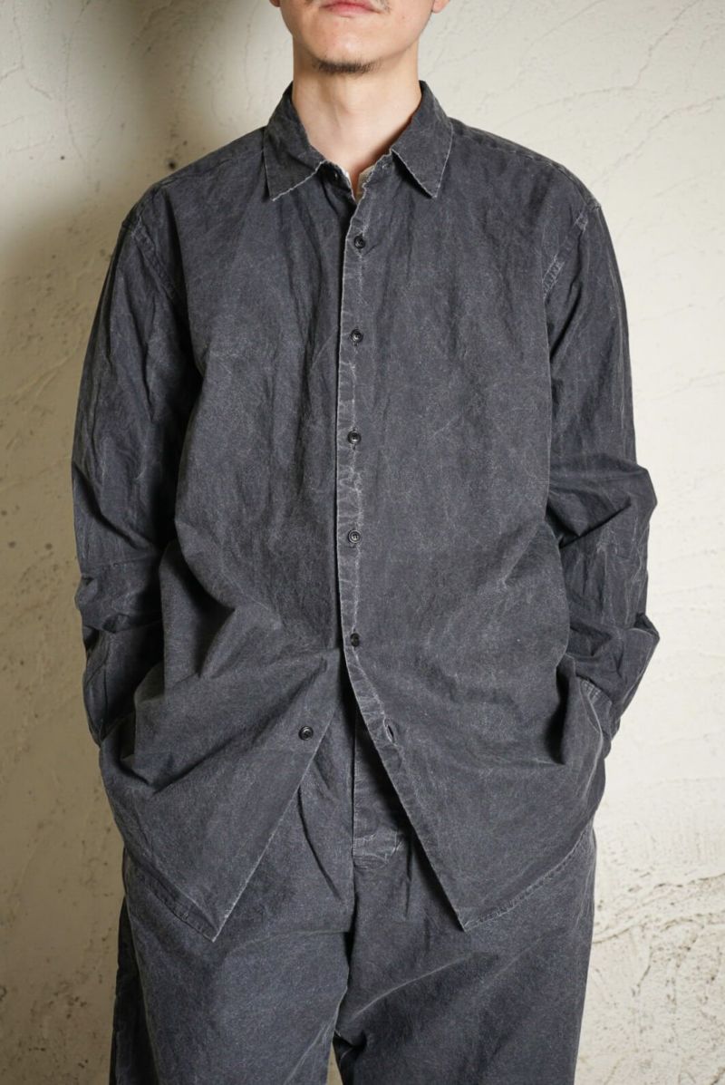 色落ちやアタリをプリントで表現したエクスクルーシブの高密度コットン生地を使用したBIG RACCOURCIE SHIRTです。シンプルながら1枚でも抜群の存在感を放つCASEY CASEYらしいシャツ。製品洗いにより、着初めから自然な風合いです。