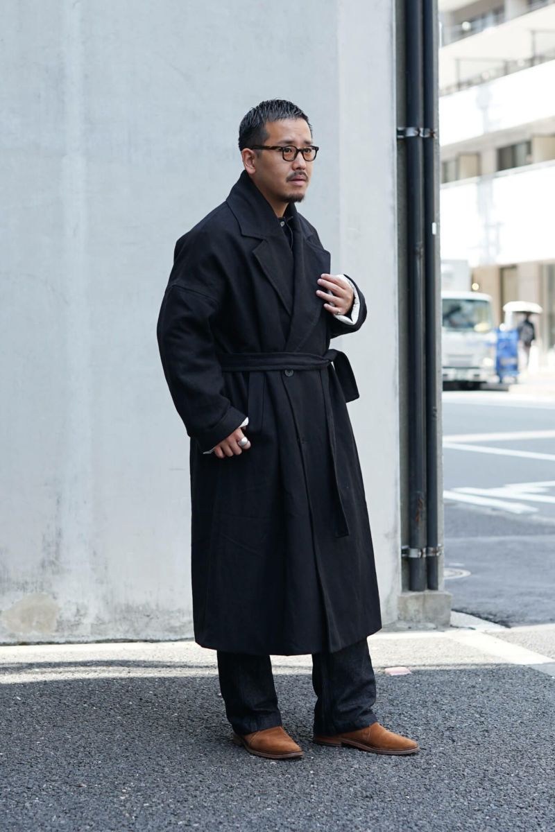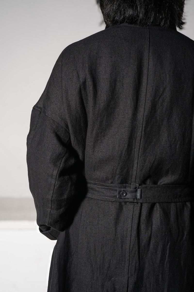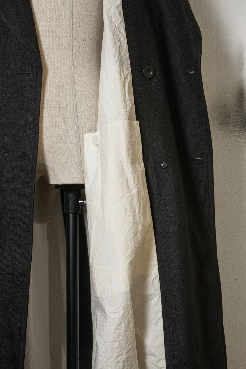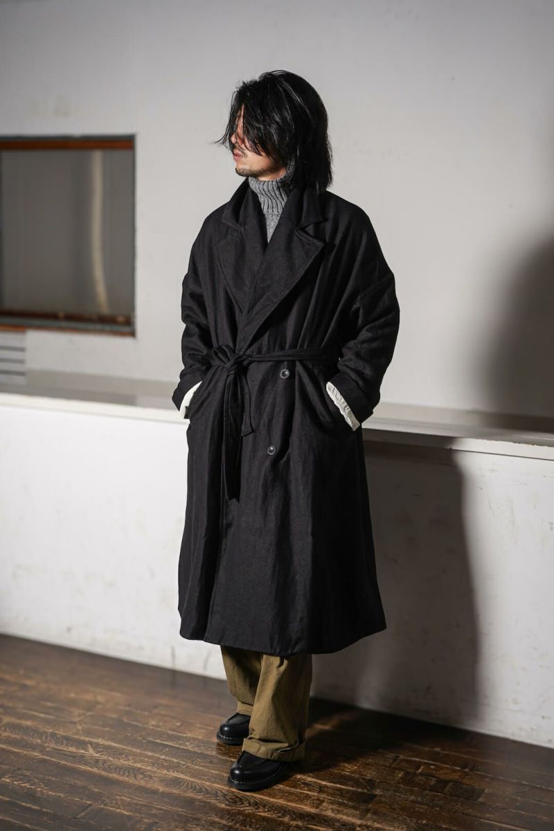 テーラードカラー、シルエットを調整するための取り外し可能なウエストベルトを備えた、迫力のあるダブルブレストコート。素材はリネンの通気性とウールの暖かさを両立した混紡生地を使用しています。自然なドレープ感と深みのある風合い豊かな生地感が魅力的です。