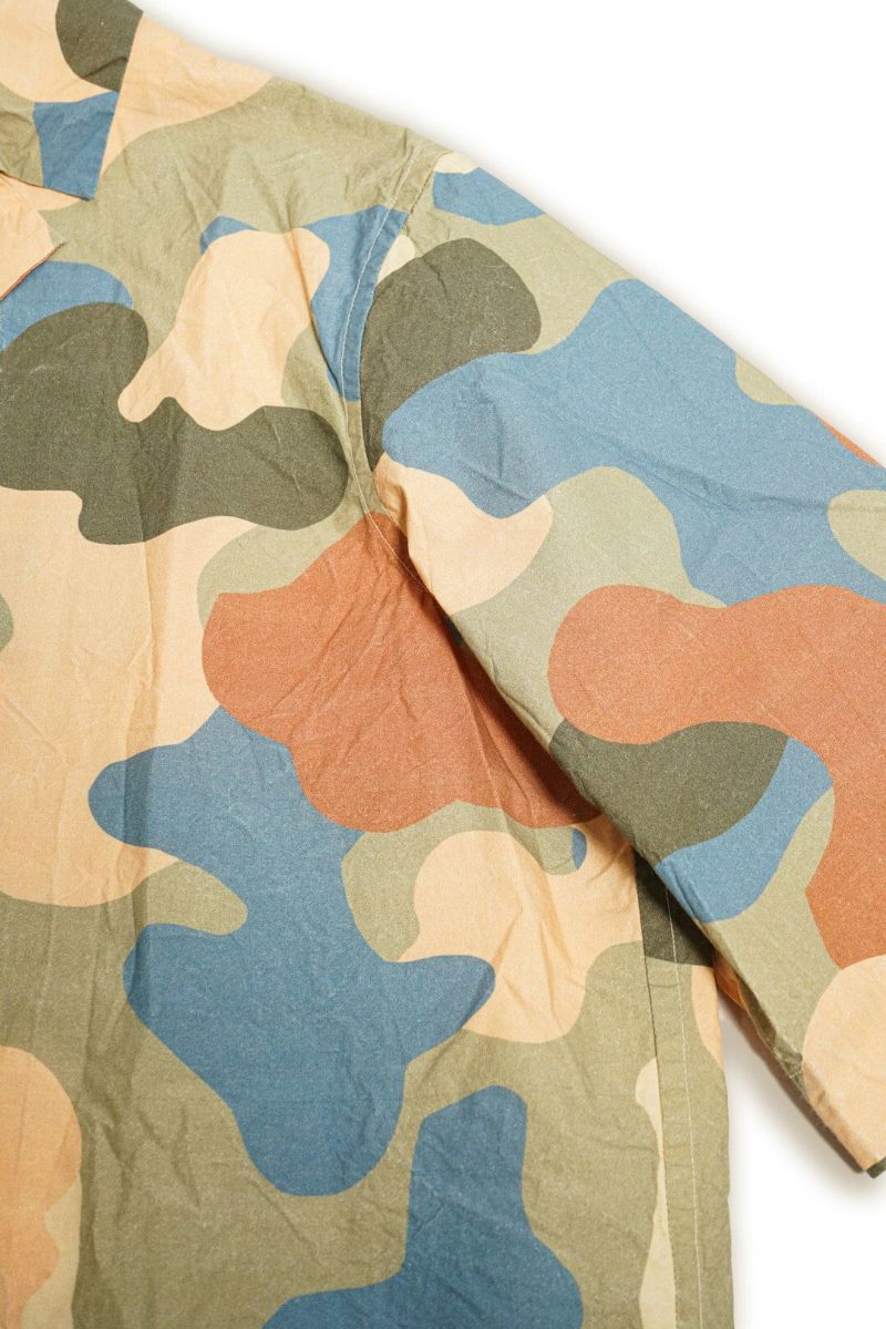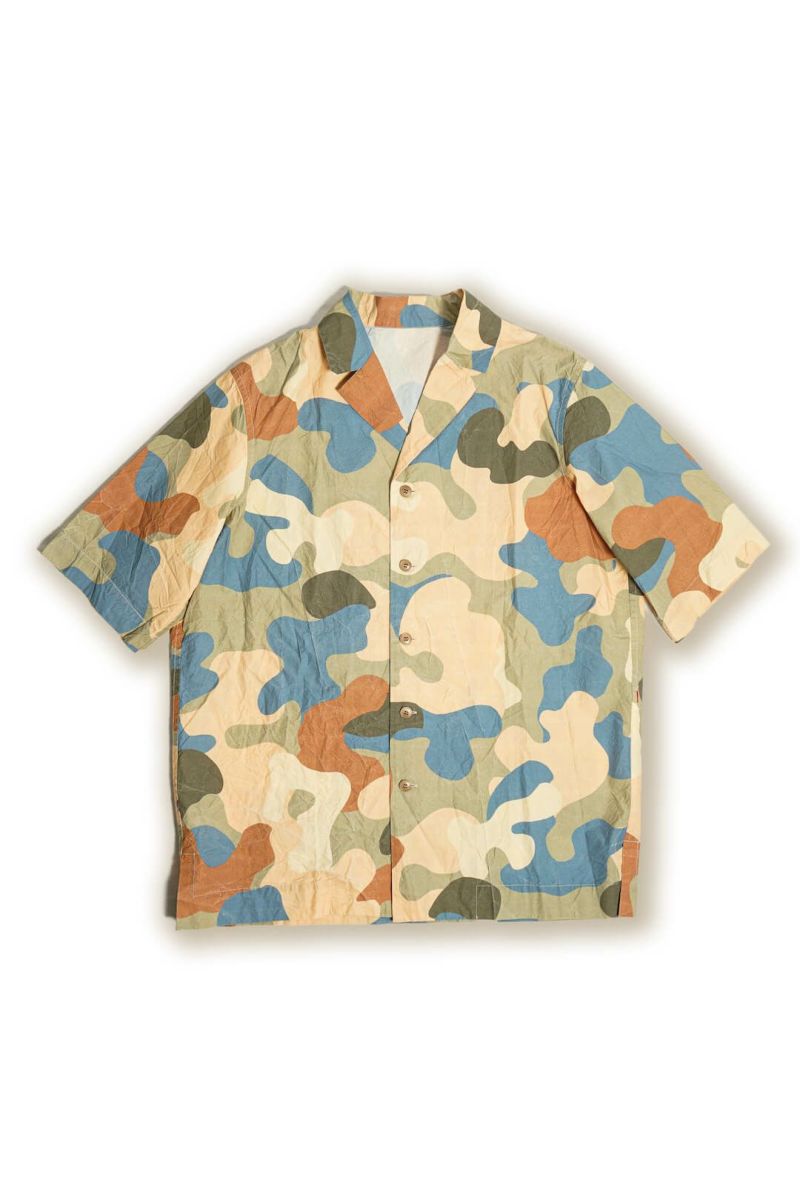 アメリカンな雰囲気のBOWLING SHIRTをベースに、ミリタリーの色味が色濃く反映されたカモフラージュ柄を落とし込んだ一枚。ミリタリーが持つ無骨さを感じさせないのはCASEY CASEY特有の柔らかい空気感にあります。色味を落ち着かせてありそうでないパターンに。フワッとしたゆったりとしたシルエットは、他にはない絶妙なシルエットを生み出しています。