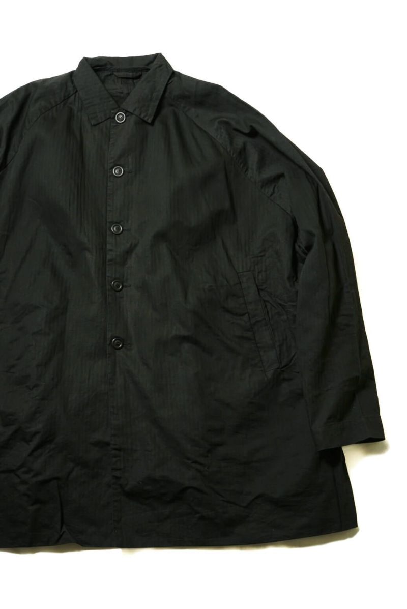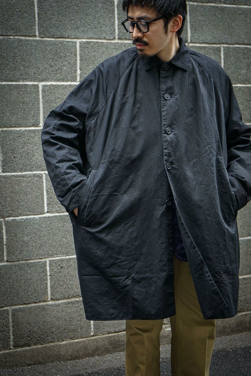オーバーサイズステンカラーコートで、肩回りにリラックス感をもたらすラグランスリーブ仕様になっています。素材には軽めのワックス処理が施されたコットンヘリンボーン生地を使用。一枚地で軽やかさがありながらもワックス加工によりほど良いハリ感があります。染色やウォッシュなどの独自の技術を駆使した経年変化したような風合いも魅力的です。