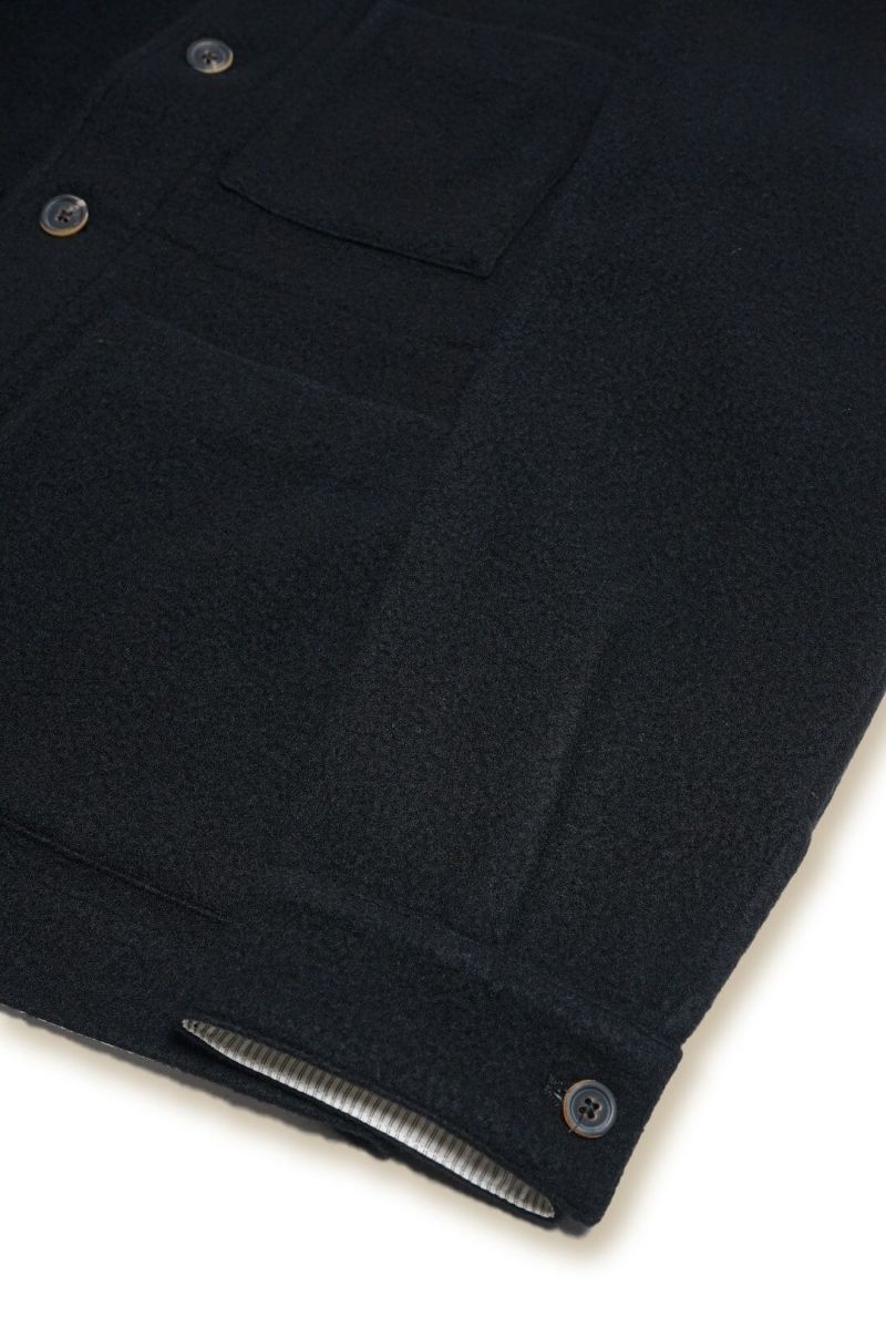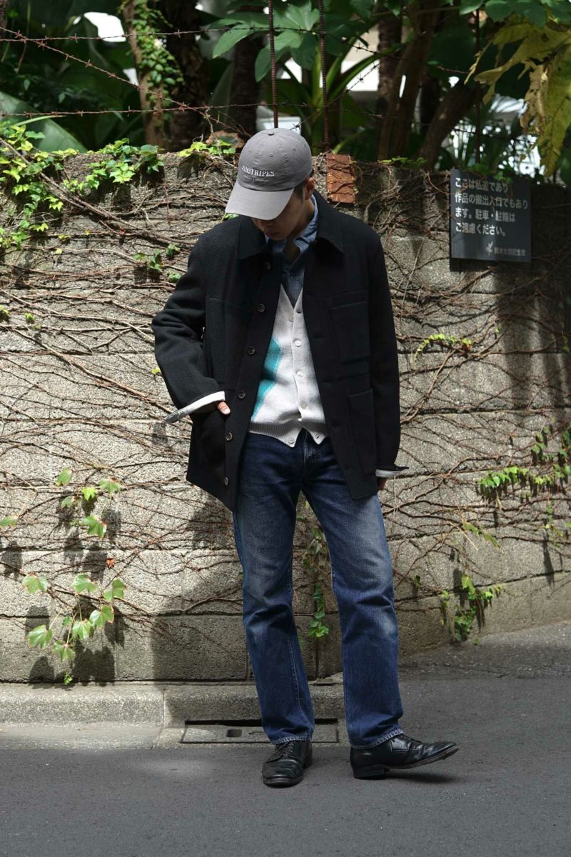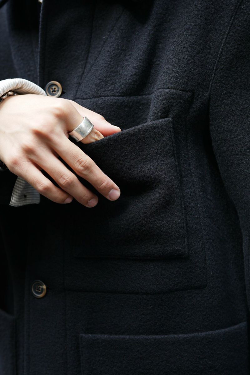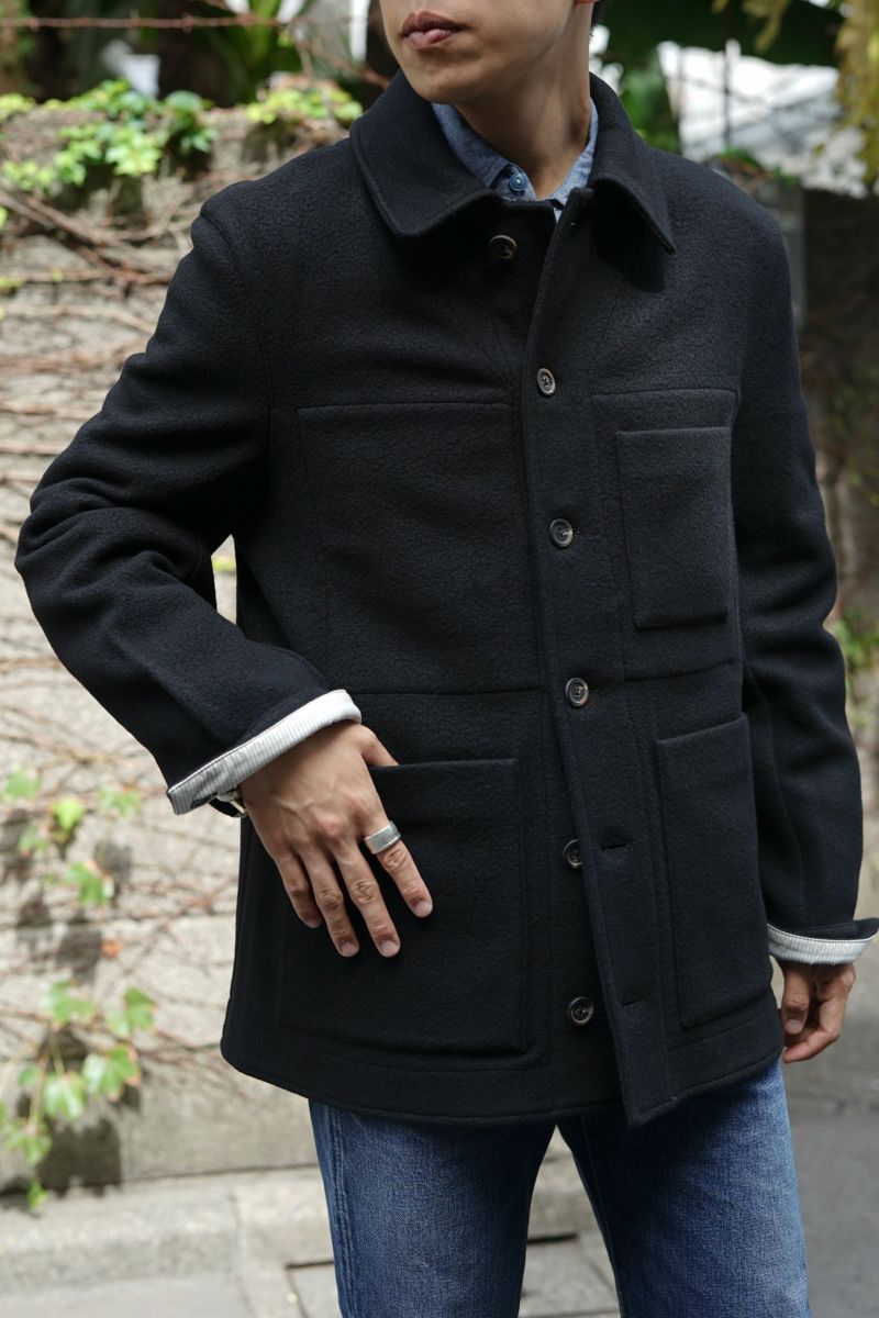 ワークジャケットをベースとしたforme d'expressionの1着。デザイナーの得意とするドレーピングのテクニック、洗練された素材使いによって、クラシックな洋服がベースにありながらも、スタイリッシュかつモダンな印象に仕上げられています。