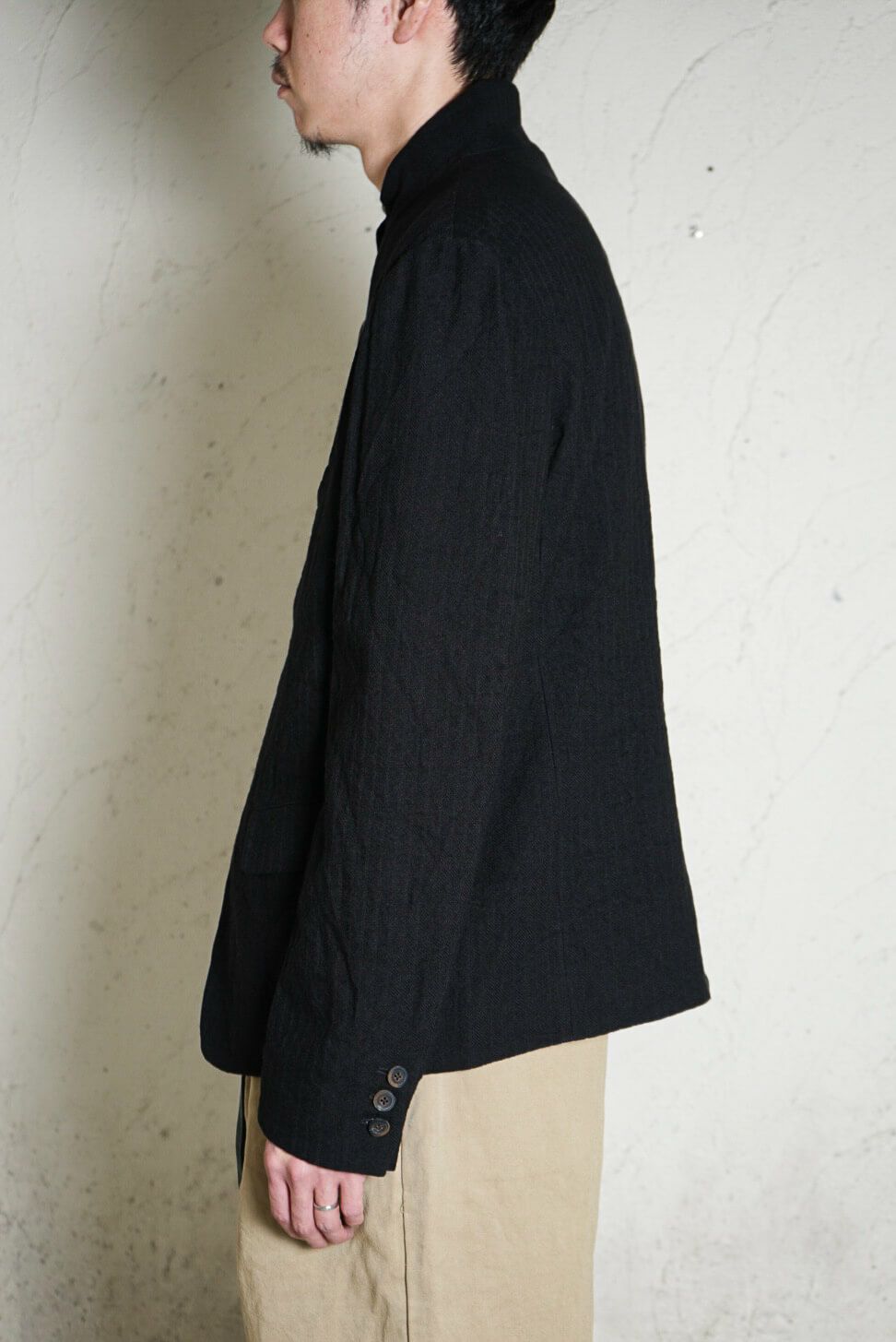 デザイナーの得意とするドレーピングのテクニック、洗練された素材使いによって、クラシックな洋服がベースにありながらも、スタイリッシュかつモダンな印象に仕上げられた一着。スタンドカラーでもラペルカラーでも着用できます。素材にはストライプ状に織柄が入るコットンウールのツイル生地を使用。同素材のトラウザーズとセットアップでの着用もおすすめです。