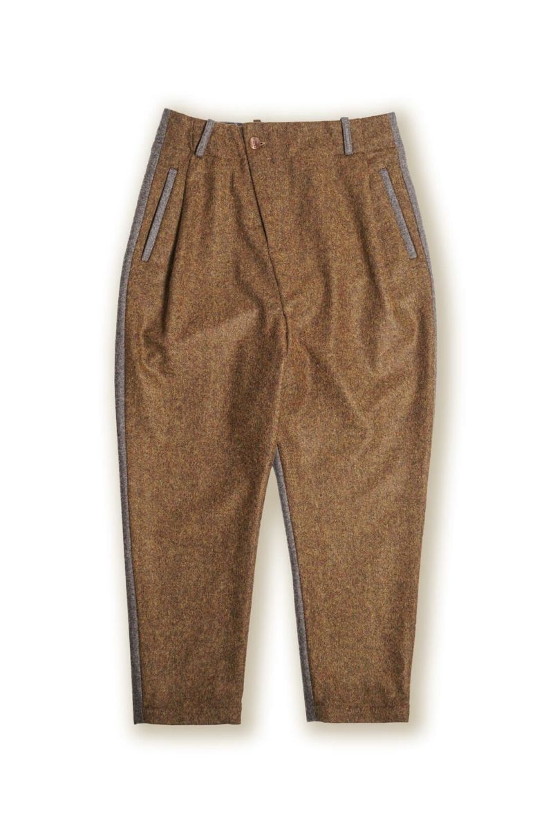 アシンメトリーになったフロントのデザインと深い股上からのテーパードシルエットが特徴的な1タックトラウザーズ。素材はしっかりとした厚みのあるバイエルンで織られたローデンウールをコンビネーションで使用しています。