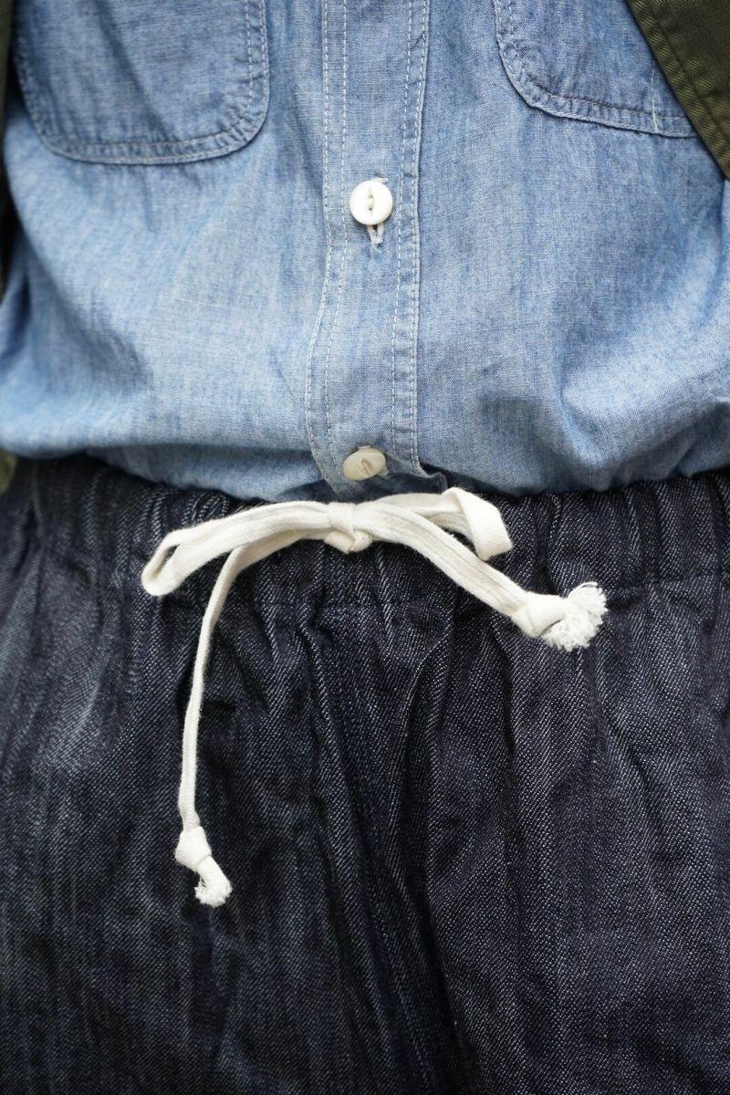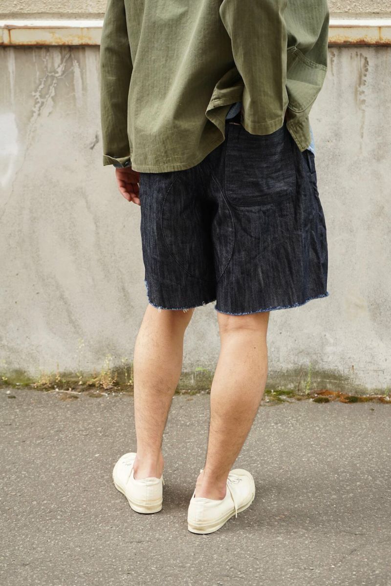 古き良きアメリカンワークウェアの雰囲気を感じさせるトリプルステッチを用いたコレクションより登場したデニム素材のイージーショーツです。カットオフの裾やヒップ部分の当て布も特徴的なデイテール。穿き込んだ後のエイジングも楽しみな一本です(ワンウォッシュ済み)。