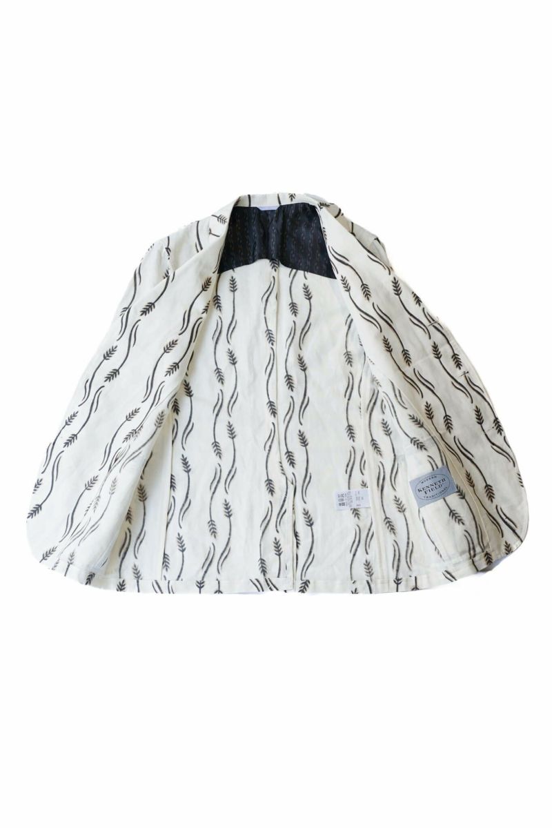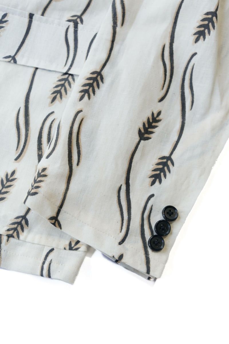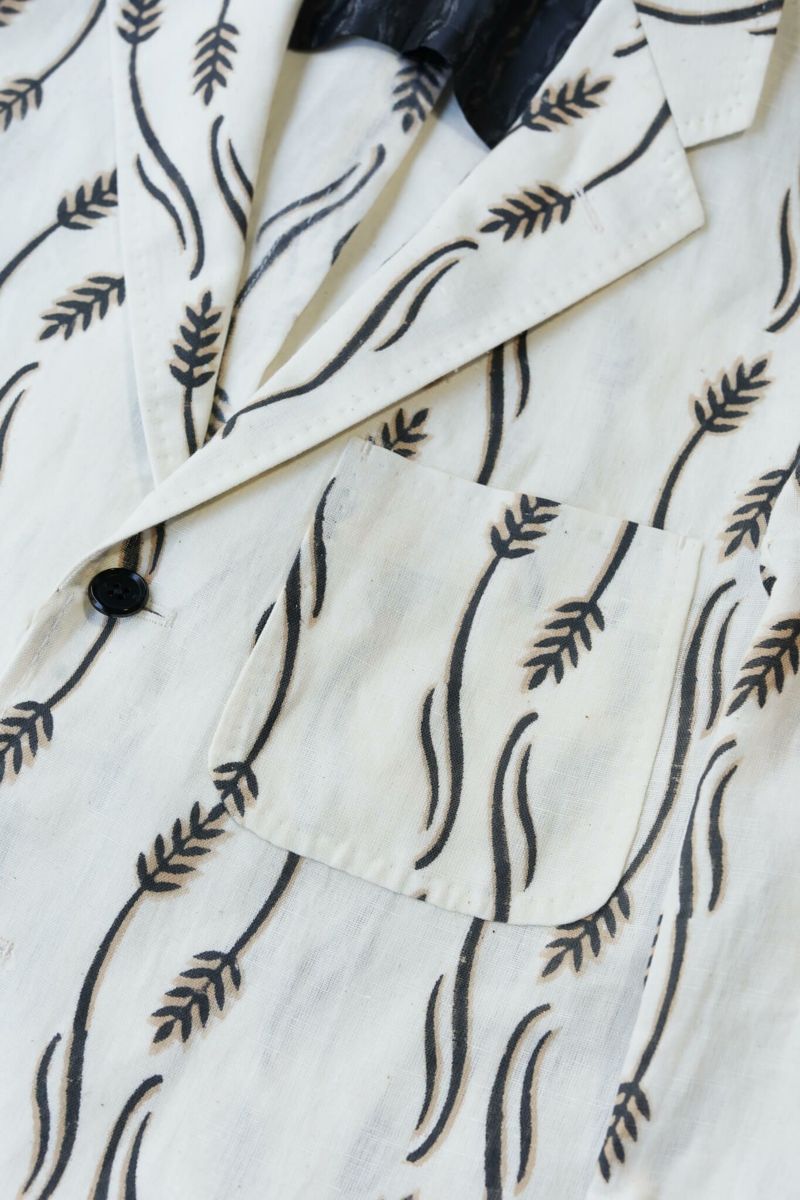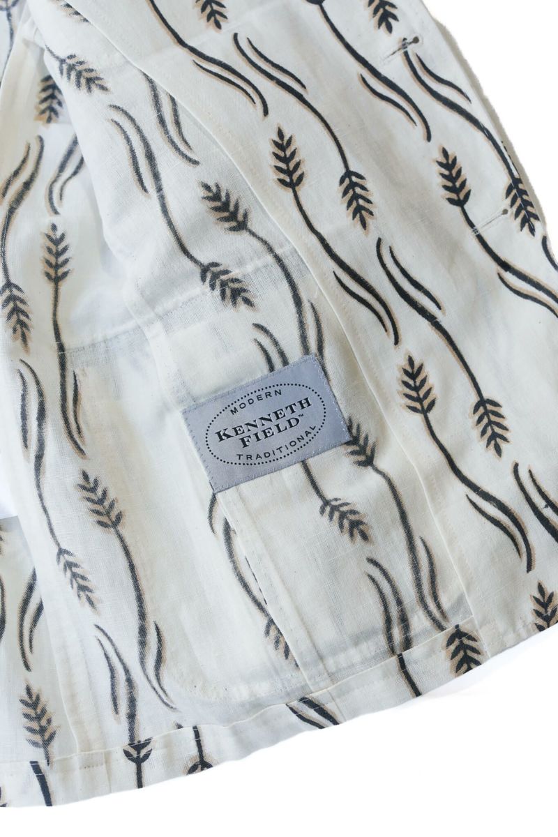 生地はインド・ラジャスタンにてハンドブロックプリントされたオリジナルファブリックを使用。スラブ感のあるコットンリネン生地にKENNETH FIELDブランドのモチーフがプリントされた清涼感のある生地です。