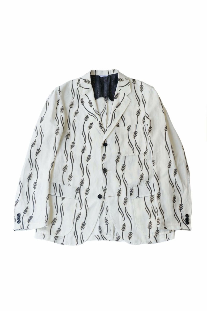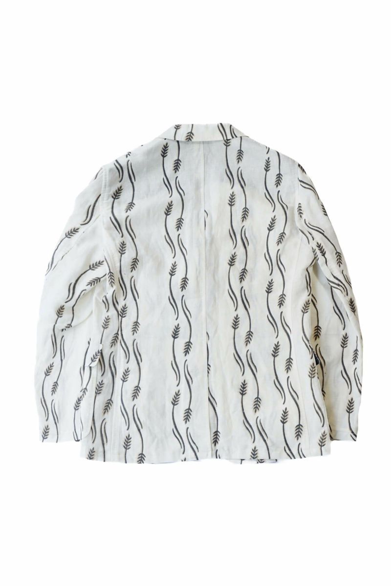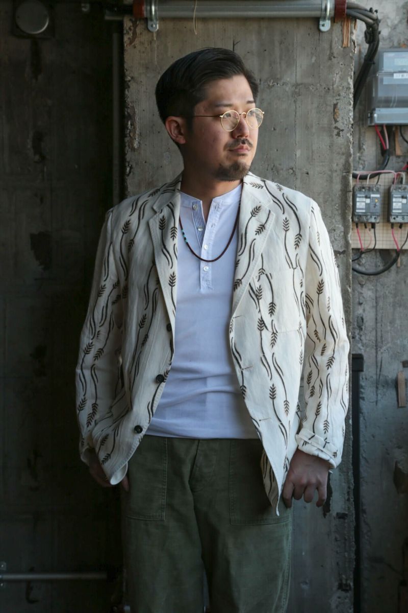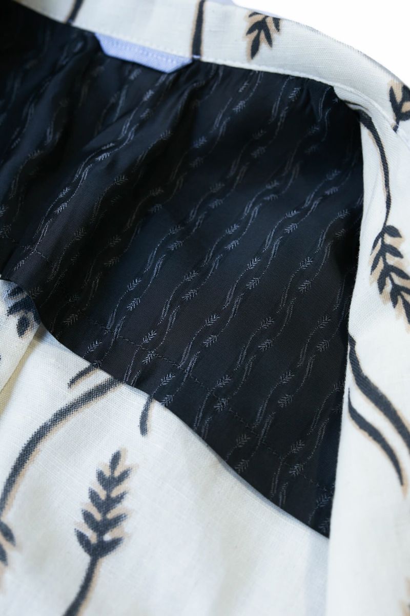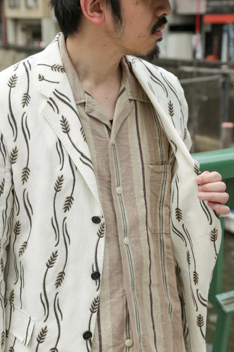 生地はインド・ラジャスタンにてハンドブロックプリントされたオリジナルファブリックを使用。スラブ感のあるコットンリネン生地にKENNETH FIELDブランドのモチーフがプリントされた清涼感のある生地です。
