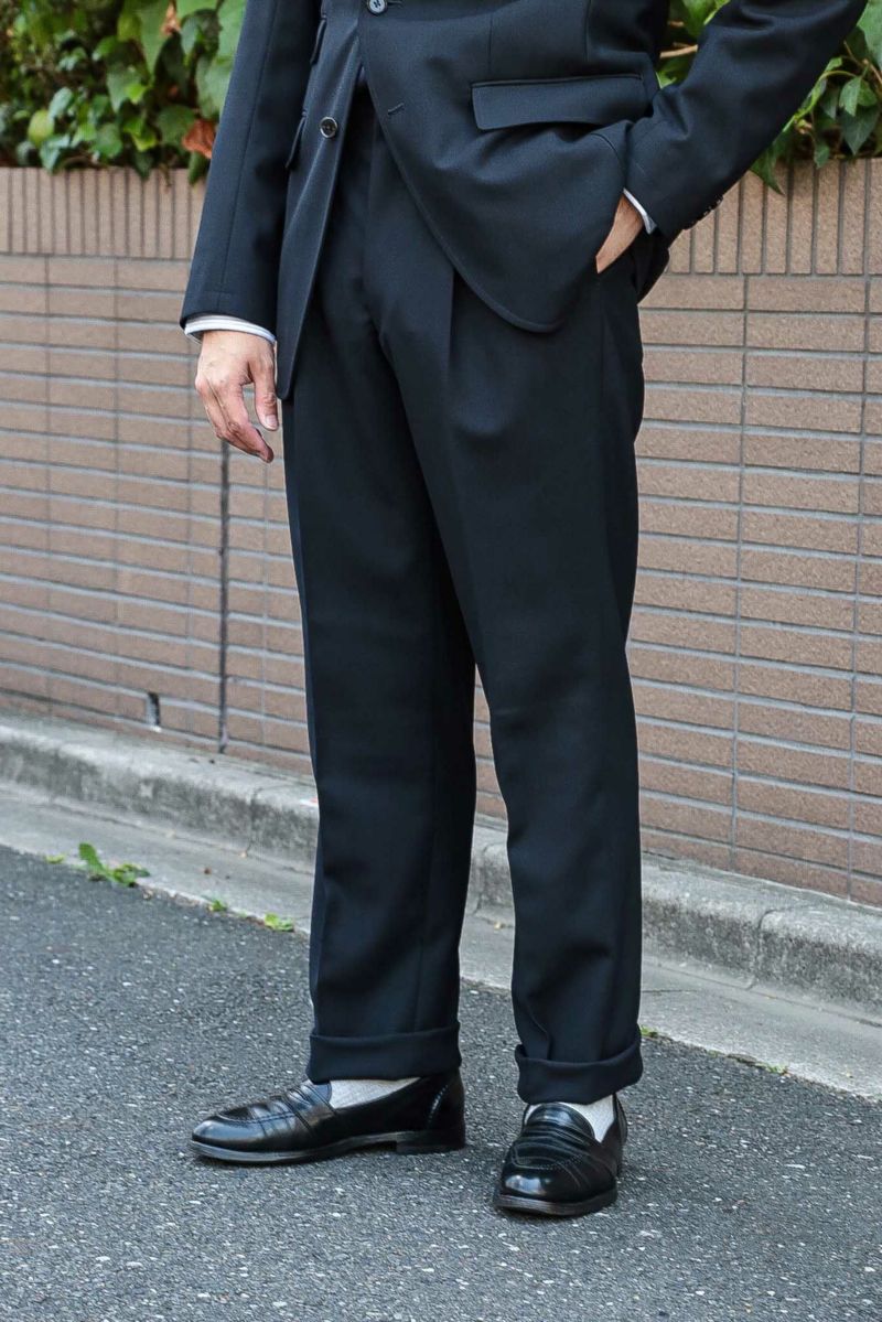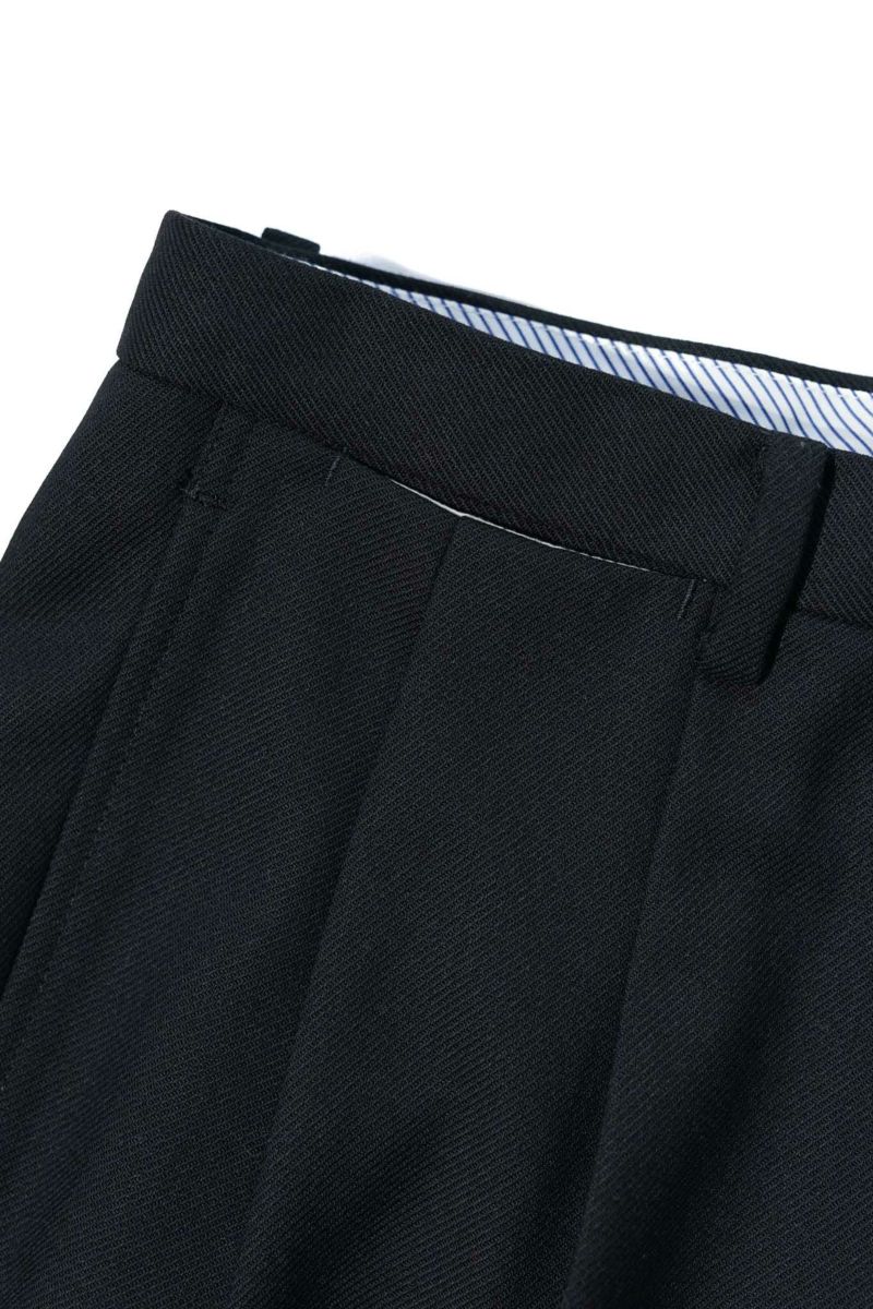 フロントに2タック入れた、やや直線的なシルエットのトラウザーは腰回りにゆとりがあり、裾に向けてテーパードになっています。