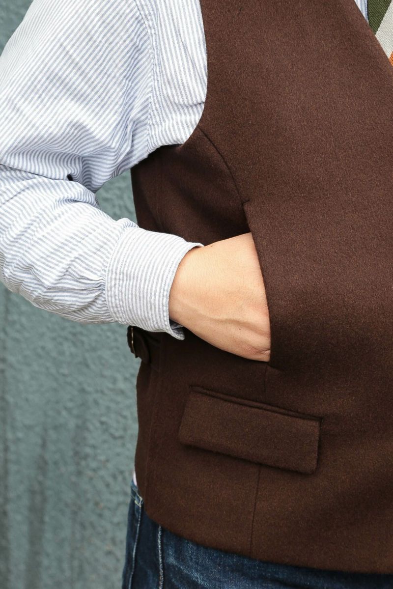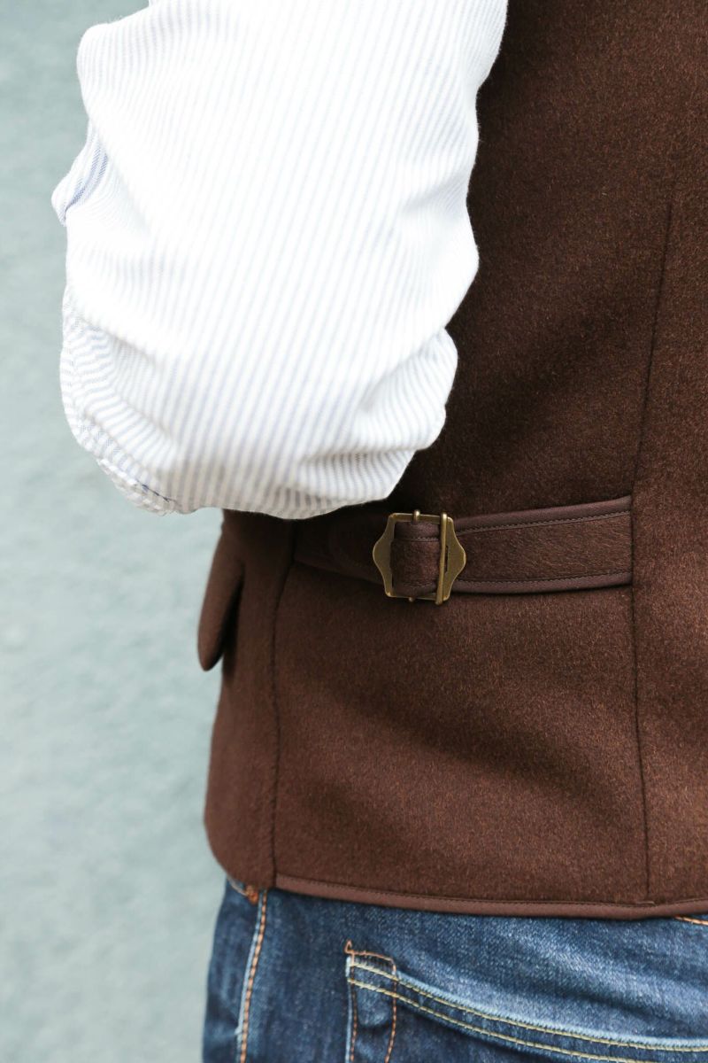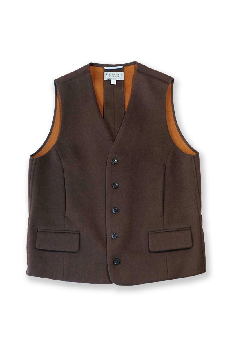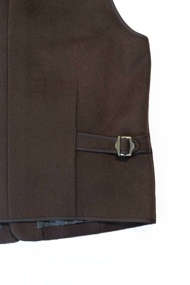 KENNETH FIELD 25AWのテーマ “Lodge(ロッジ)” を象徴するブラウンカラーをセレクト。ドレスとカジュアルの架け橋しとなるベストです。背面のバックルは通常ひとつのところを、ハンティングベストの要素を取り入れた二つのバックル仕様に。ウエスト調整だけでなく、デザインとしての存在感も際立ちます。フラップ付きポケットに加えシームポケットも完備した、KENNETH FIELDらしい特別感のあるディテールです。裏地には鮮やかなオレンジを配し、オリジナルのリーフ柄をあしらったキュプラを使用しています。