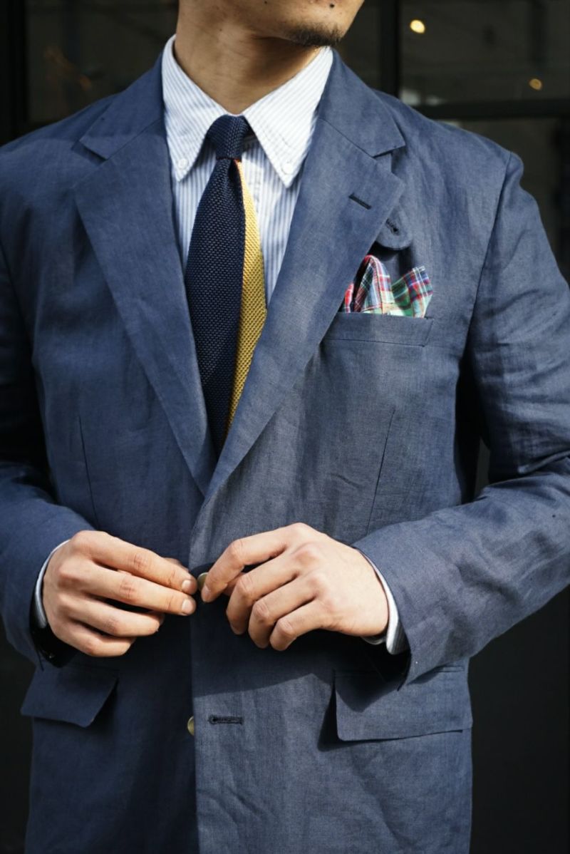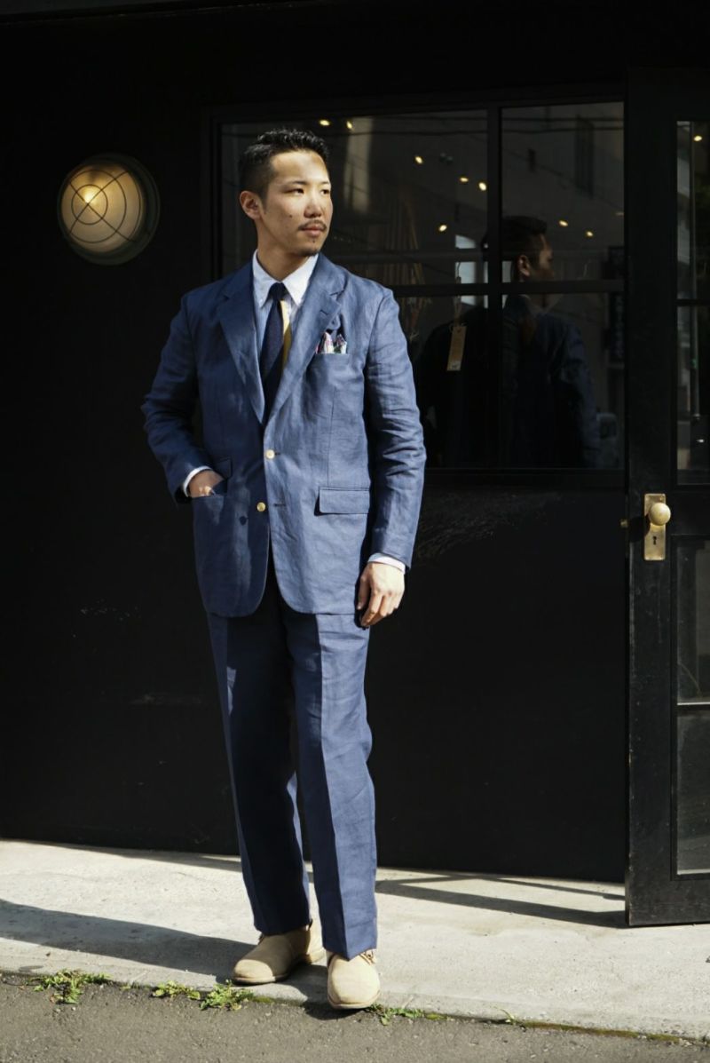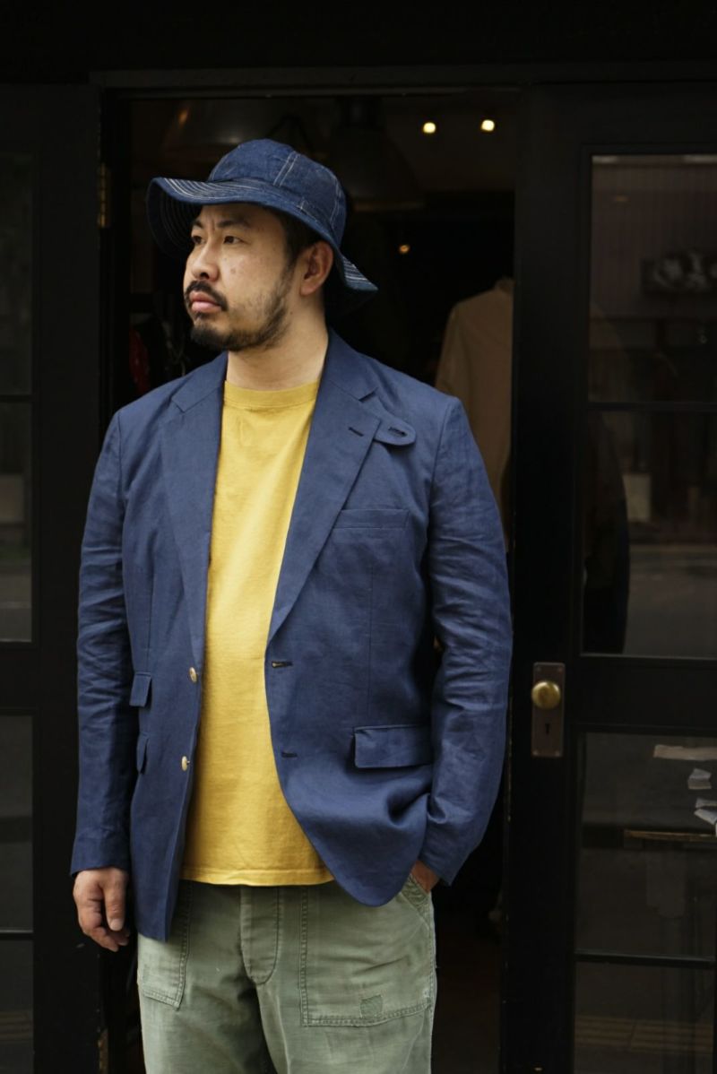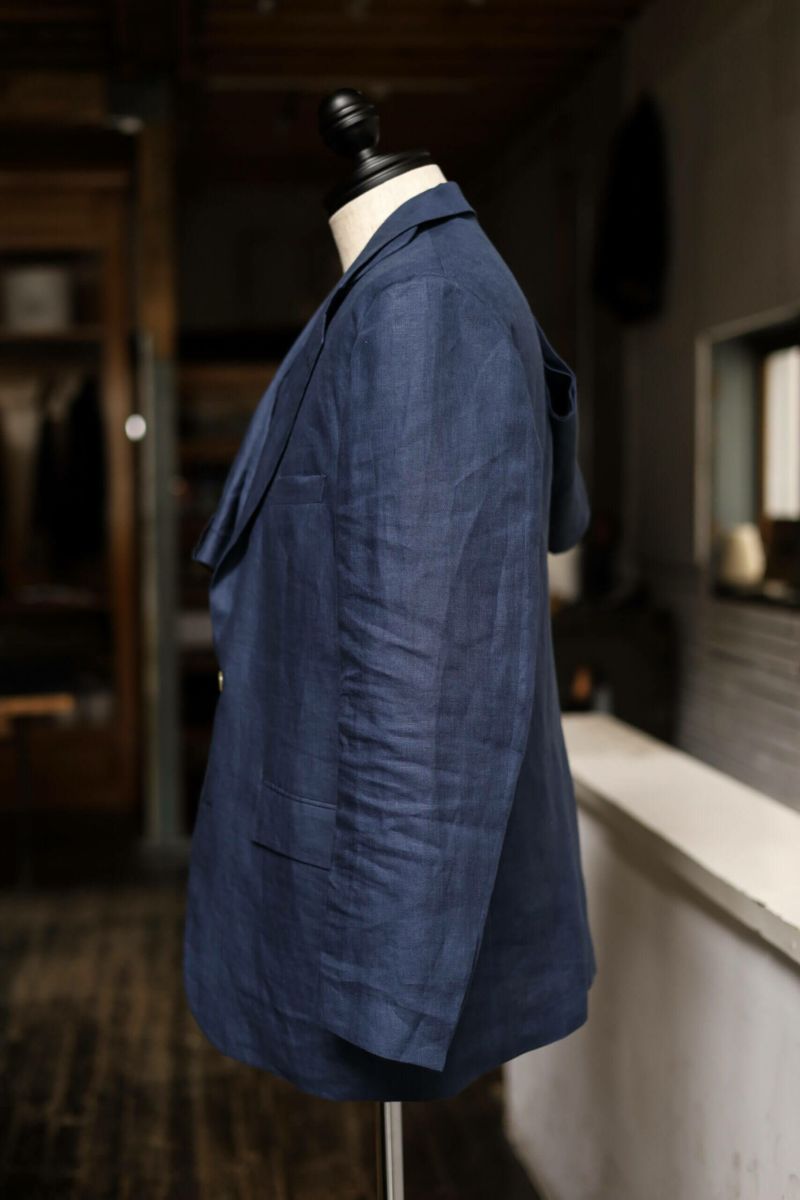 KENNETH FIELD(ケネスフィールド) アイリッシュリネンギルドに加入している名門、SPENCE BRYSON(スペンスブライソン)社のアイリッシュリネンを使用したジャケット。2B UNCON??は80年代のスポーツコートを参考にしたもので、ワイドなラペルに深めのVゾーン、ウエストの絞りは少なく直線的な裾部分、背部にはセンターベントのカットが入っています。肩パッドを排し、袖や背中のライニングを極力にまで無くした仕様ですので、夏でもリラックスして着用することできます。 <素材> 表地 : LINEN 100% 裏地 : CUPRO 100% <生産国> MADE IN JAPAN 商品についてのブログはこちら KENNETH FIELD / 2B UNCON II IRISH LINEN PRICE : ¥88,000(税込み)
