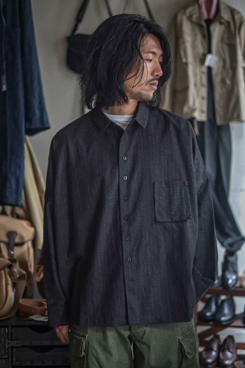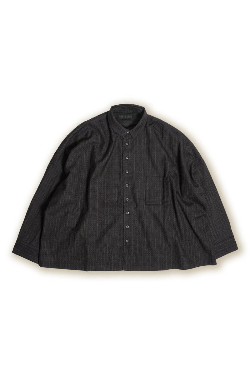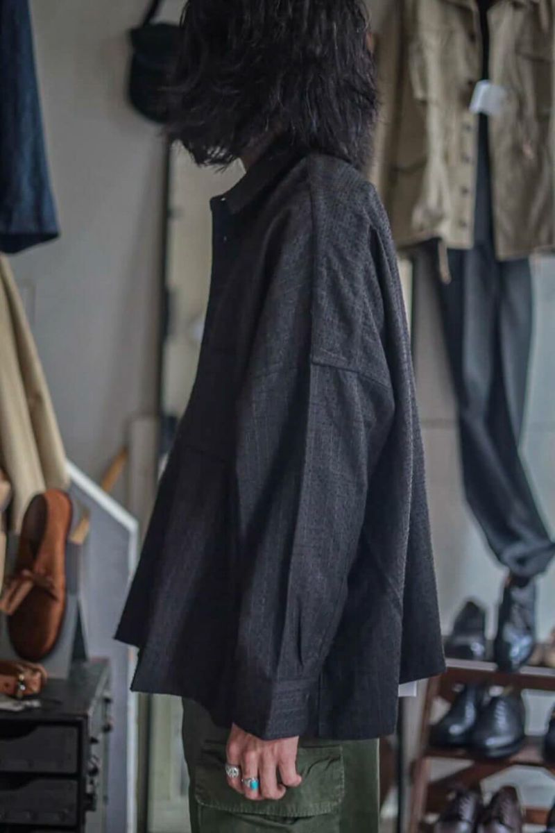 小ぶりな襟に、肩まわりにゆとりを持たせ、身幅は大胆に大きくとったボックスシルエットが特徴的なシャツ。デザイン性がありながらも落ち着いた佇まいです。生地はSUPER 100’Sのフォーマル素材を強めの加工でアレンジした物。陰影の強い表情とグレーともブラウンとも取れるニュアンスカラーが特徴です。