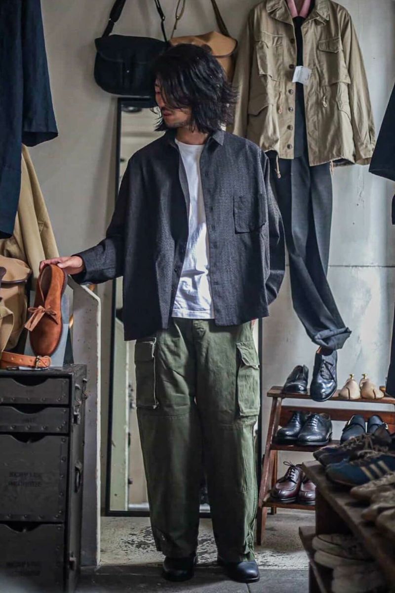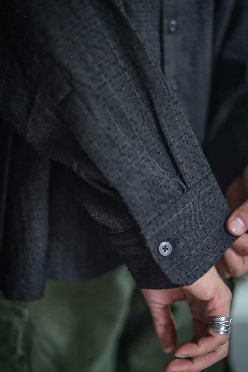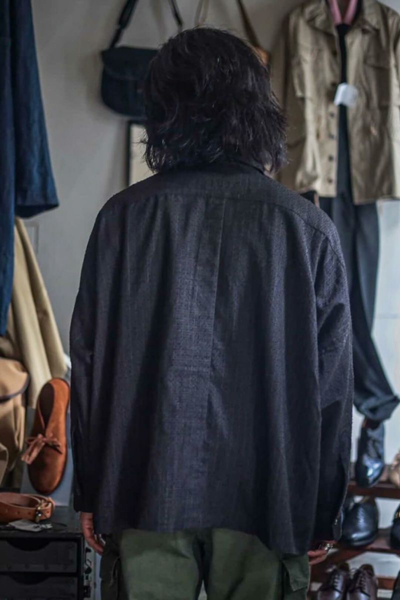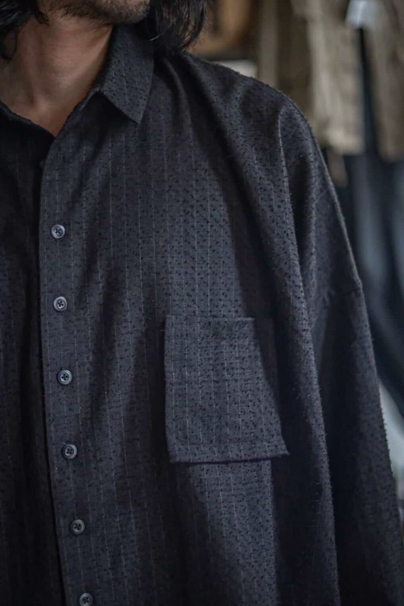 小ぶりな襟に、肩まわりにゆとりを持たせ、身幅は大胆に大きくとったボックスシルエットが特徴的なシャツ。デザイン性がありながらも落ち着いた佇まいです。生地はSUPER 100’Sのフォーマル素材を強めの加工でアレンジした物。陰影の強い表情とグレーともブラウンとも取れるニュアンスカラーが特徴です。