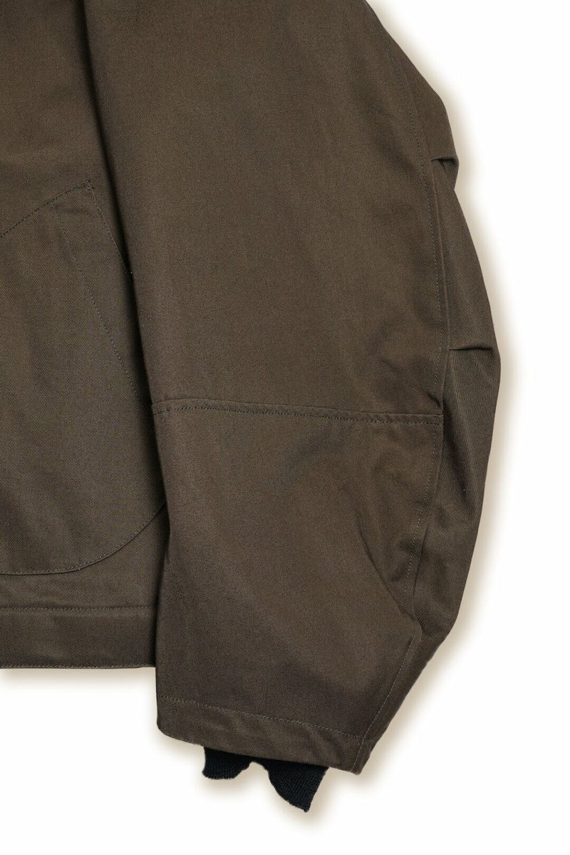 沢山のギャザーが入った背面と立体的に裁断されたアームが目を惹くボリュームのあるブルゾン。アメリカ軍のヴィンテージデッキジャケットから着想を得ています。素材は、コンパクト紡績のコームドコットンを織り上げたチノクロス。高密度で肌理の美しいチノは洗っても引き締まった表情を保ちます。
