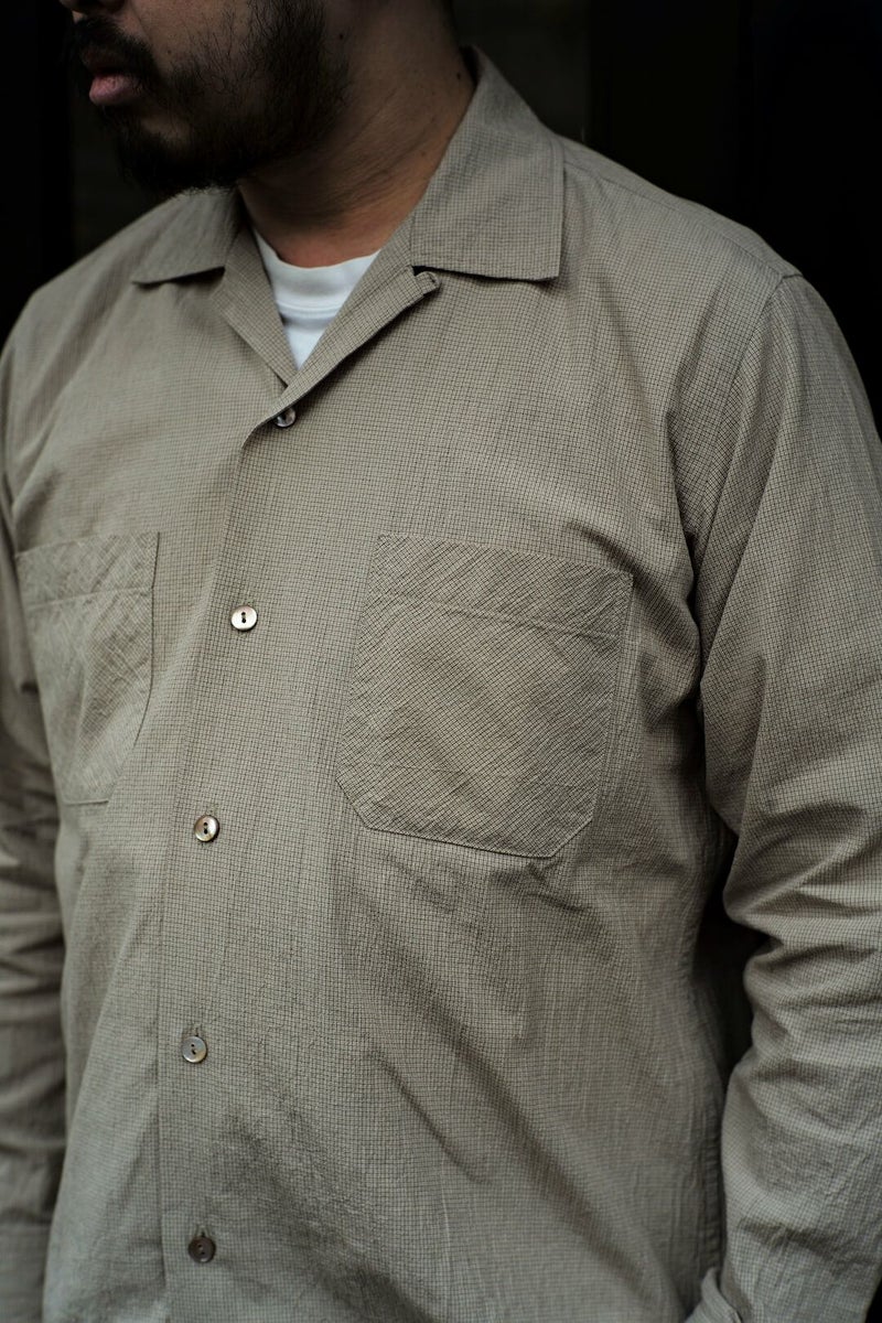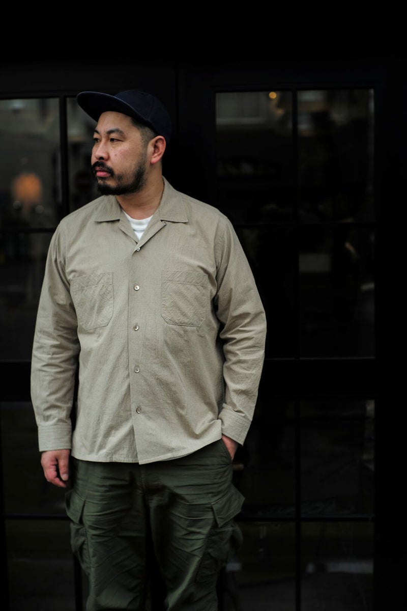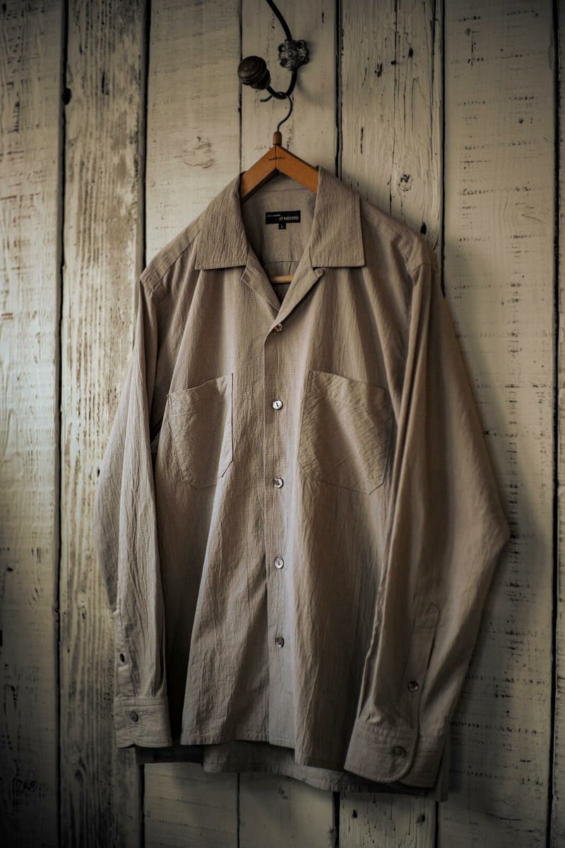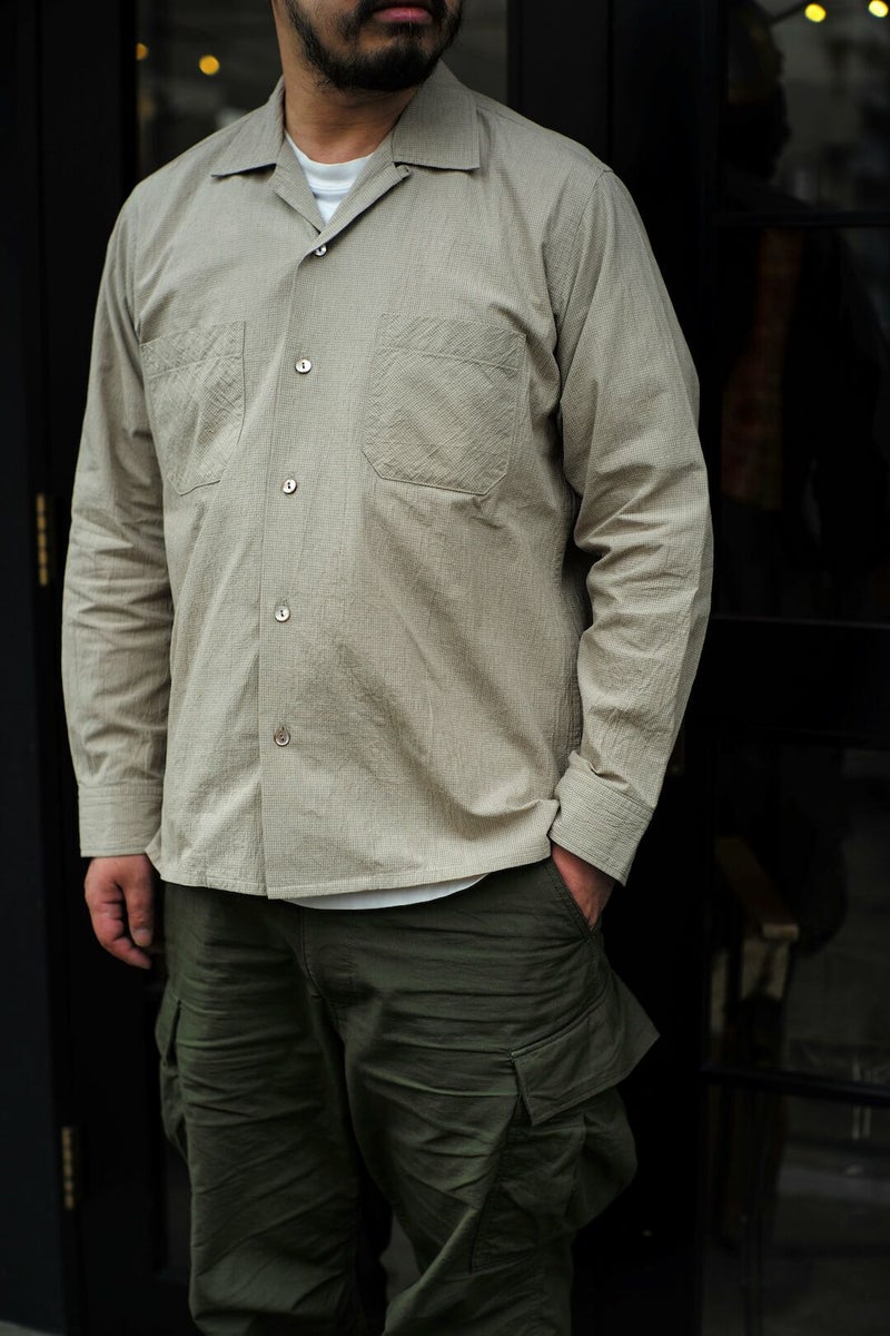 カーキでもないナチュラルでもない、かれたベージュの色合いに男心くすぐられる一枚。 よく目を凝らして見ると細かいチェックの柄になっているのもグッと惹かれるポイントです。 洗いがかけられたオーガニックコットンの生地感は、シアサッカーの質感にも似た素材感です。 シャリっとした涼感のある生地。 開放感のある開襟シャツにこの生地は、気温の上昇とともに着用頻度も上がる事でしょう。 かつて悪魔の酒として多くの作家や文化人を虜にした本物のアブサンのように「袖を通した人を虜にする着心地」を追求した"ABSHINTH SHIRT"ー 適度なゆとりを持たせた絶妙なフィット感のオープンカラーシャツで、MOJITO(モヒート)を代表するアイテムの一つです。 生地 : COTTON 100% MADE IN JAPAN MOJITO / ABSHINTH SHIRTS ORGANIC WASHER CHECK Price ¥30,800-(税込)