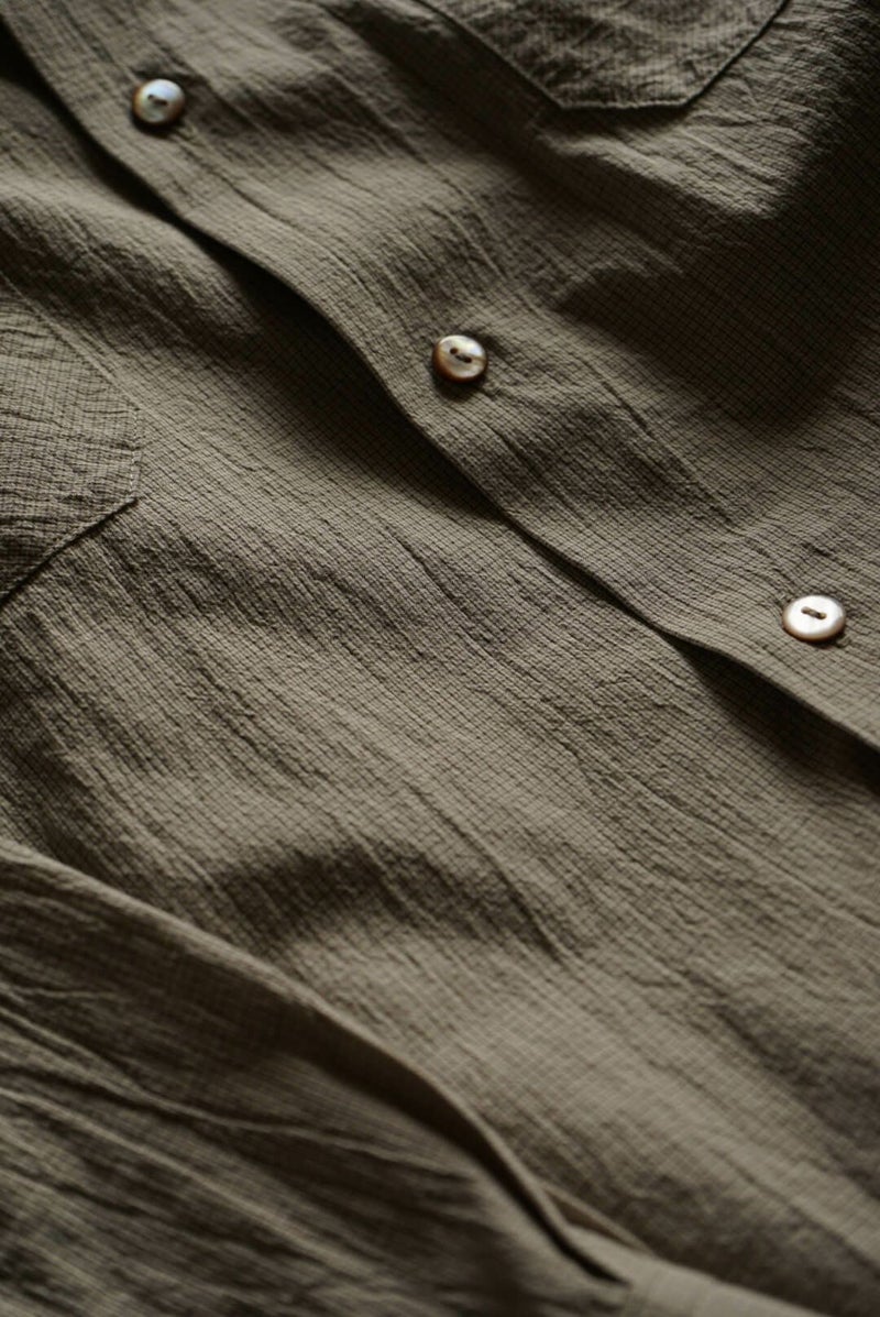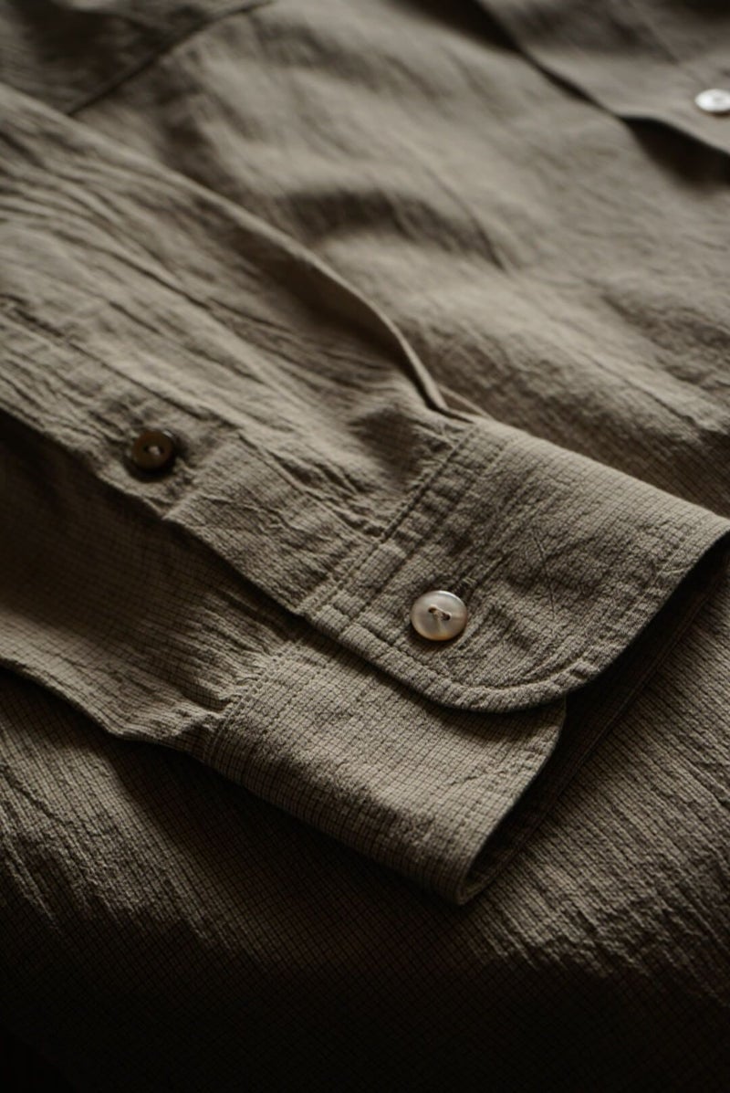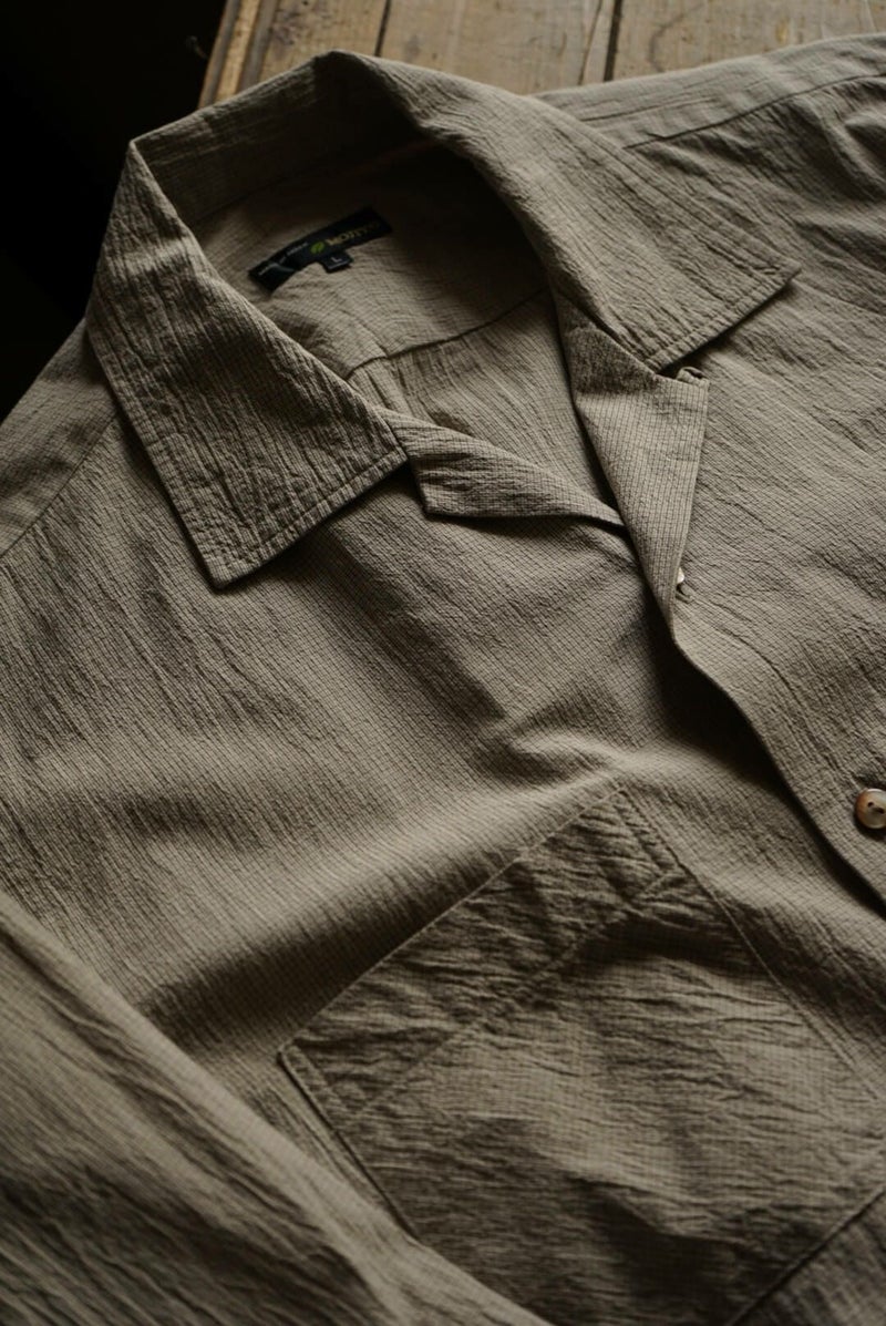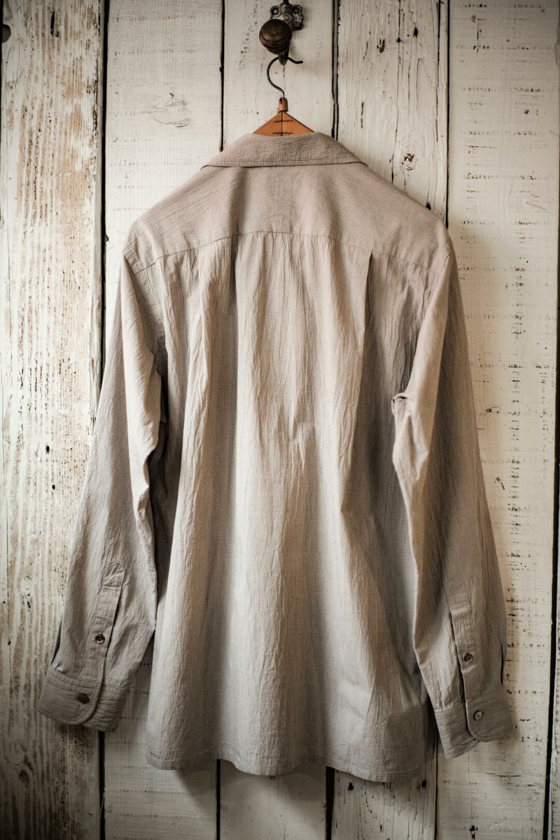 カーキでもないナチュラルでもない、かれたベージュの色合いに男心くすぐられる一枚。 よく目を凝らして見ると細かいチェックの柄になっているのもグッと惹かれるポイントです。 洗いがかけられたオーガニックコットンの生地感は、シアサッカーの質感にも似た素材感です。 シャリっとした涼感のある生地。 開放感のある開襟シャツにこの生地は、気温の上昇とともに着用頻度も上がる事でしょう。 かつて悪魔の酒として多くの作家や文化人を虜にした本物のアブサンのように「袖を通した人を虜にする着心地」を追求した"ABSHINTH SHIRT"ー 適度なゆとりを持たせた絶妙なフィット感のオープンカラーシャツで、MOJITO(モヒート)を代表するアイテムの一つです。 生地 : COTTON 100% MADE IN JAPAN MOJITO / ABSHINTH SHIRTS ORGANIC WASHER CHECK Price ¥30,800-(税込)