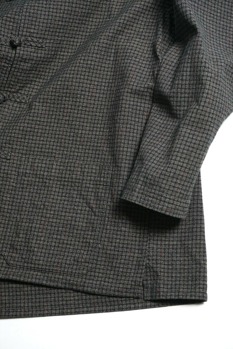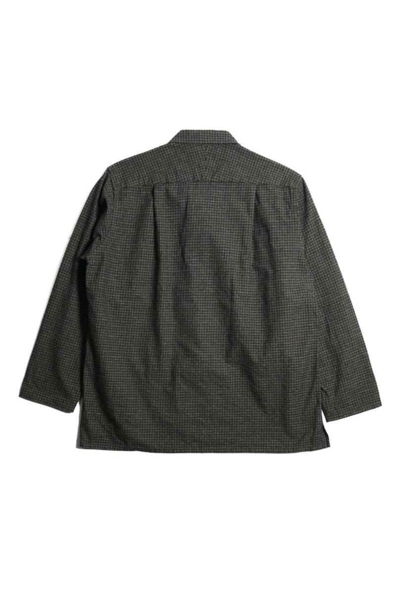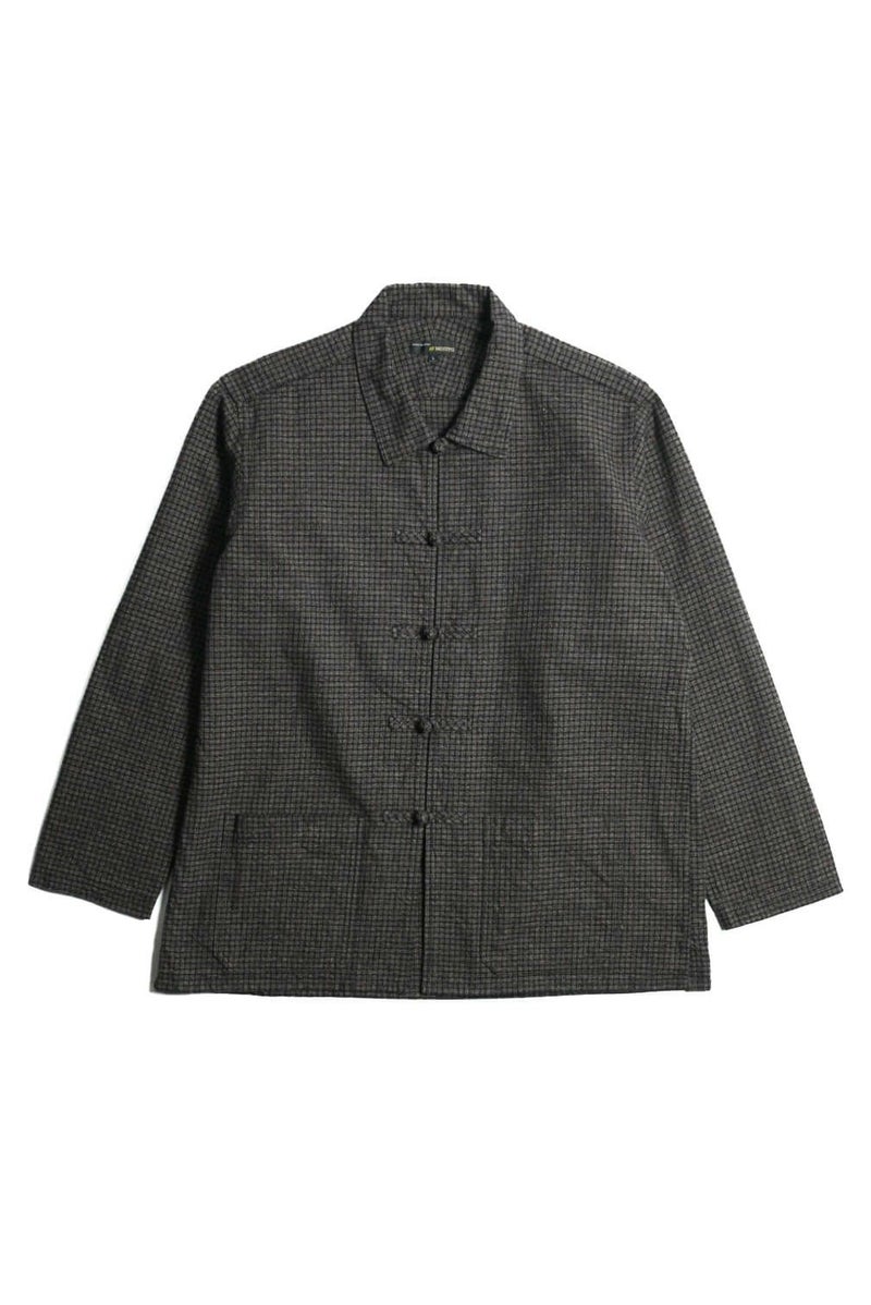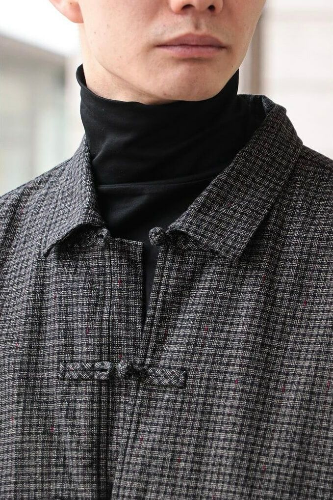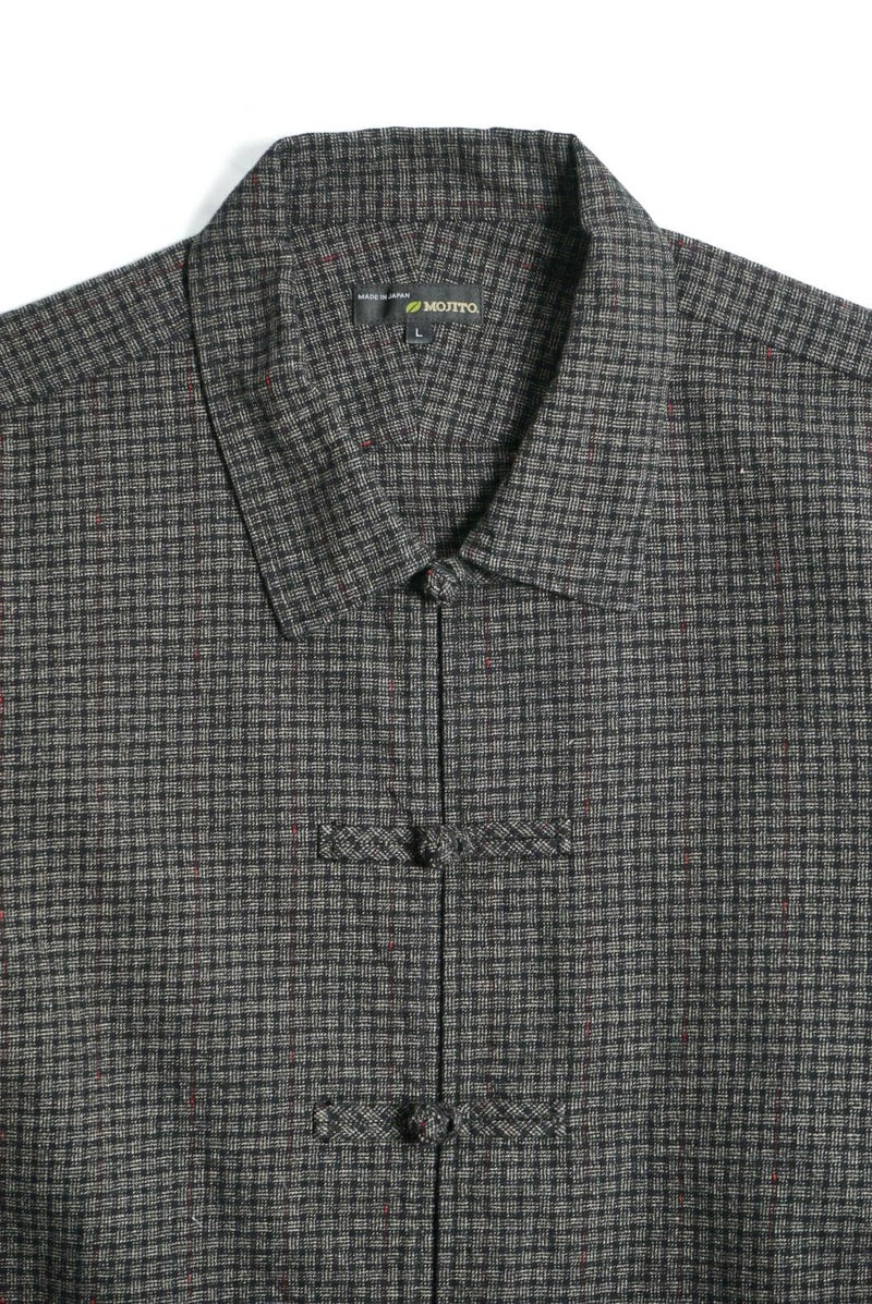 MOJITO(モヒート) ヘミングウェイが中国を訪れた際の写真をデザインソースされたアブサンシャツ。 生地は現存する明治大正~昭和初期に主流で使われてきた低速織機『ションヘル式織機』でゆっくりと織られたもの。 この織機は扱いがとても難しく、手間が掛かる一方、織る時に糸にかかるテンションが優しく、この織機ならではの柔らかい風合いの生地に仕上がります。 シャツとしての着方だけではなく羽織りものとしても重宝するシャツです。チャイナボタンの仕様も印象的で雰囲気のある仕上がりです。 <素材> コットン 98% / ナイロン 1% / ポリエステル 1% <生産国> MADE IN JAPAN MOJITO / ABSHINTH SHIRT_china(GREY CHECK) PRICE : ¥51,700(税込み)