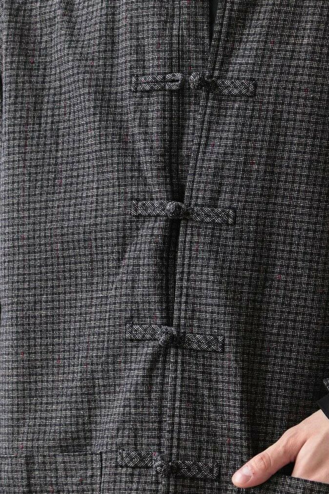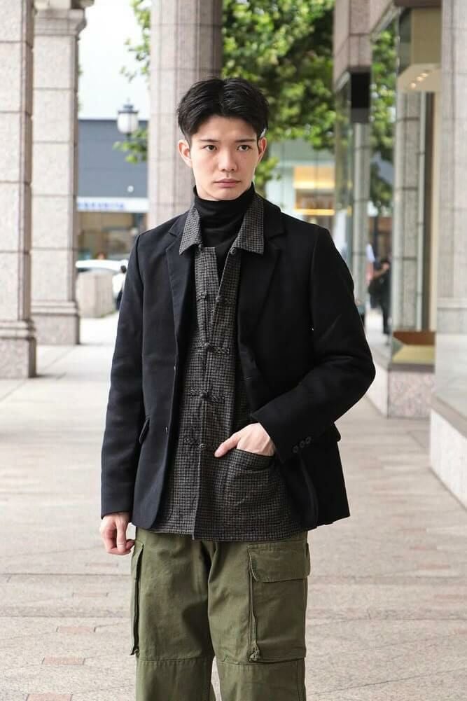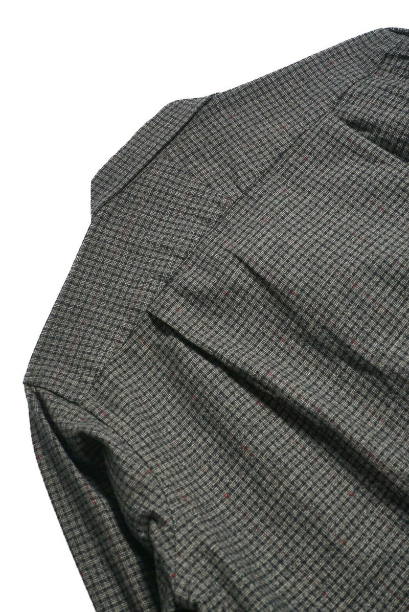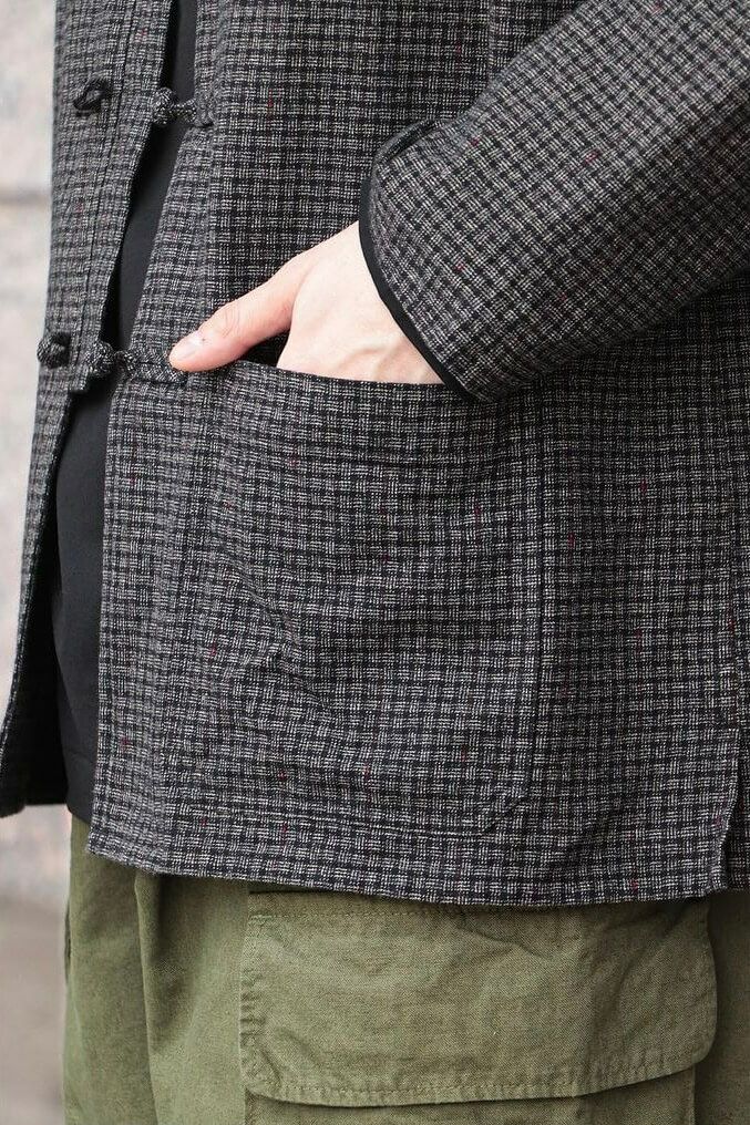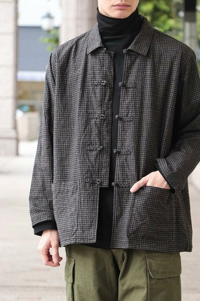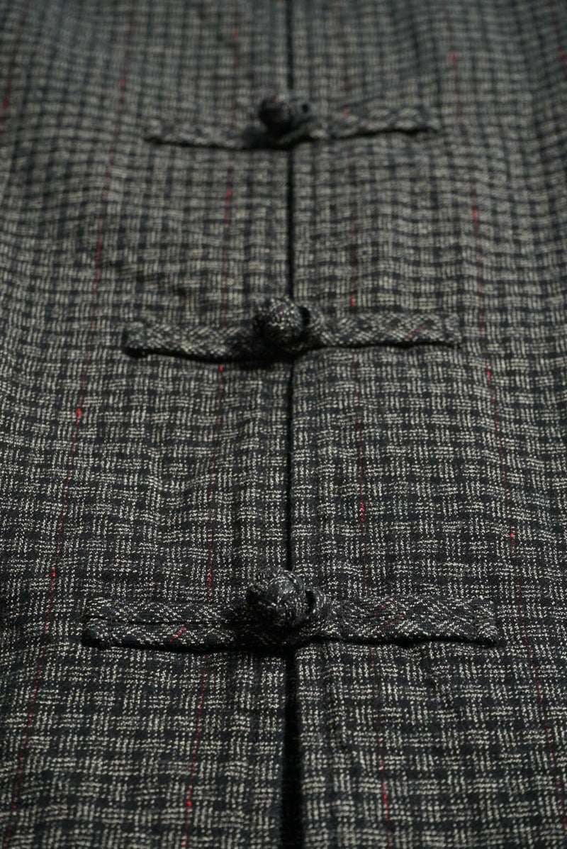 MOJITO(モヒート) ヘミングウェイが中国を訪れた際の写真をデザインソースされたアブサンシャツ。 生地は現存する明治大正~昭和初期に主流で使われてきた低速織機『ションヘル式織機』でゆっくりと織られたもの。 この織機は扱いがとても難しく、手間が掛かる一方、織る時に糸にかかるテンションが優しく、この織機ならではの柔らかい風合いの生地に仕上がります。 シャツとしての着方だけではなく羽織りものとしても重宝するシャツです。チャイナボタンの仕様も印象的で雰囲気のある仕上がりです。 <素材> コットン 98% / ナイロン 1% / ポリエステル 1% <生産国> MADE IN JAPAN MOJITO / ABSHINTH SHIRT_china(GREY CHECK) PRICE : ¥51,700(税込み)